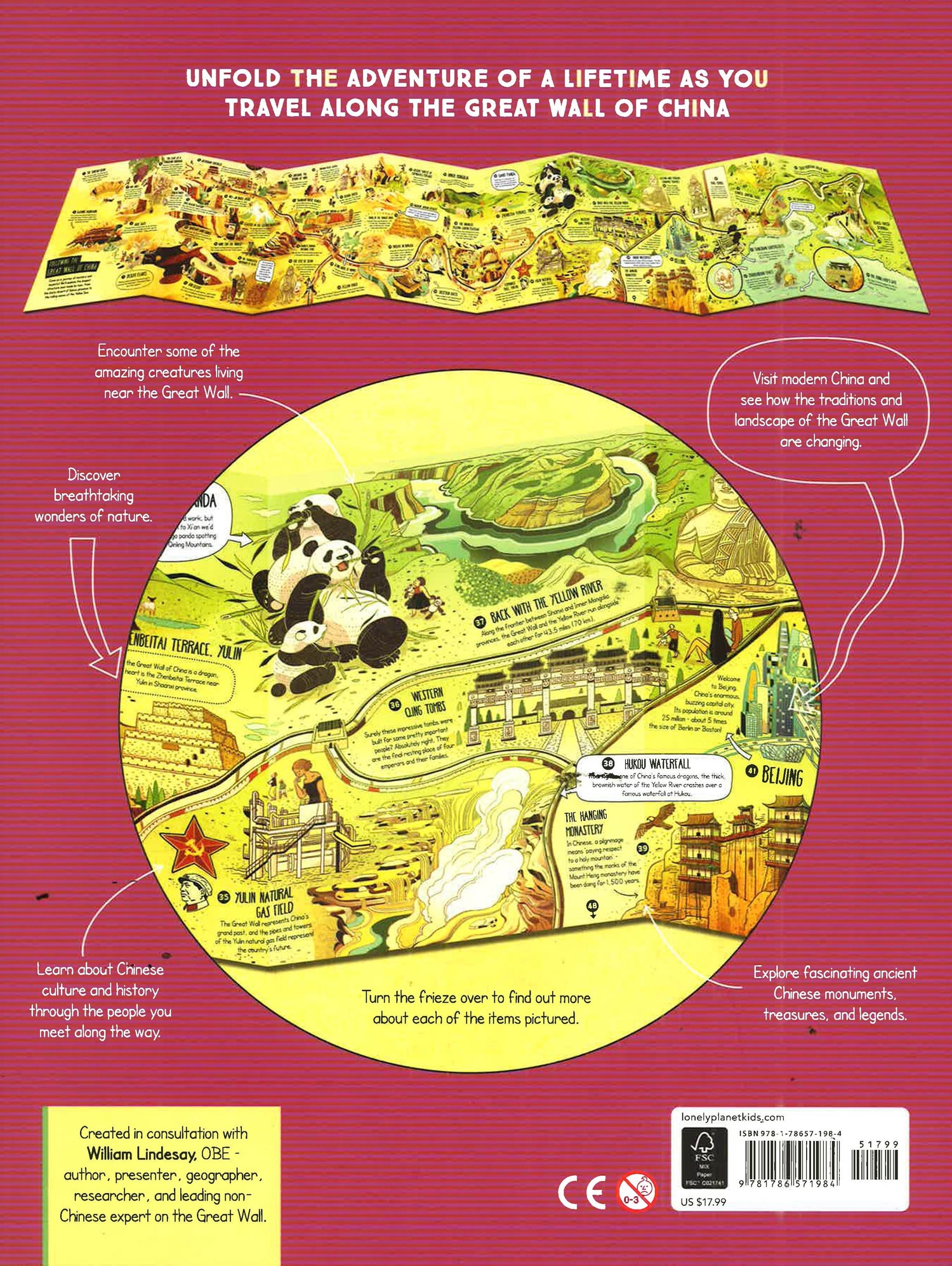 Unfold the adventure of a lifetime as you travel along the Great Wall of China with Lonely Planet Kids Unfolding Journeys - Following the Great Wall . This sensational fold-out frieze is more than six-feet long and can be removed and displayed. It features stunning illustrated detail on one side and incredible facts on the other. Get ready for an unforgettable journey across China. From the dusty desert of Gansu province to the rolling waves of the Yellow Sea, this amazing journey takes you past flaming mountains and ancient wonders. Watch out for mighty fortresses, giant pandas and the extraordinary Army of Terracotta Warriors. Along the way you'll discover breathtaking wonders of nature, visit modern China, and see how the traditions and landscape of the Great Wall are changing. You'll also encounter fascinating ancient Chinese monuments and amazing creatures living near the Great Wall. Part of our 'Unfolding Journeys' series. Also available: Unfolding Journeys - Rocky Mountain Explorer , Unfolding Journeys - Amazon Adventure, Unfolding Journeys - Secrets of the Nile. Collect them all! About Lonely Planet Kids: Come explore! Let's start an adventure. Lonely Planet Kids excites and educates children about the amazing world around them. Combining astonishing facts, quirky humor and eye-catching imagery, we ignite their curiosity and encourage them to discover more about our planet. Every book draws on our huge team of global experts to help share our continual fascination with what makes the world such a diverse and magnificent place - inspiring children at home and in school.