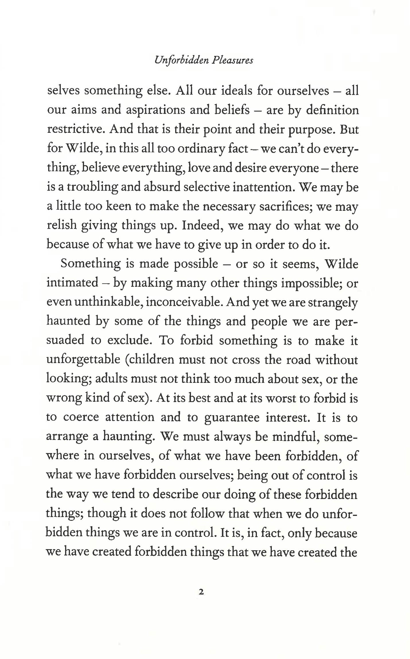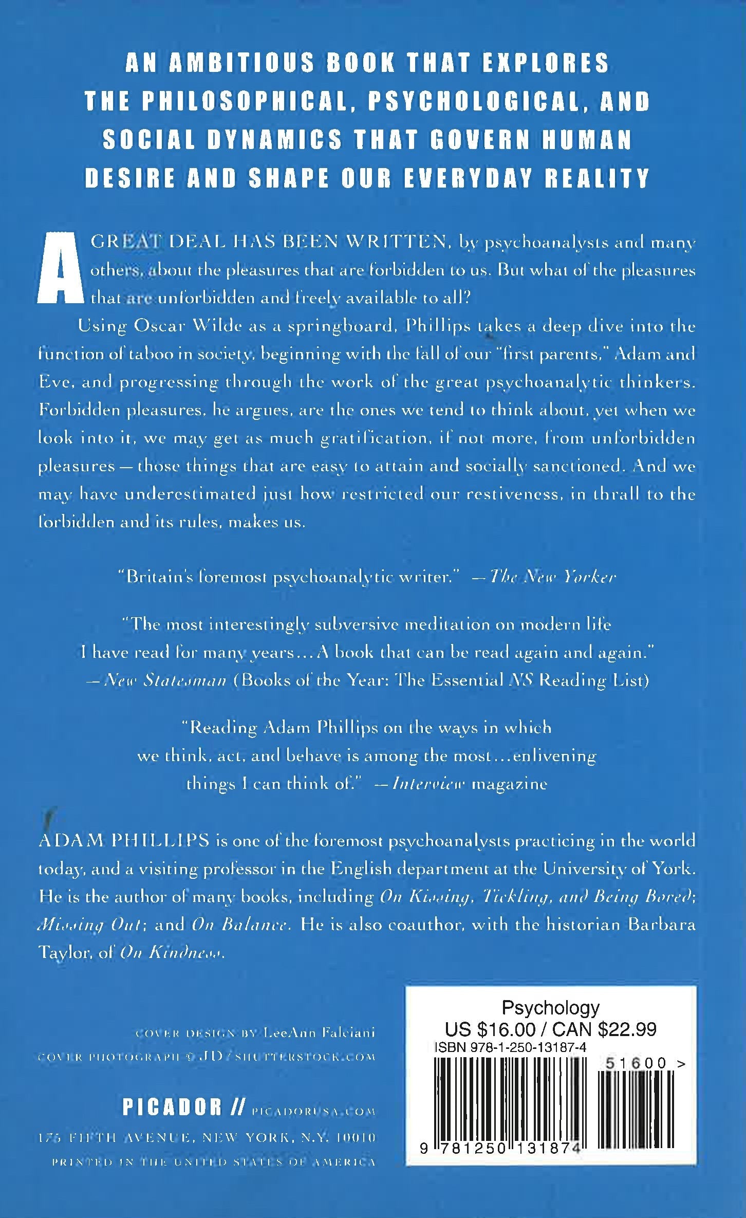 Using Oscar Wilde as a springboard, Phillips takes a deep dive into the function of taboo in society, beginning with the fall of our "first parents," Adam and Eve, and progressing through the work of the great psychoanalytic thinkers. Forbidden pleasures, he argues, are the ones we tend to think about, yet when we look into it, we may get as much gratification, if not more, from unforbidden pleasures--those things that are easy to attain and socially sanctioned. And we may have underestimated just how restricted our restiveness, in thrall to the forbidden and its rules, makes us.