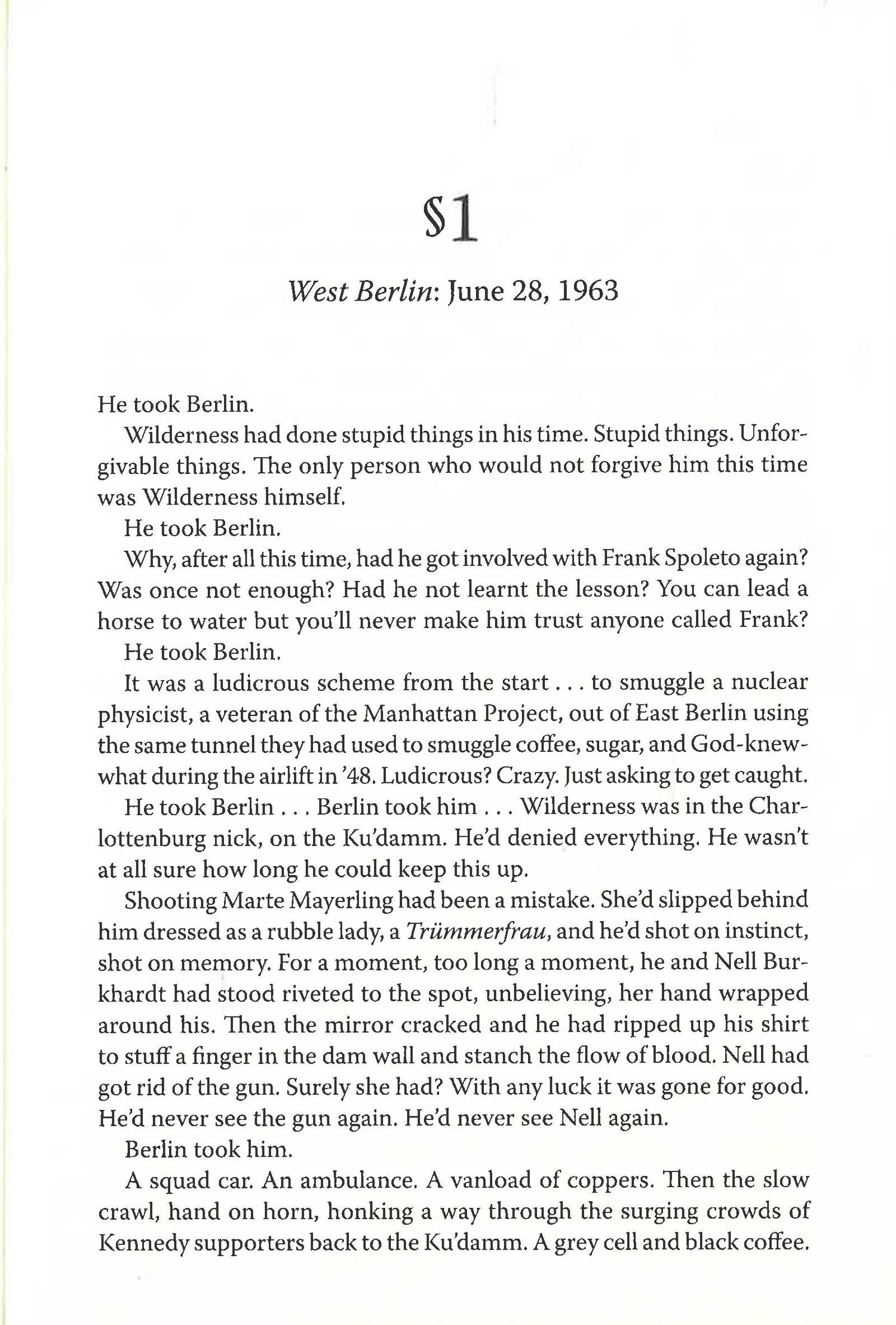 Berlin, 1963. East End-Londoner turned spy Joe Wilderness has had better days. He is sitting in a West Berlin jail, arrested for shooting someone he thought was about to kill him. His old boss, Lieutenant Burne-Jones of MI6, comes to Berlin to free him, but only under the condition that he rejoin British Intelligence. The knowledge that Wilderness gained of Berlin's underworld while working the black market just after World War II will prove useful to Queen and country now that the city has become the epicenter of the Cold War, dividing the world in two with its wall. On the other side of the Iron Curtain, another MI6 man, Geoffrey Masefield, is ruing the day he first agreed to be a spy. In the beginning, it had all seemed so simple, so glamorous: the international travel, the top secret files, the vodka, the women. . . . But now Masefield is stuck in Lubyanka, the KGB's Moscow prison, waiting for a lifeline from his former employer. Meanwhile, over in England, a Russian spy is pining for his homeland. Having lived as Bernard Forbes Campbell Alleyn for years and taken a wife and had two daughters under that alias, he's now been exposed as KGB Captain Leonid Liubimov. Arrested for treason and then for espionage, he is in prison at Wormwood Scrubs, London. The only ticket out for these two men is a spy exchange.