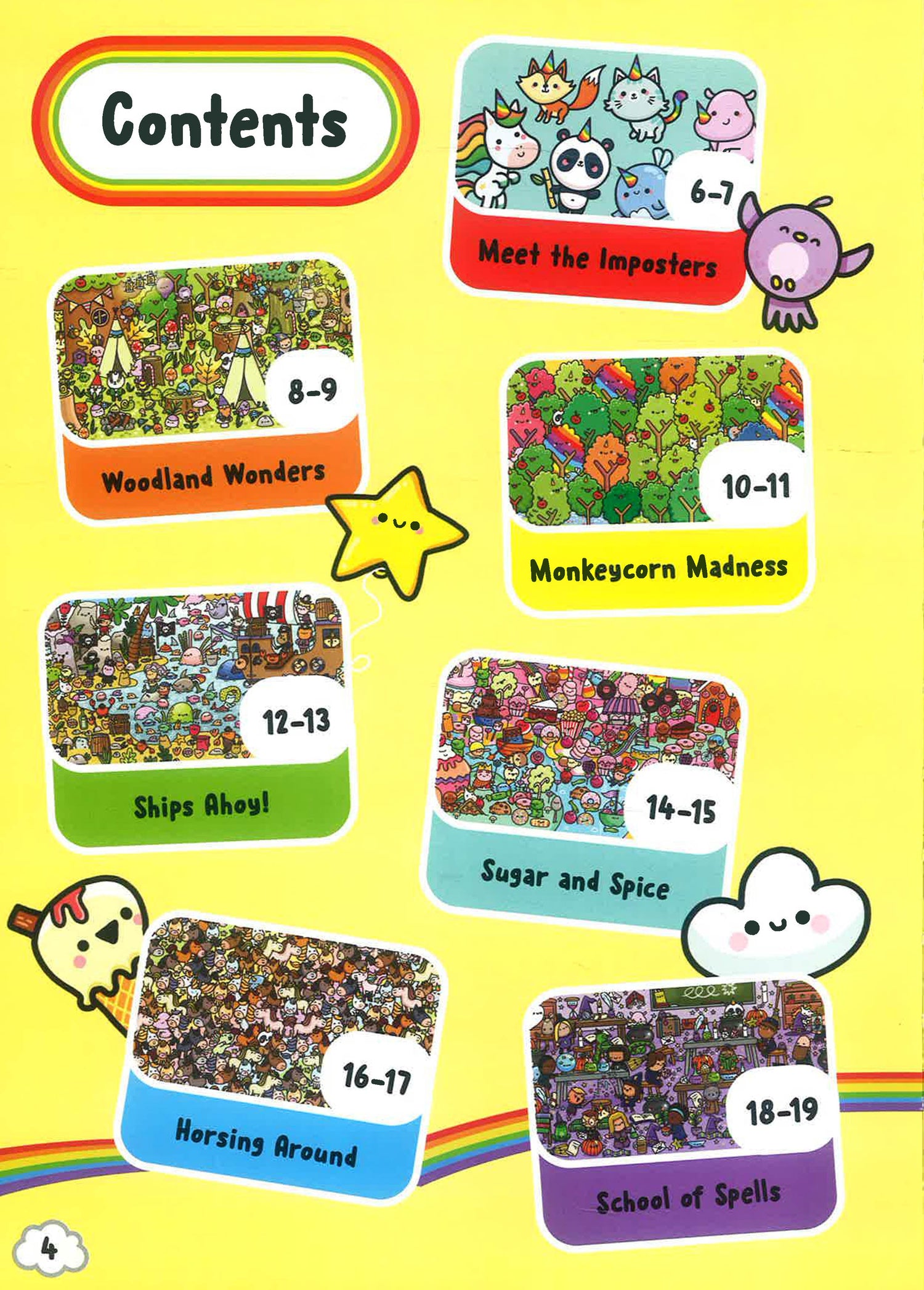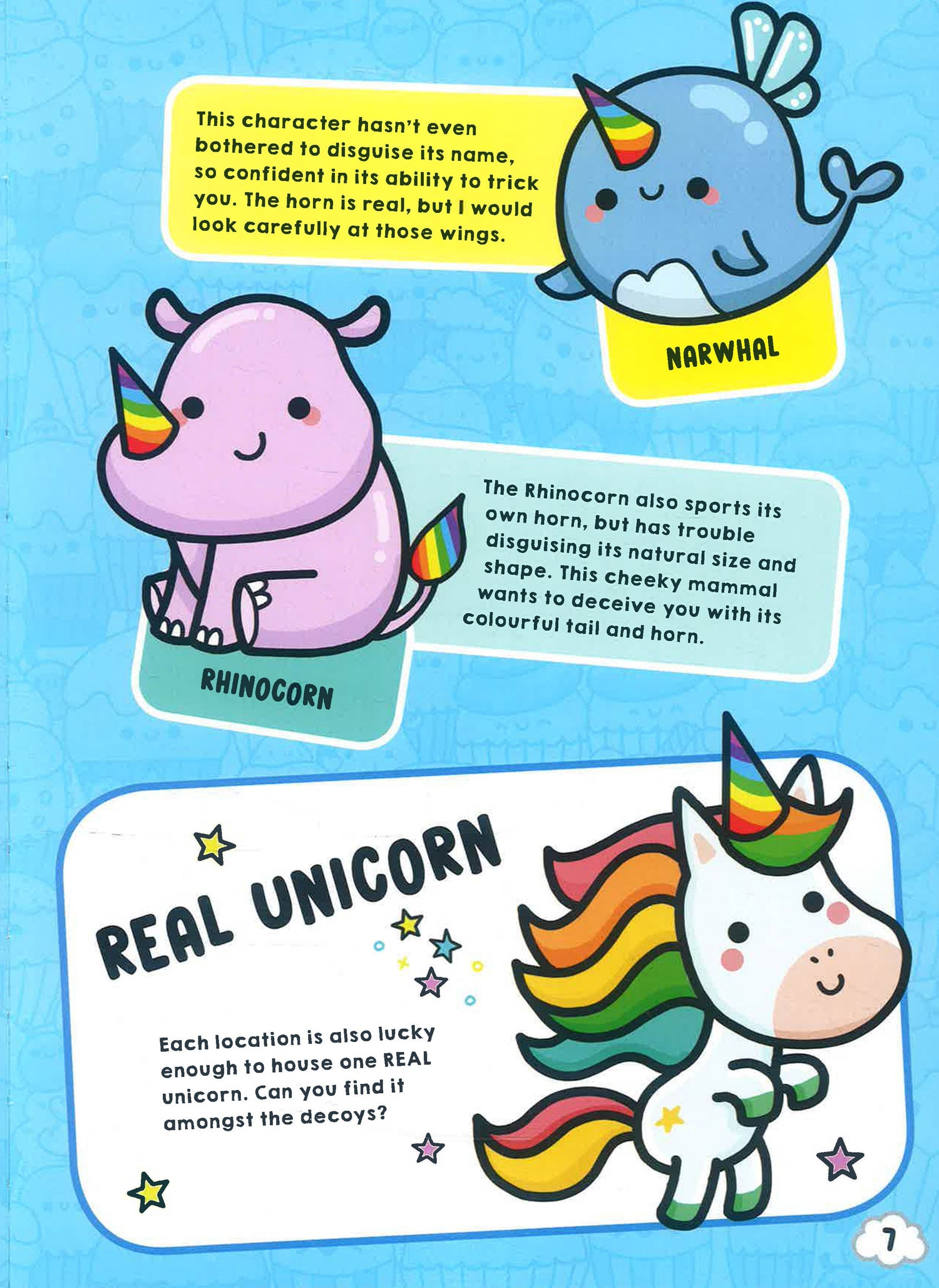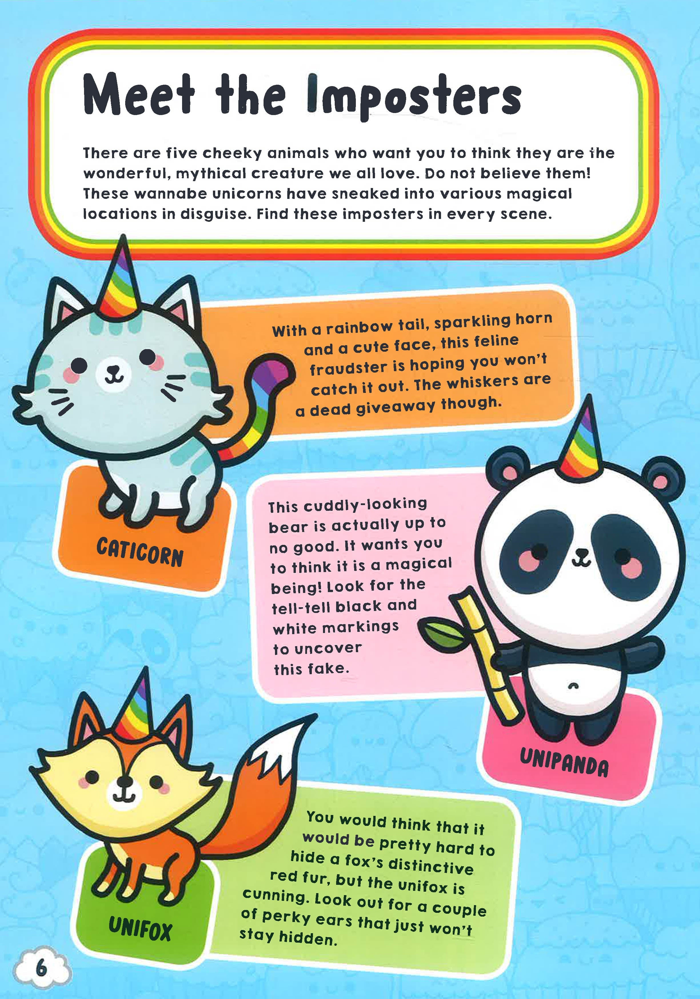 Five cheeky imposters have disguised themselves as unicorns in order to infiltrate each magical world. Can you find the catacorn, the unipanda, the narwhal, the rhinocorn and the unifox in every scene as well as spotting the real life unicorn?