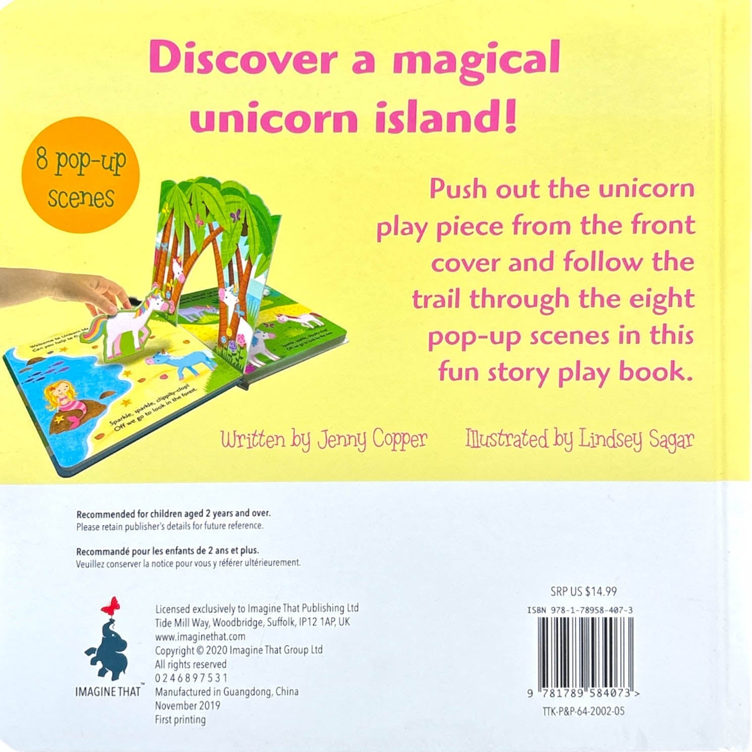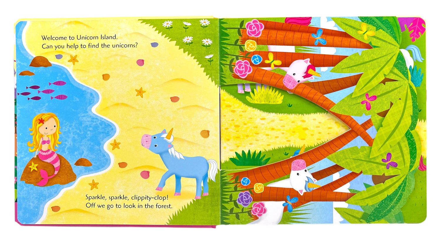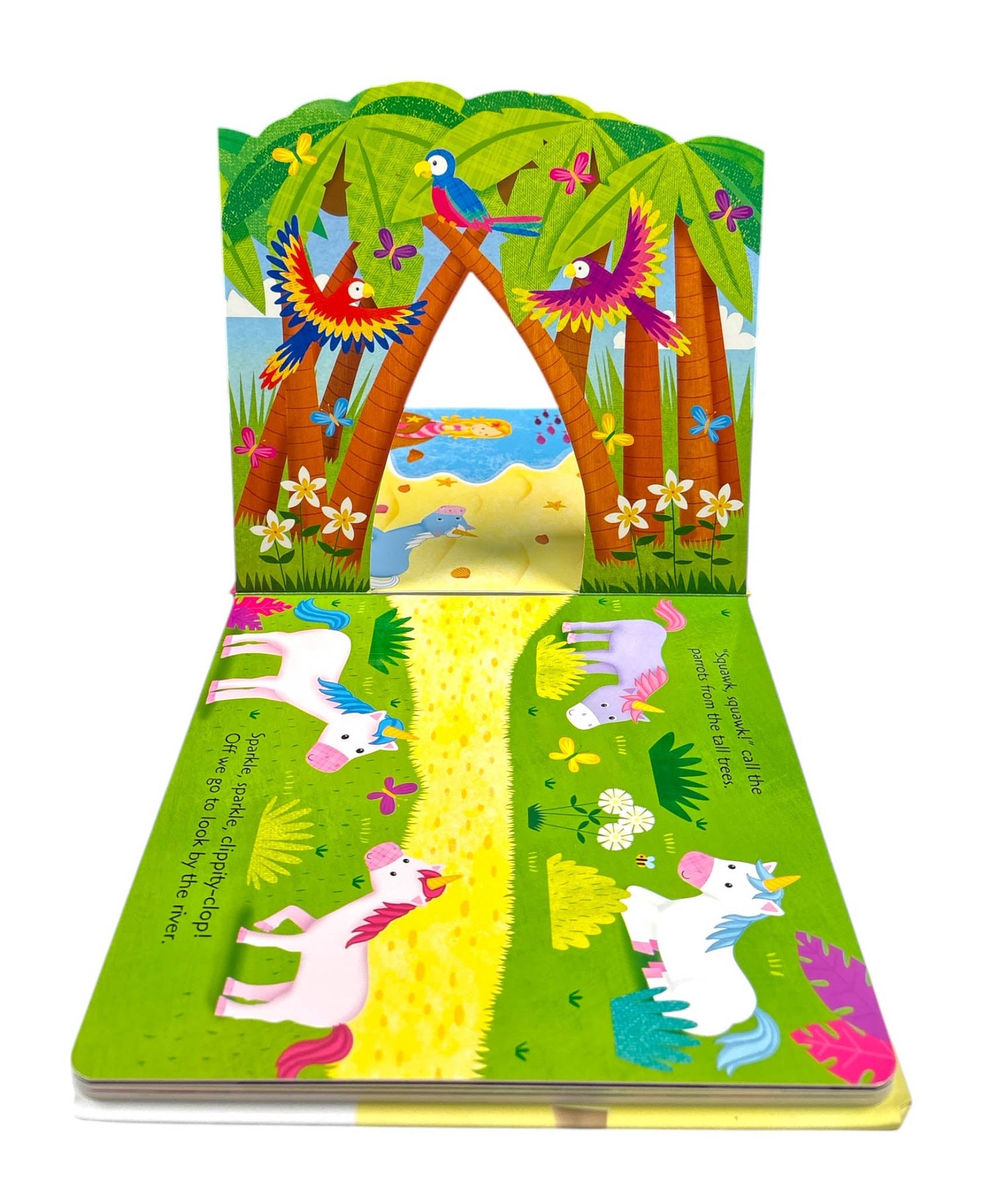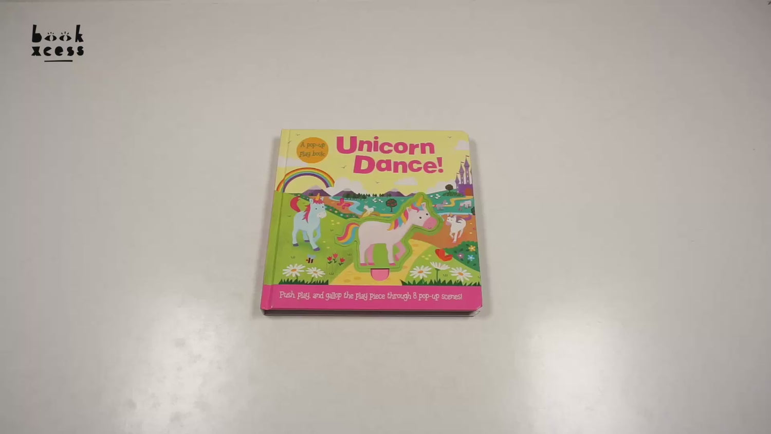 Push out the unicorn play piece from the front cover and follow the trail through the eight pop-up scenes in this fun story play book.