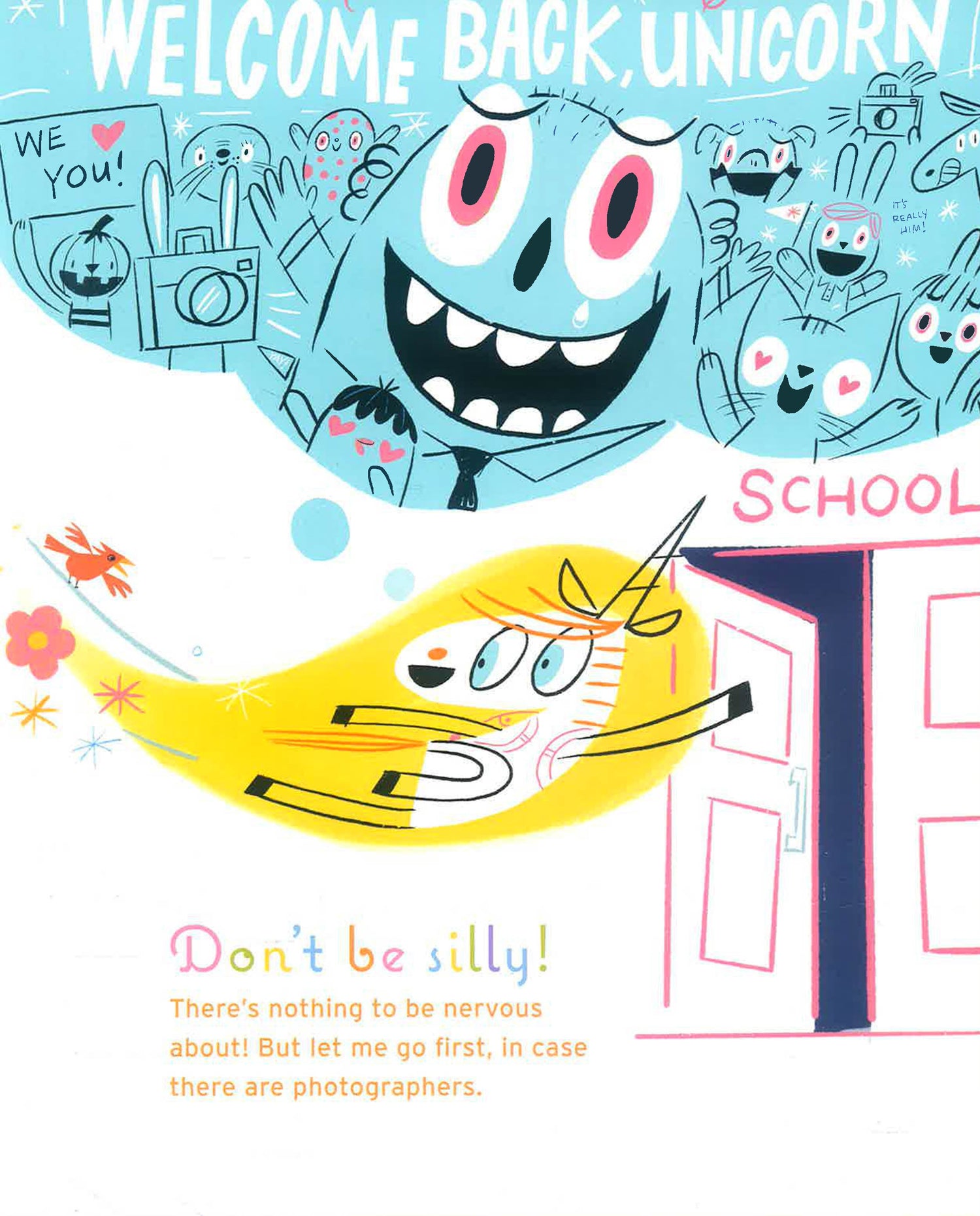 You remember Unicorn. You know, Goat's friend? The one who can fly, make it rain cupcakes, and turn things into gold? On the first day of school, Unicorn expects to make his usual big splash. But no one pays him much attention--the other kids are much more interested in the latest trend in toys: rubber bands that look like other things. Unicorn comes up with a plan to get his mojo back, but his efforts turn out to be more annoying than impressive. Can Goat help him recover his magic, or is Unicorn destined to a life of mediocrity?