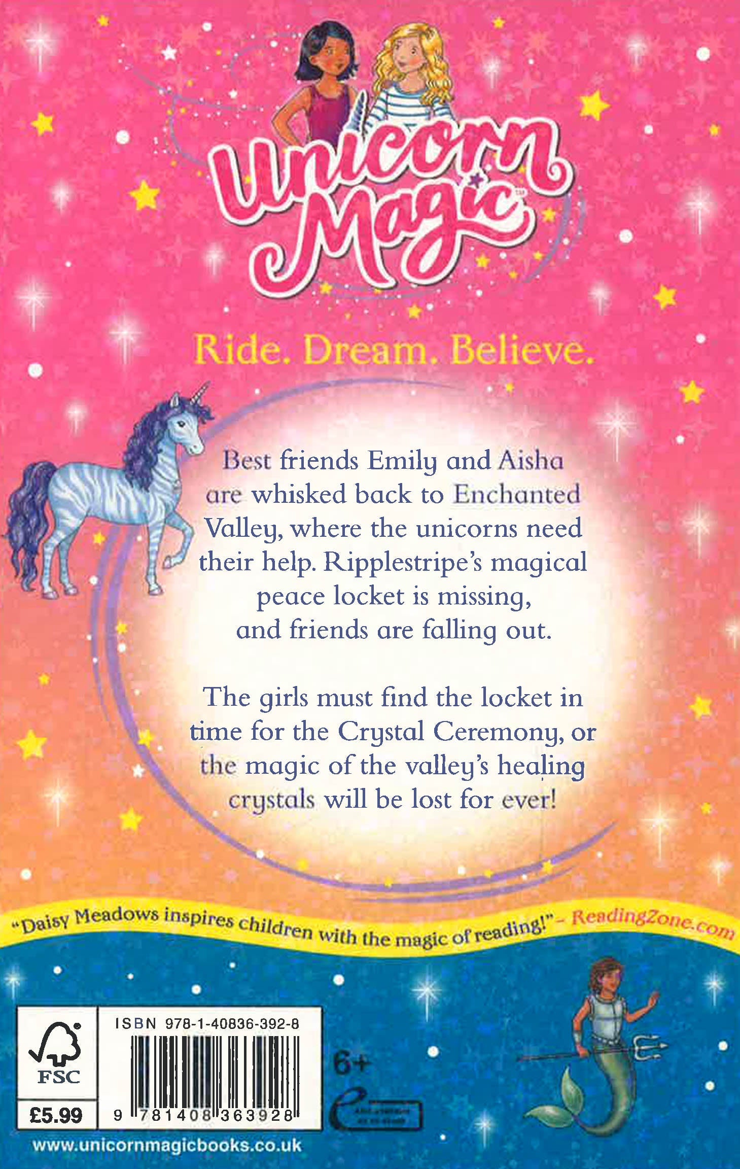 Best friends Emily and Aisha are thrilled when they're whisked away on a new series of adventures in the magical Enchanted Valley, where good Queen Aurora rules kindly over the unicorns and other magical creatures. In this series the girls find out about the magical healing crystals which help to keep every Enchanted Valley family safe and well. But the wicked unicorn Selena is up to her usual tricks, and she's stolen Ripplestripe's magical peace locket. Now friends from all across Enchanted Valley are falling out ... and even Emily and Aisha's friendship is in trouble. They must find the missing locket before friendships are broken for ever, so that the Crystal Ceremony can take place and preserve the magic of Enchanted Valley's healing crystals for another year.