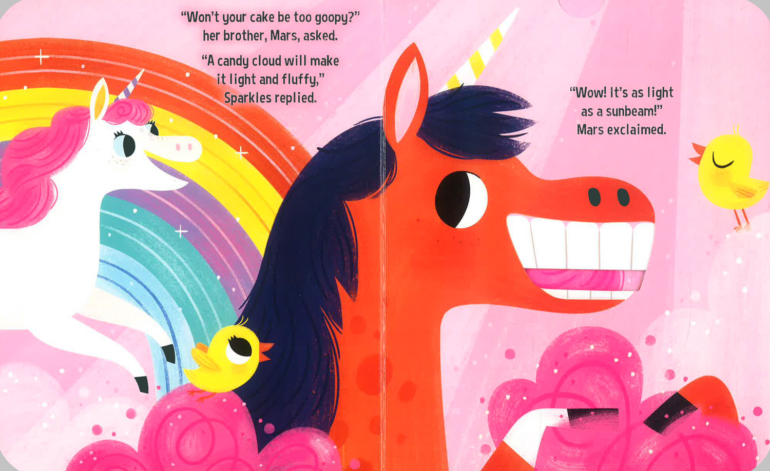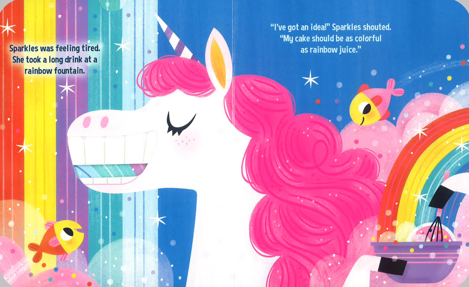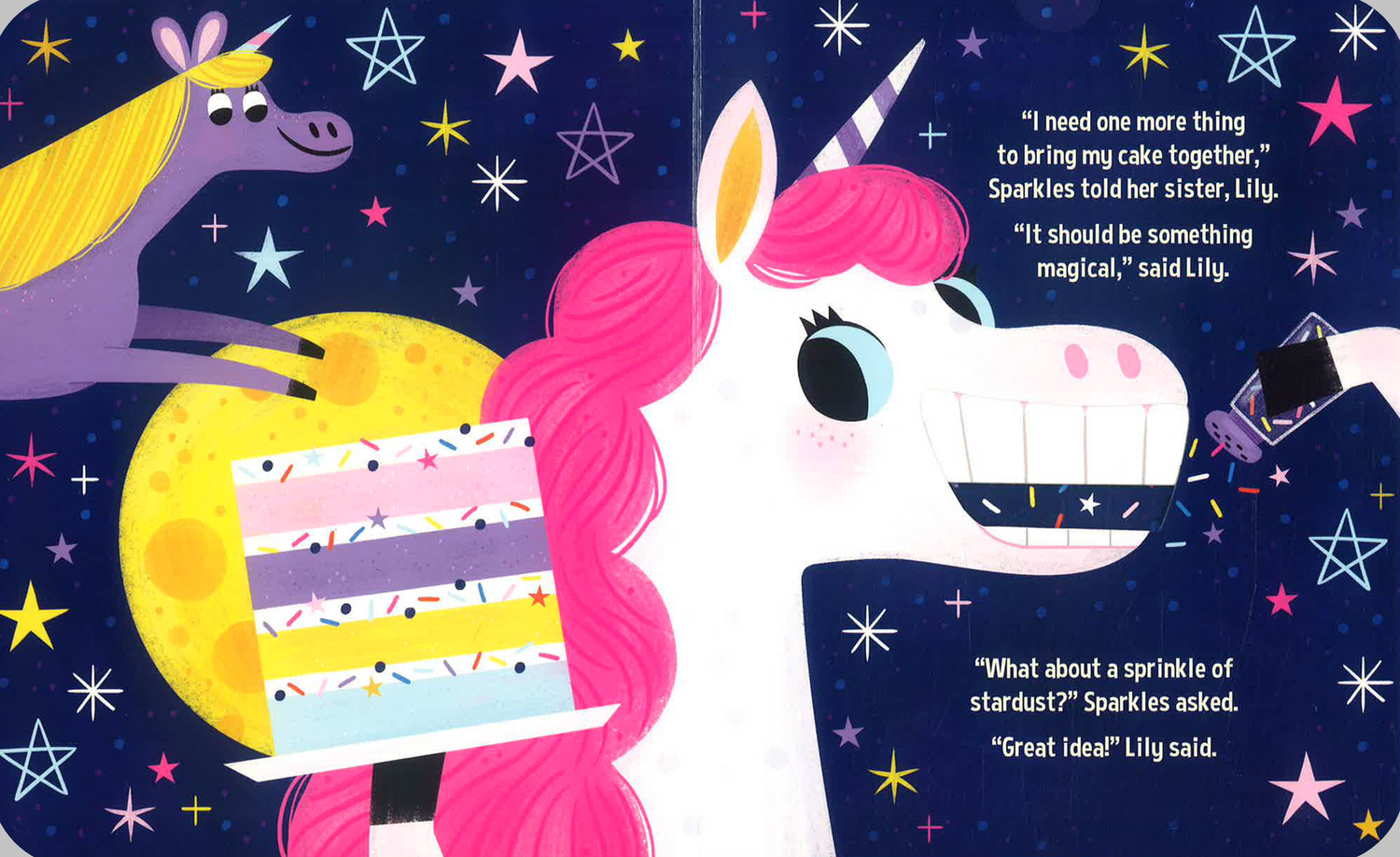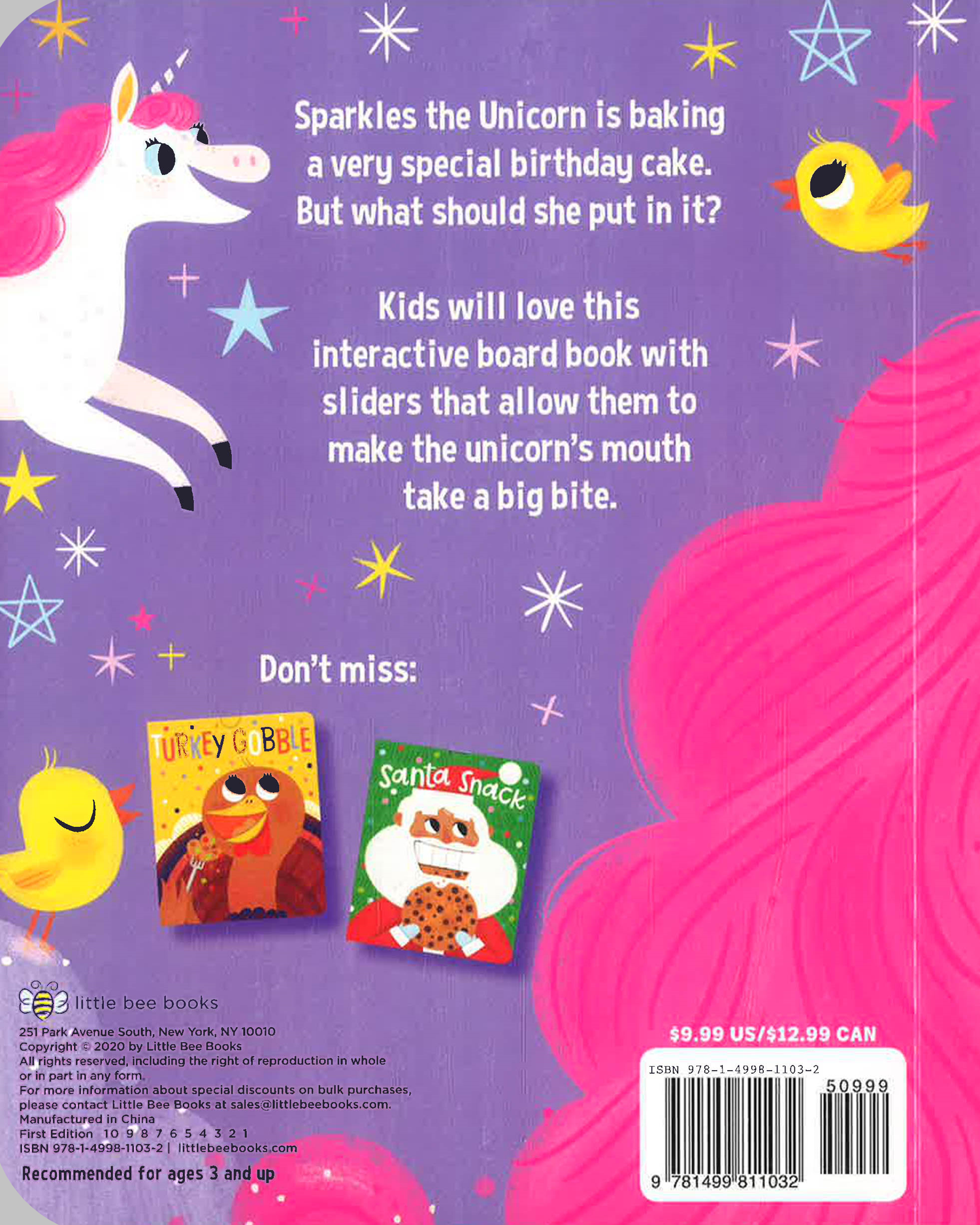 It is Mom's birthday and Sparkles the unicorn is in charge of making the cake. But what should she put in it? Kids will love making Sparkles take big bites of magical ingredients in this interactive, yummy, adventure.
