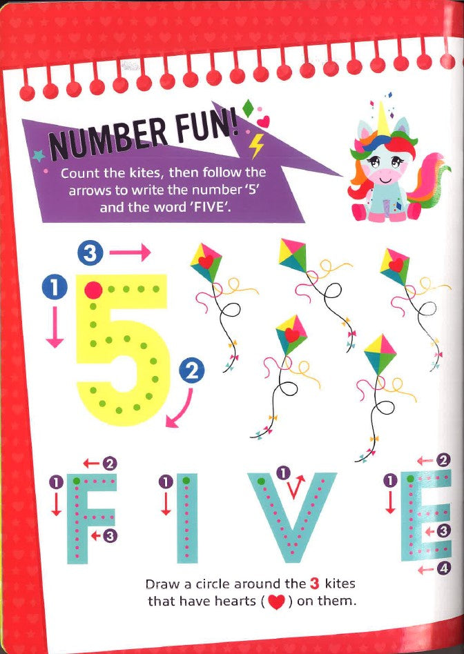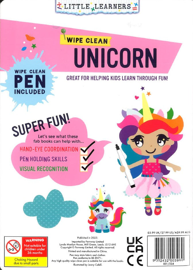 With unicorn-themed mazes to solve, dots to join, differences to spot, objects to count and dotted pictures and numbers to trace over, little children will have great fun completing the activities while practising the vital pen-control skills they need to be ready for writing. The wipe-clean pen can easily be rubbed off the shiny pages so children can do the activities again and again.