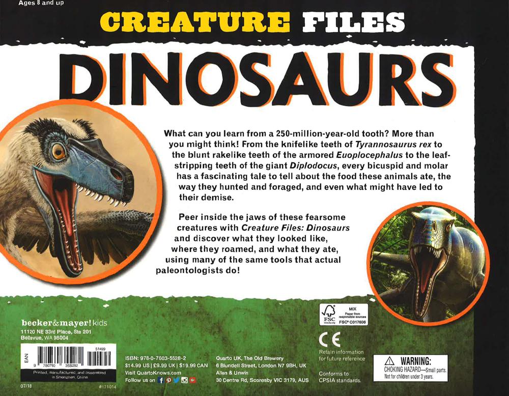 Open wide! You're about to take a look into the mouths of some of the most fearsome dinosaurs to ever walk the Earth with Creature Files Dinosaurs. Grab your tools and get ready for dino exploration! What can you learn from a 250-million-year-old tooth? More than you might think! From the knife-like teeth ofTyrannosaurus rex, to the blunt rake-like teeth of the armored Euoplocephalus, to the leaf-stripping teeth of the giant Diplodocus, every bicuspid and molar has a fascinating tale to tell about the food these animals ate, the way they hunted and foraged, and even what might have led to their demise. In Creature Files: Dinosaurs, you'll peer inside the jaws of these fearsome creatures, discovering what they really looked like, where they roamed, and what they ate, using many of the same tools thatactual paleontologists do. Can you match the three replica teeth to the prehistoric mouths they belong to? Stunning illustrations and surprising stats bring the stories of these long-extinct beasts to life.