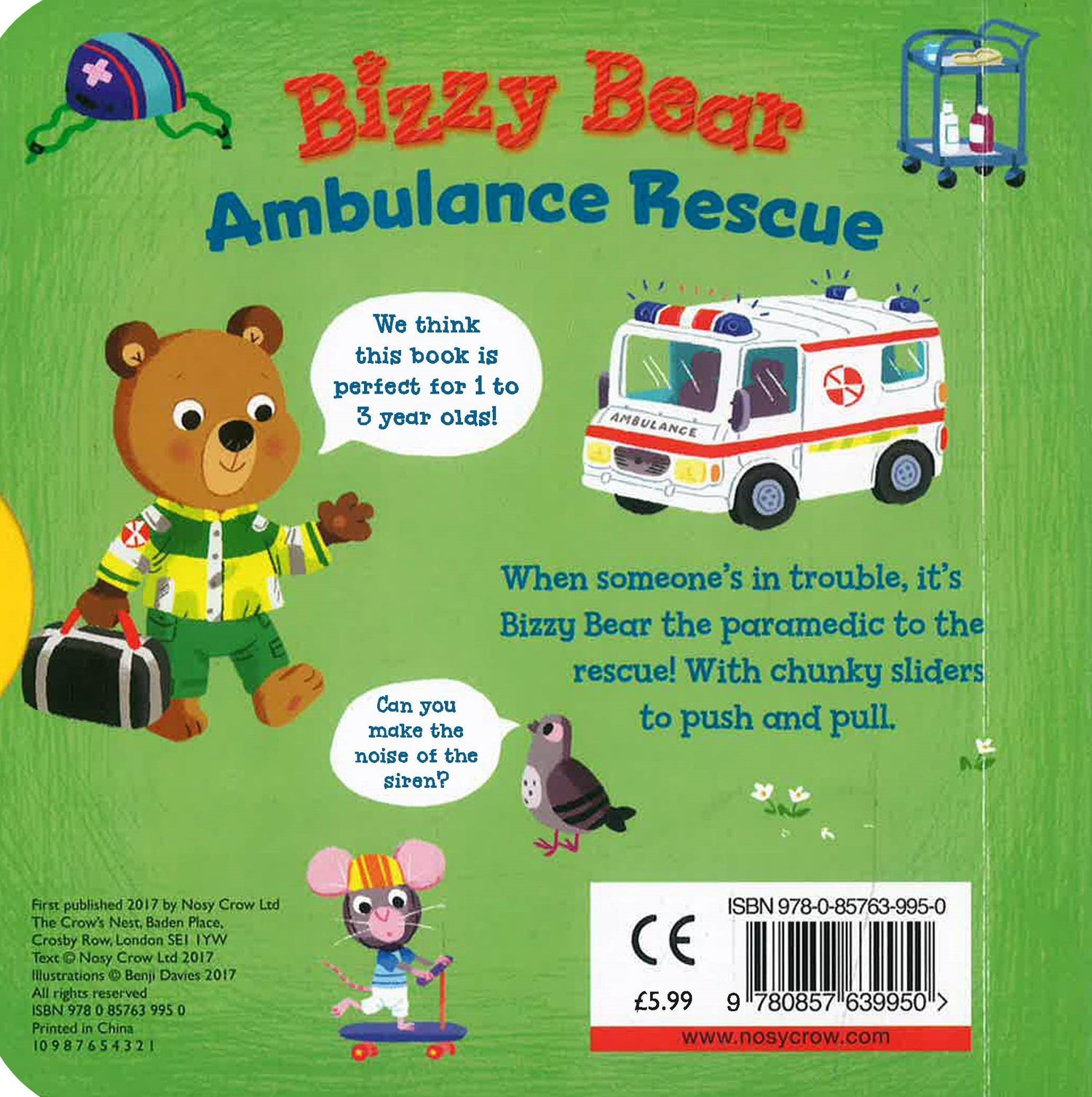 Five easy to move sliders, a rhyming story and lots to spot and say in this series of bright, interactive board books for toddlers! Today, Bizzy Bear is working as a paramedic and when the emergency call comes in, there isn't a moment to lose! Help him speed along in the ambulance and switch on the flashing lights. Then, once he's rescued the injured cyclist, lift the stretcher and pull back the ward curtain for the doctor. A funny little story with loads of details to spot and chat about. This story needs YOU! By pushing, pulling and turning the mechanisms, little hands can move the story onto the next scene and bring the rhyming text to life! The high level of interaction builds confidence and engagement with books, which is a key stepping-stone to reading for toddlers. Illustrated by multi-award-winning Benji Davies, illustrator of The Storm Whale, and Grandad's Island Collect the whole series; other title available include: Bizzy Bear: Farmyard Fun, Bizzy Bear: Fire Rescue, Bizzy Bear: Racing Driver and lots, lots more!