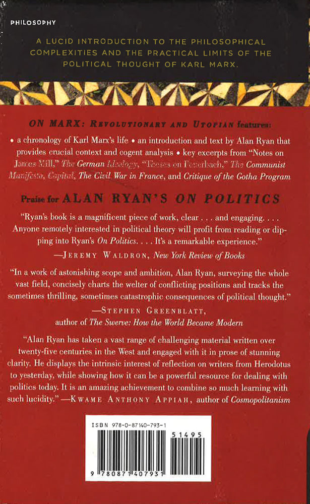 Both a lucid introduction and a subtle demolition of the philosopher whose theories were treated as near-divine by those who followed him.In On Marx, Alan Ryan examines Marx's writing, not within the framework of Lenin or Tolstoy but within its own time, tracing its Hegelian roots and providing a sterling explication and critique of his theories of alienation, class struggle and revolution. This volume provides the clearest, most accessible introduction to Marx's theories in recent years. On Marx features a chronology, biography and excerpts from Marx's major works.