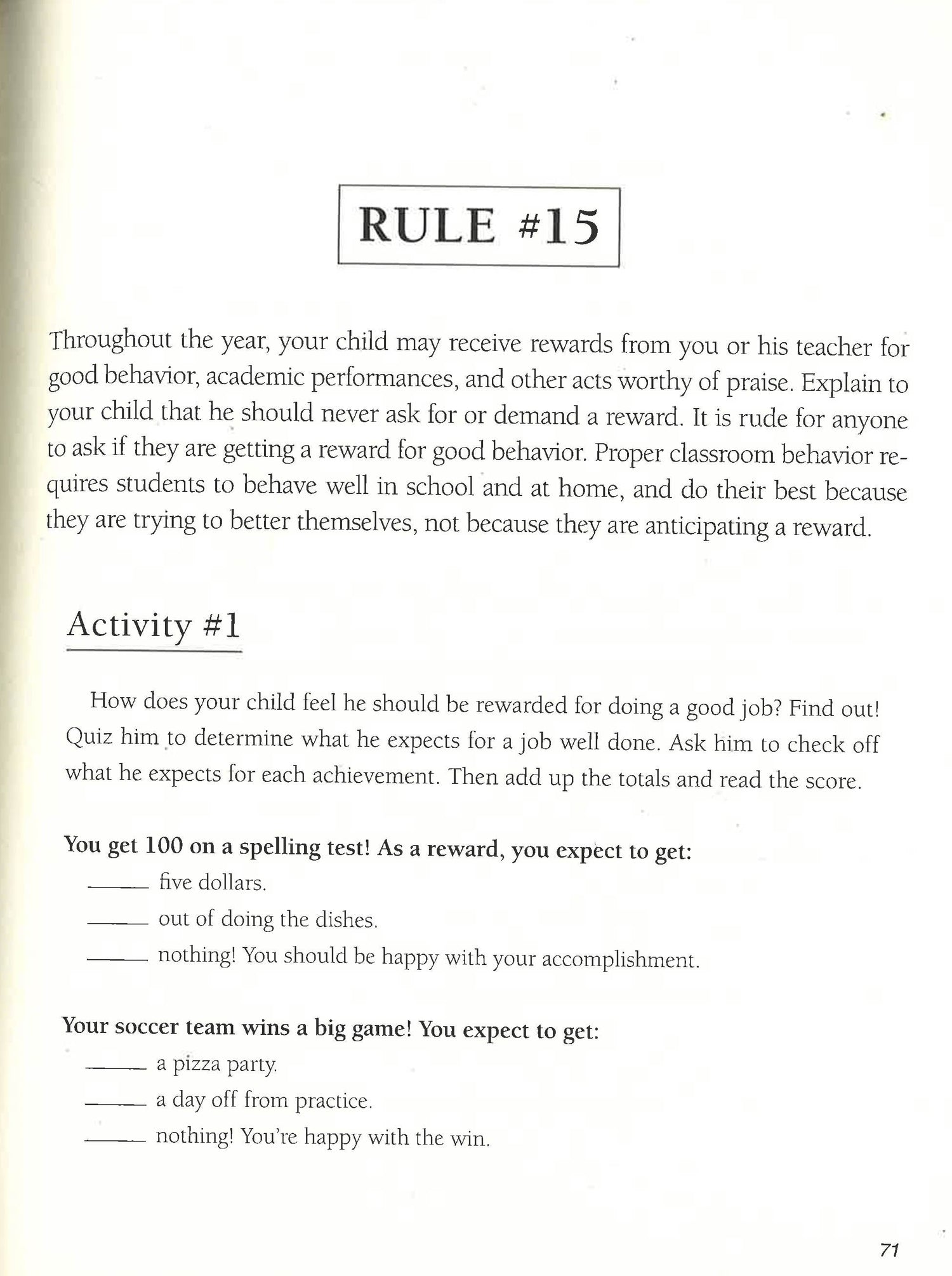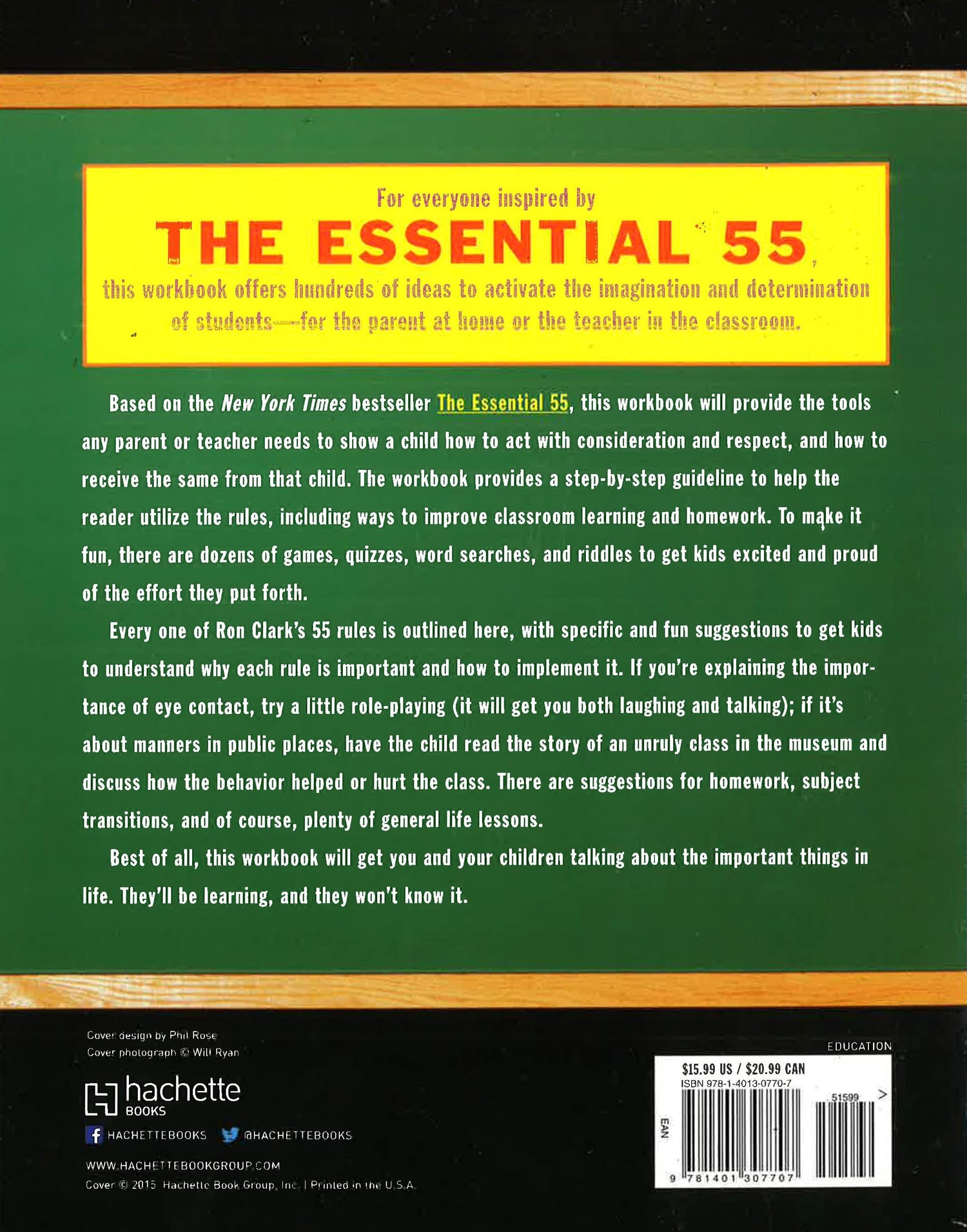 The Essential 55 Workbook is full of easy-to-do lessons to help you reinforce The Essential 55 rules that every child should know. With a series of self-tests, exercises, and questionnaires, The Essential 55 Workbook allows you to adapt Ron Clark's successful tools to your own situation. With determination, discipline, and regular rewards, the children you stick by will be the children you come to admire.