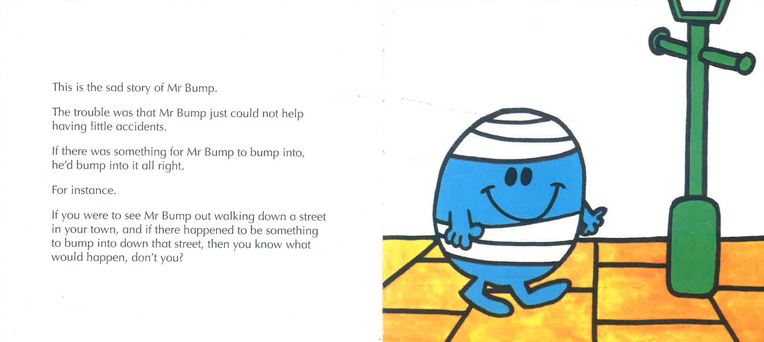Poor Mr Bump just cannot stop having accidents. If there was something for Mr Bump to bump into, he'd bump into it all right...