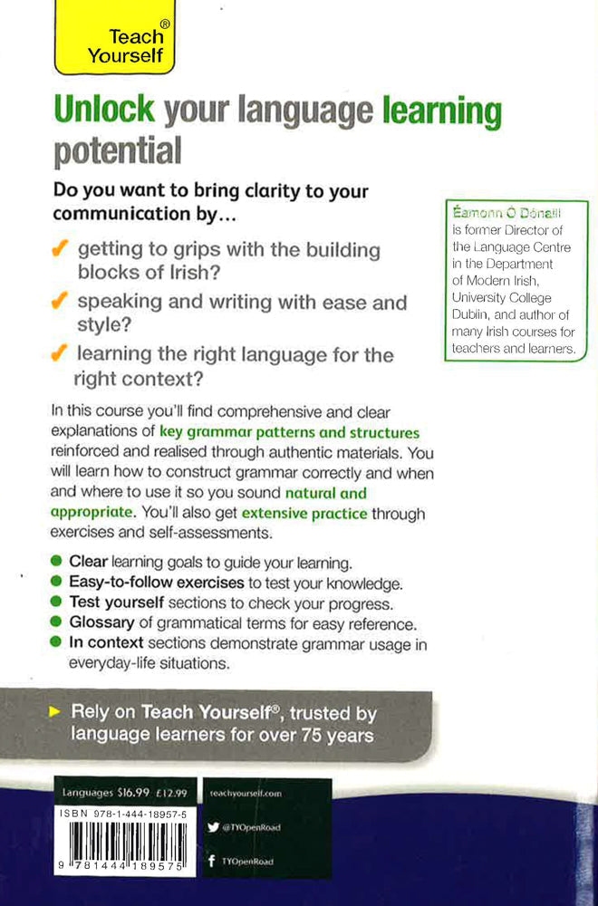 Comprehensive and clear explanations of key grammar patterns and structures are reinforced and contextualized through authentic materials. You will not only learn how to construct grammar correctly, but when and where to use it so you sound natural and appropriate. Irish Grammar You Really Need to Know will help you gain the intuition you need to become a confident communicator in your new language.