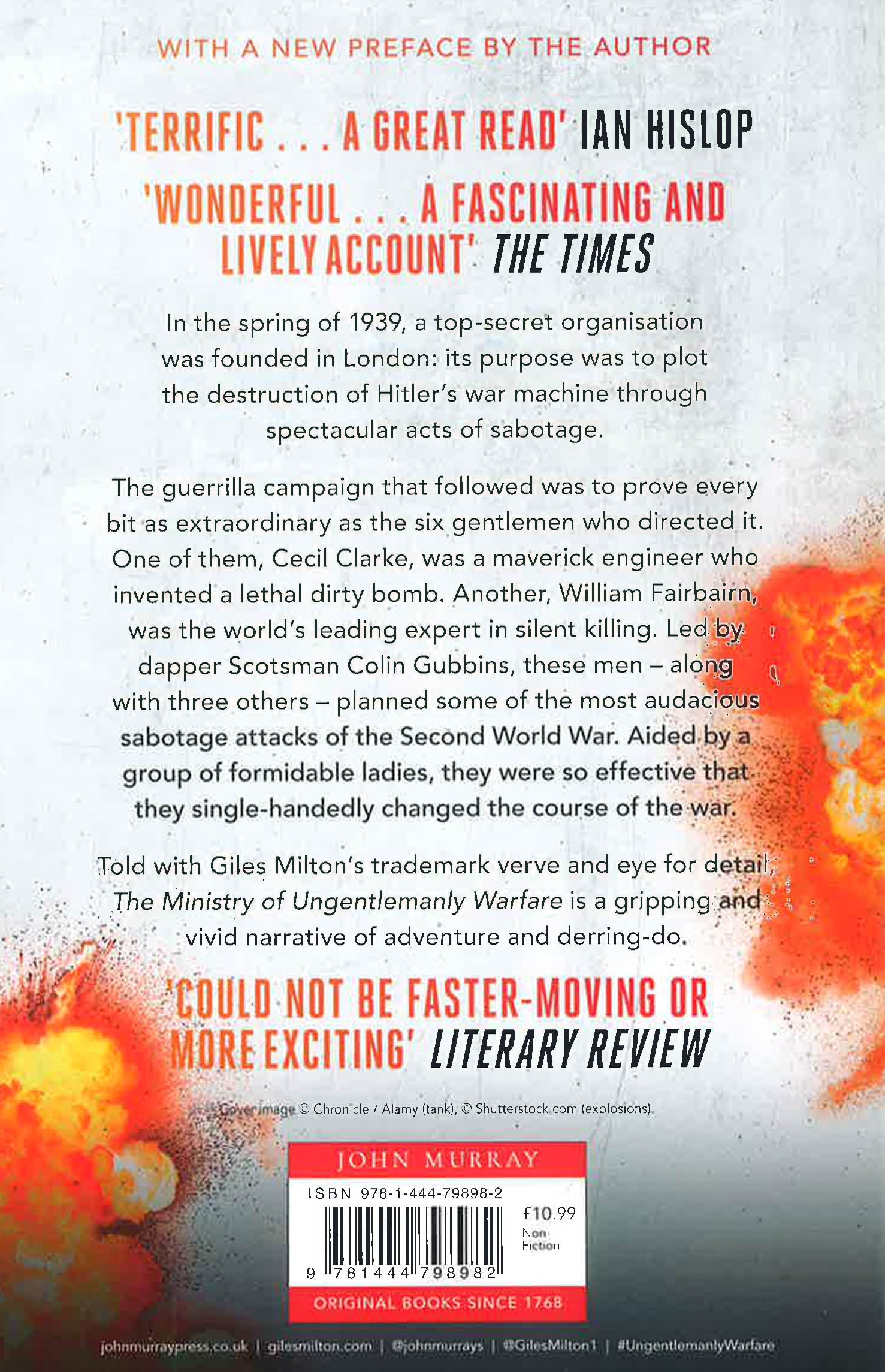 The incredible story of the secret underground operations of the Second World War. A magnificent story, brilliantly told. Read it!' Anthony Horowitz. Six gentlemen, one goal - the destruction of Hitler's war machine. In the spring of 1939, a top secret organisation was founded in London: its purpose was to plot the destruction of Hitler's war machine through spectacular acts of sabotage. The guerrilla campaign that followed was to prove every bit as extraordinary as the six gentlemen who directed it. Winston Churchill selected them because they were wildly creative and thoroughly ungentlemanly. One of them, Cecil Clarke, was a maverick engineer who had spent the 1930s inventing futuristic caravans. Now, his talents were put to more devious use: he built the dirty bomb used to assassinate Hitler's favourite, Reinhard Heydrich. Another member of the team, William Fairbairn, was a portly pensioner with an unusual passion: he was the world's leading expert in silent killing. He was hired to train the guerrillas being parachuted behind enemy lines. Led by dapper Scotsman Colin Gubbins, these men - along with three others - formed a secret inner circle that planned the most audacious sabotage attacks of the Second World War. Winston Churchill called it his Ministry of Ungentlemanly Warfare. The six 'ministers', aided by a group of formidable ladies, were so effective that they single-handedly changed the course of the war. Told with Giles Milton's trademark verve and eye for detail, Churchill's Ministry of Ungentlemanly Warfare is thoroughly researched and based on hitherto unknown archival material. It is a gripping and vivid narrative of adventure and derring-do and is also, perhaps, the last great untold story of the Second World War. Previously published in hardback as The Ministry of Ungentlemanly Warfare.