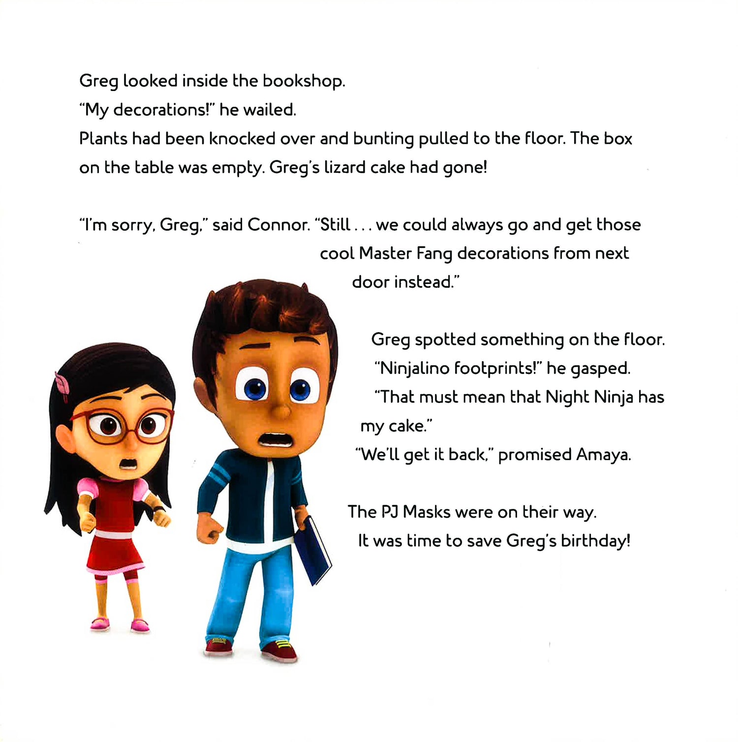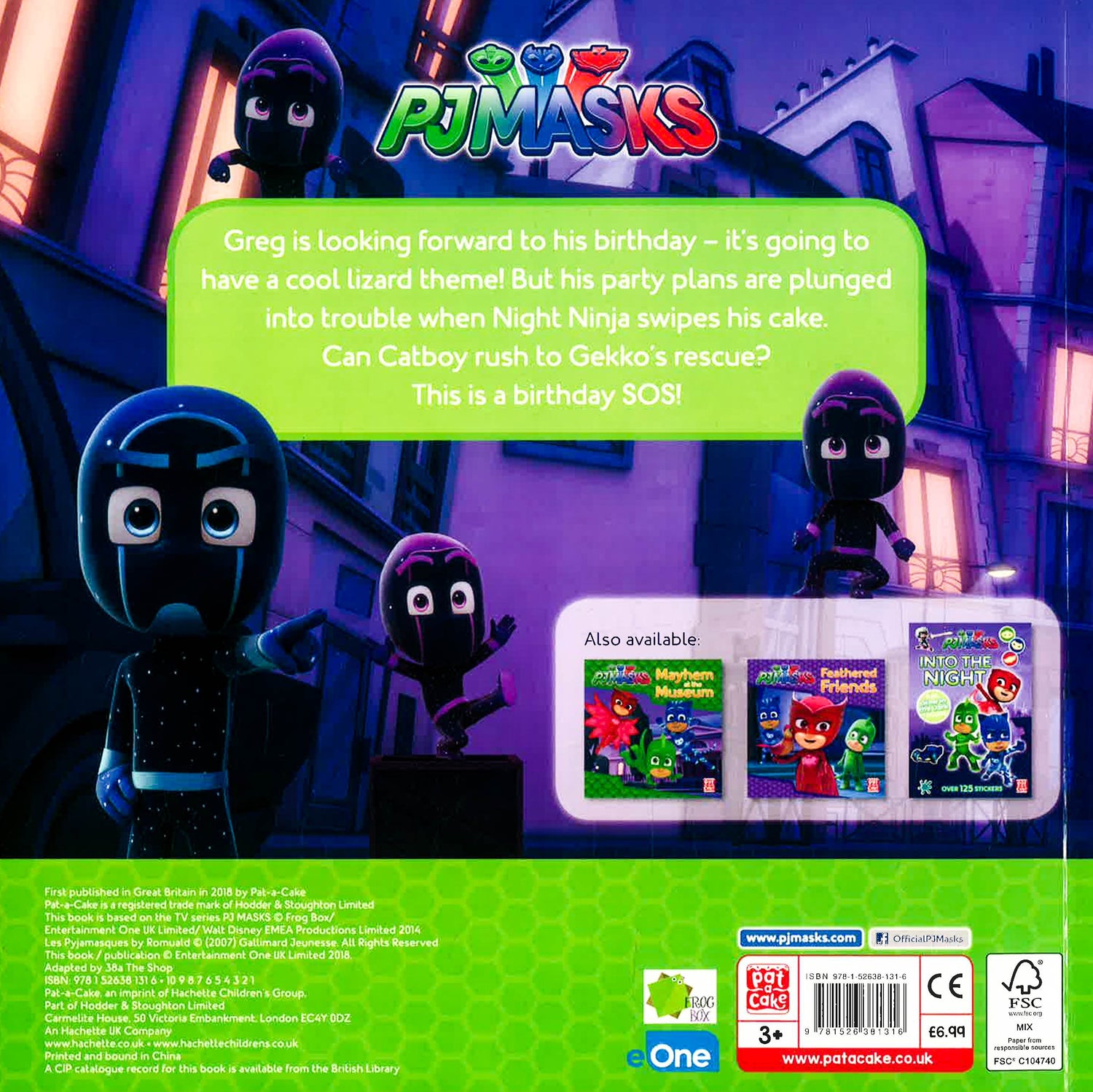 It's Greg's birthday and he's super excited for his lizard-themed party, but when his cake goes missing, the PJ Masks must find the pesky villain and get it back. Night Ninja has the cake and the PJ Masks must work together to beat the baddie!