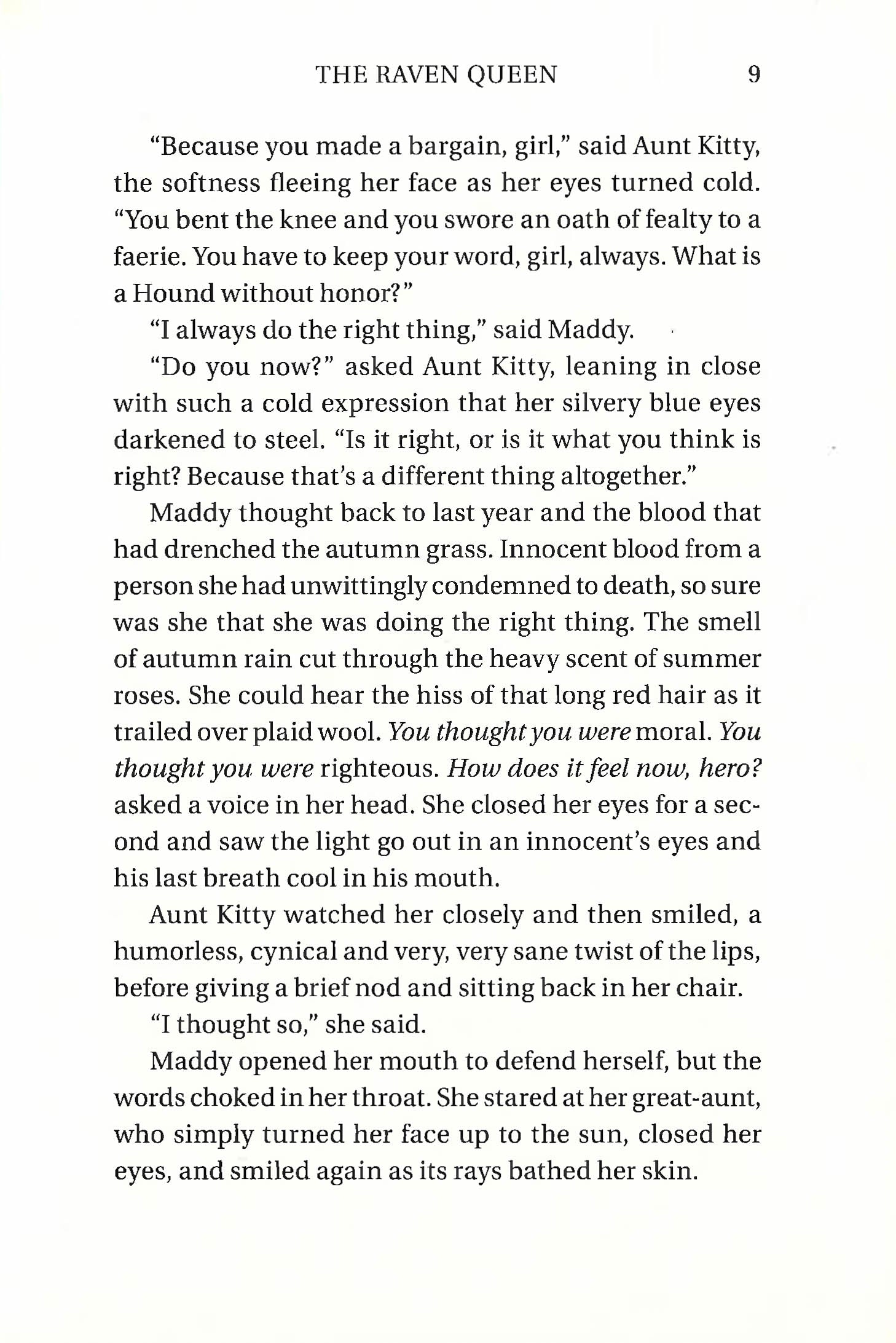 In The Raven Queen, Maddy and her two cousins are preparing for battle. They are the only power preventing the devastating war unfolding in the faerie world from spilling over into the human realm. The trio is determined to protect everything and everyone they love from the dark Tuatha, the fierce faerie leaders.