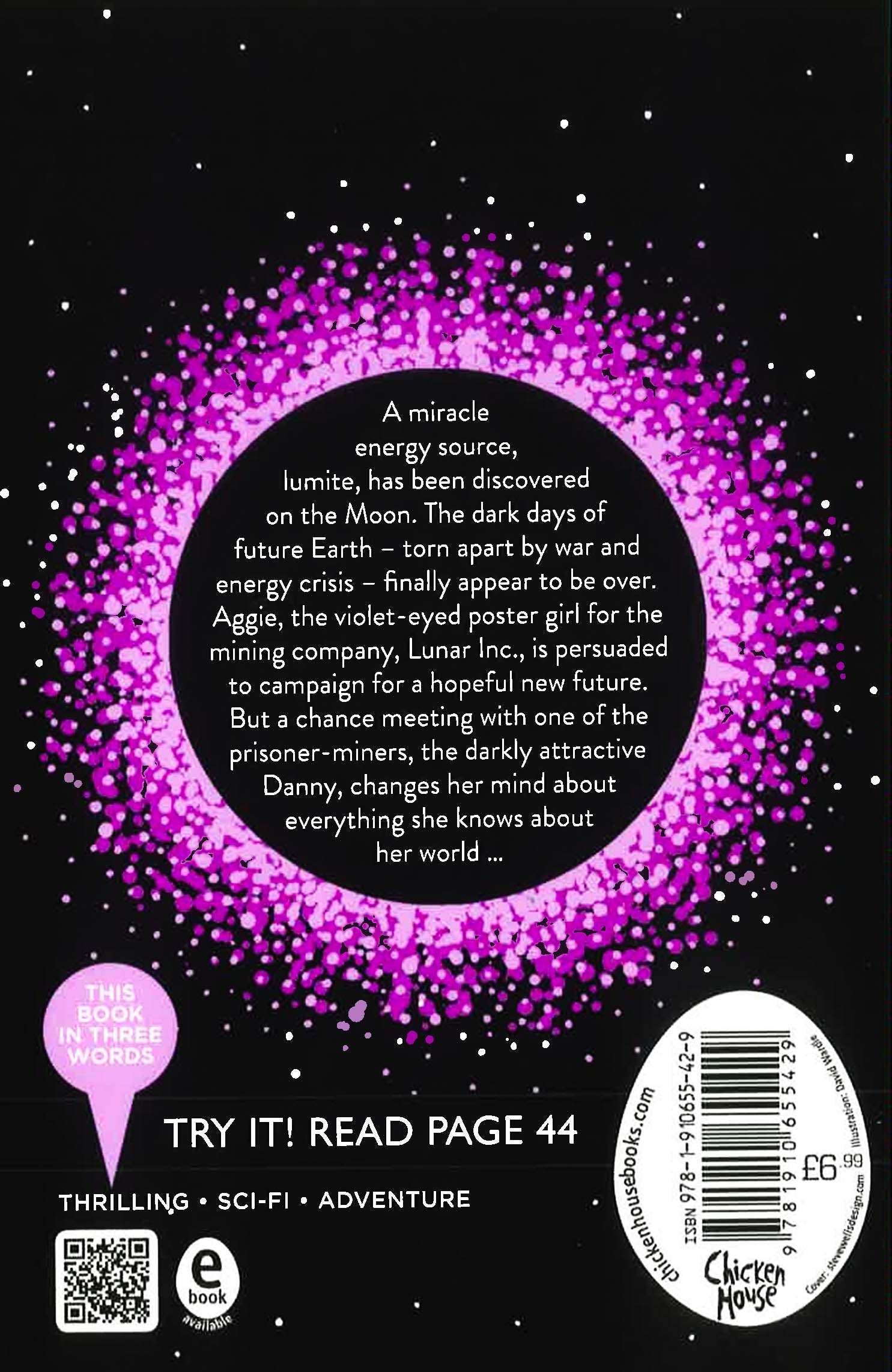 A miracle energy source, Lumite, has been discovered on the moon. The dark days of future Earth - torn apart by war and energy crisis - finally appear to be over. Aggie is the violet-eyed poster girl for the mining company, Lunar Inc, persuaded to campaign for a hopeful new future. But a chance meeting with one of the prisoner-miners, the darkly attractive Danny, changes her mind about everything she knows about her world ...