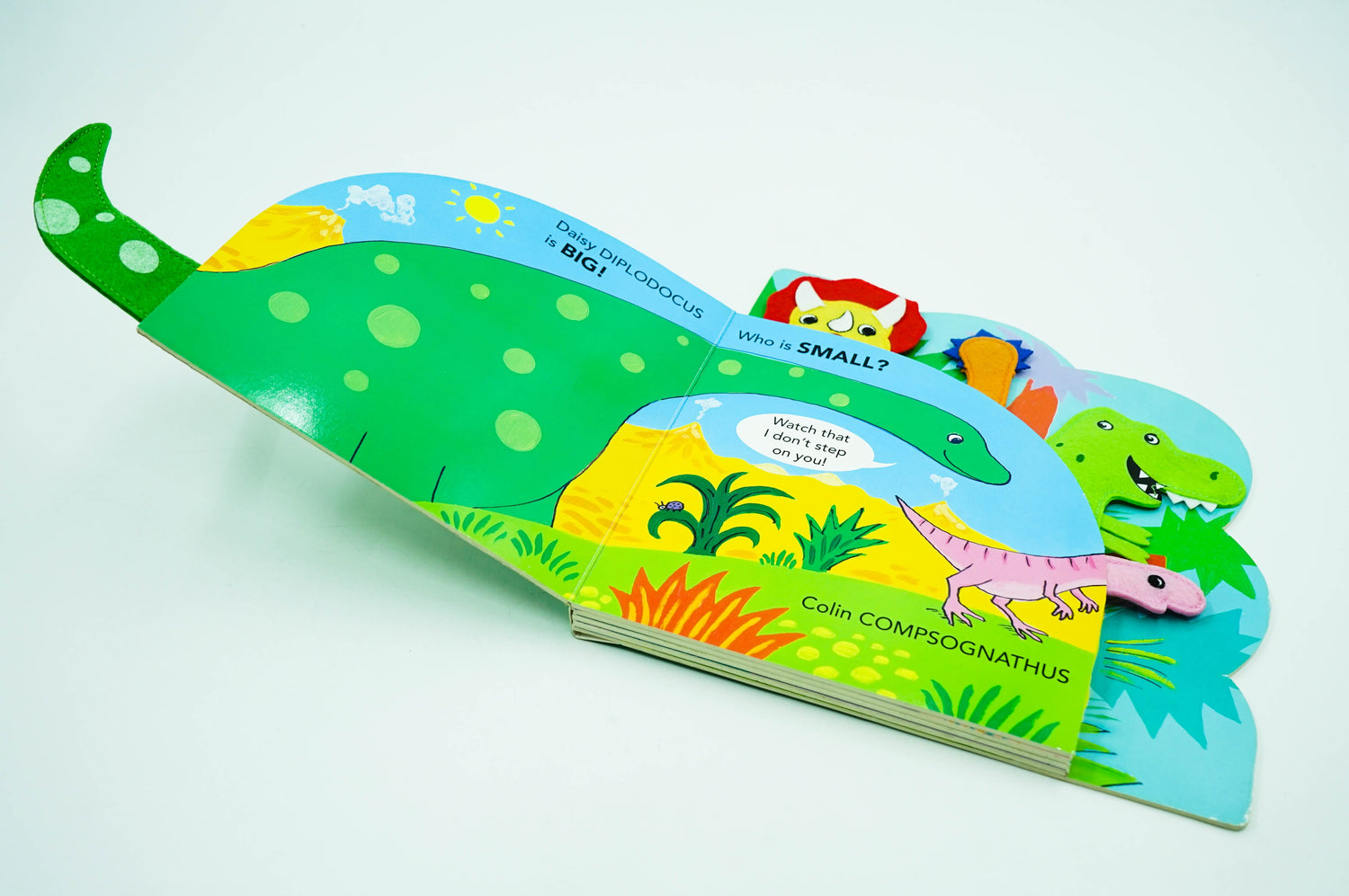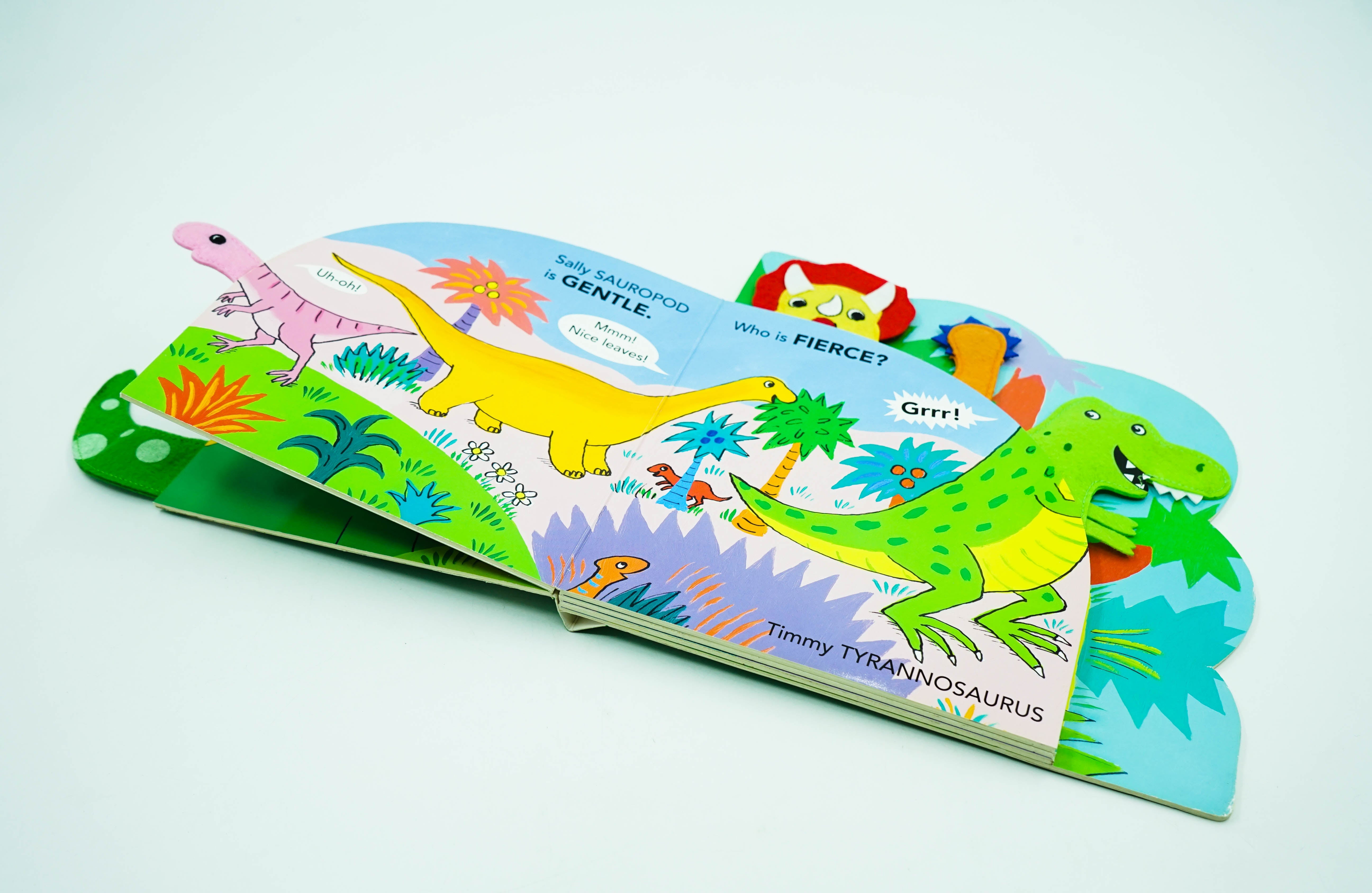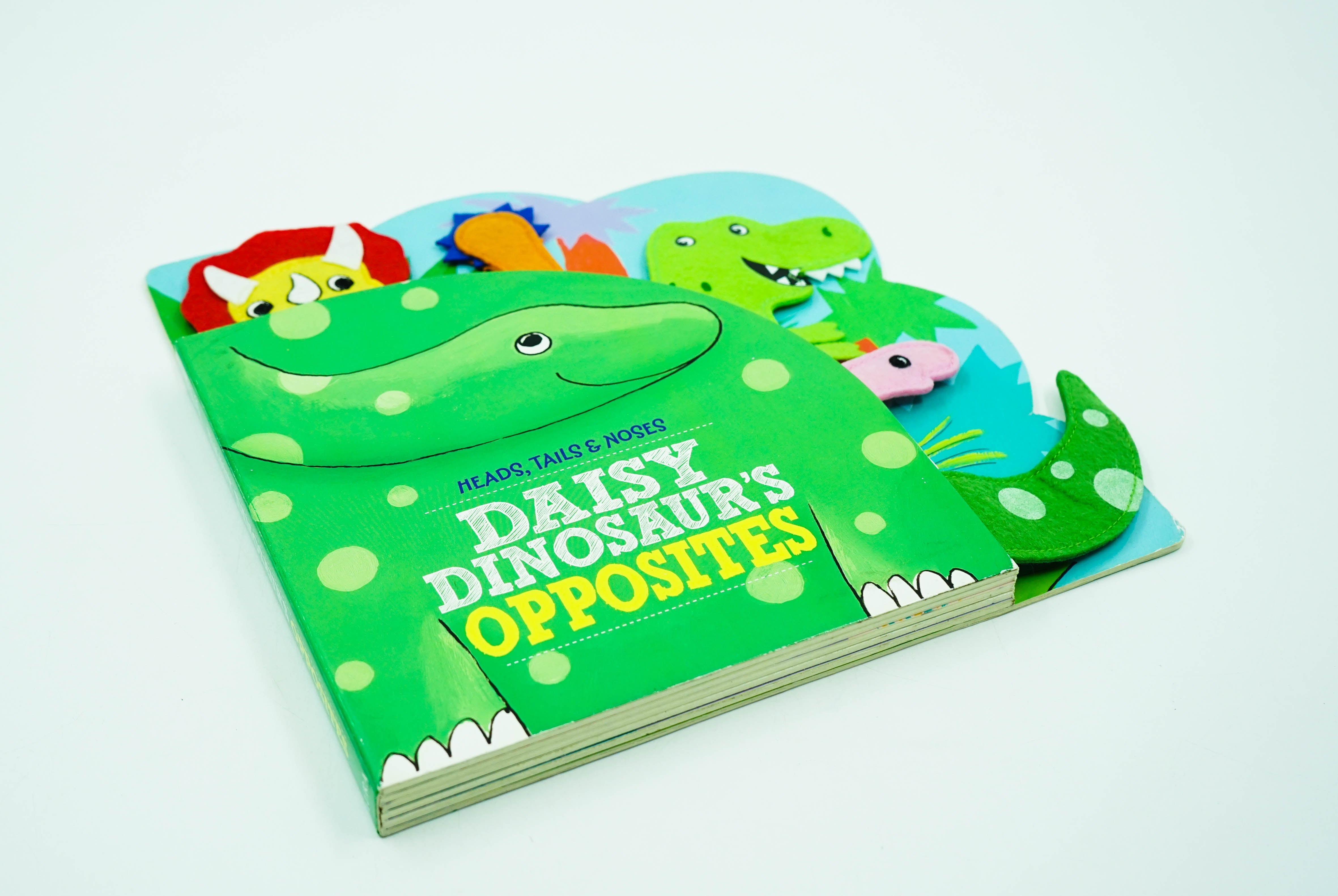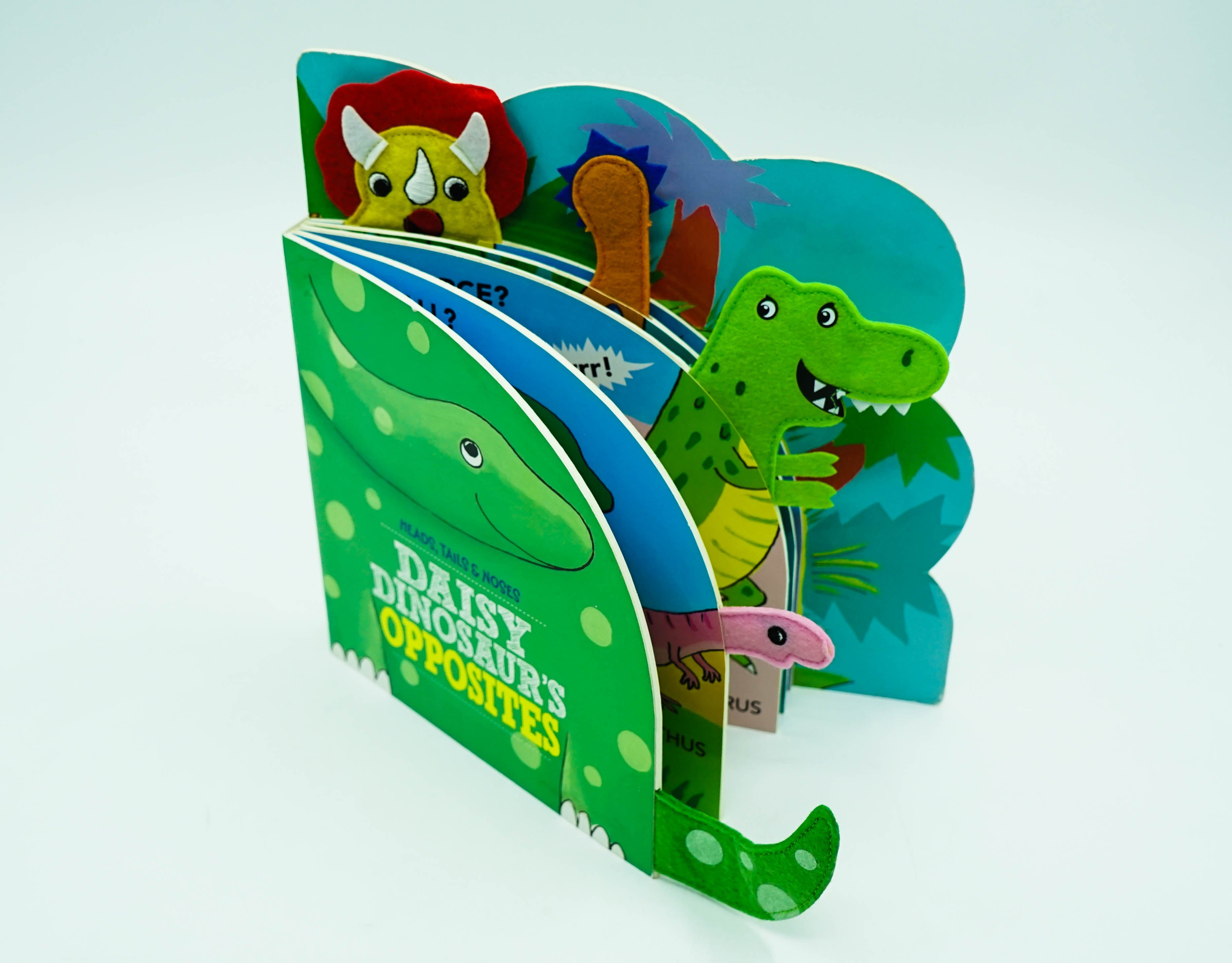 Delightful shaped board books with fabric animal heads and tails peeping out to identify the fun dinosaur characters within this opposites story.