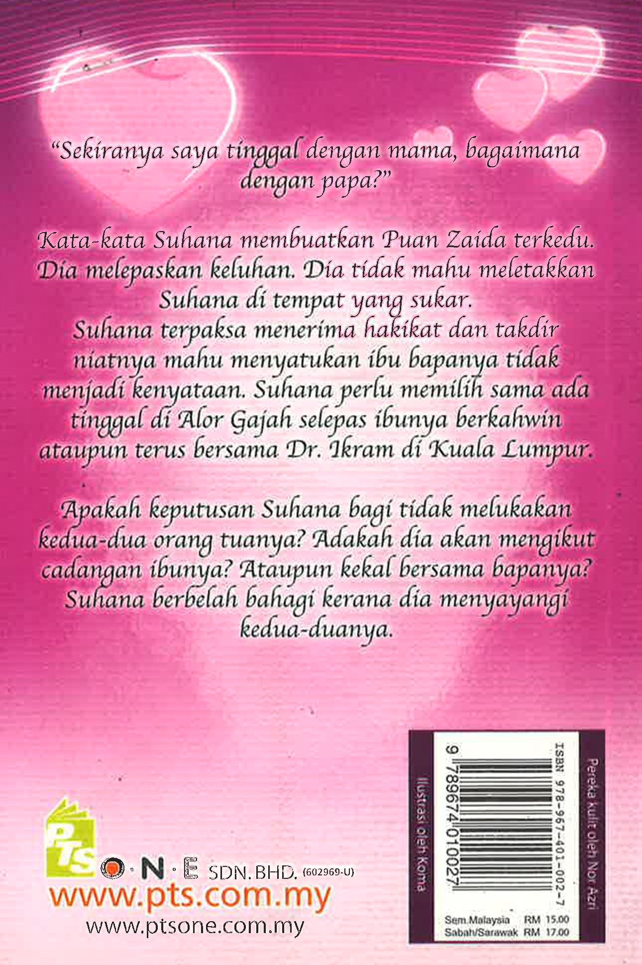 Kata-kata Suhana membuatkan Puan Zaida terkedu. Dia melepaskan keluhan. Dia tidak mahu meletakkan Suhana di tempat yang sukar. Suhana terpaksa menerima hakikat dan takdir niatnya mahu menyatukan ibu bapanya tidak menjadi kenyataan. Suhana perlu memilih sama ada tinggal di Alor Gajah selepas ibunya berkahwin ataupun terus bersama Dr Ikram di Kuala Lumpur