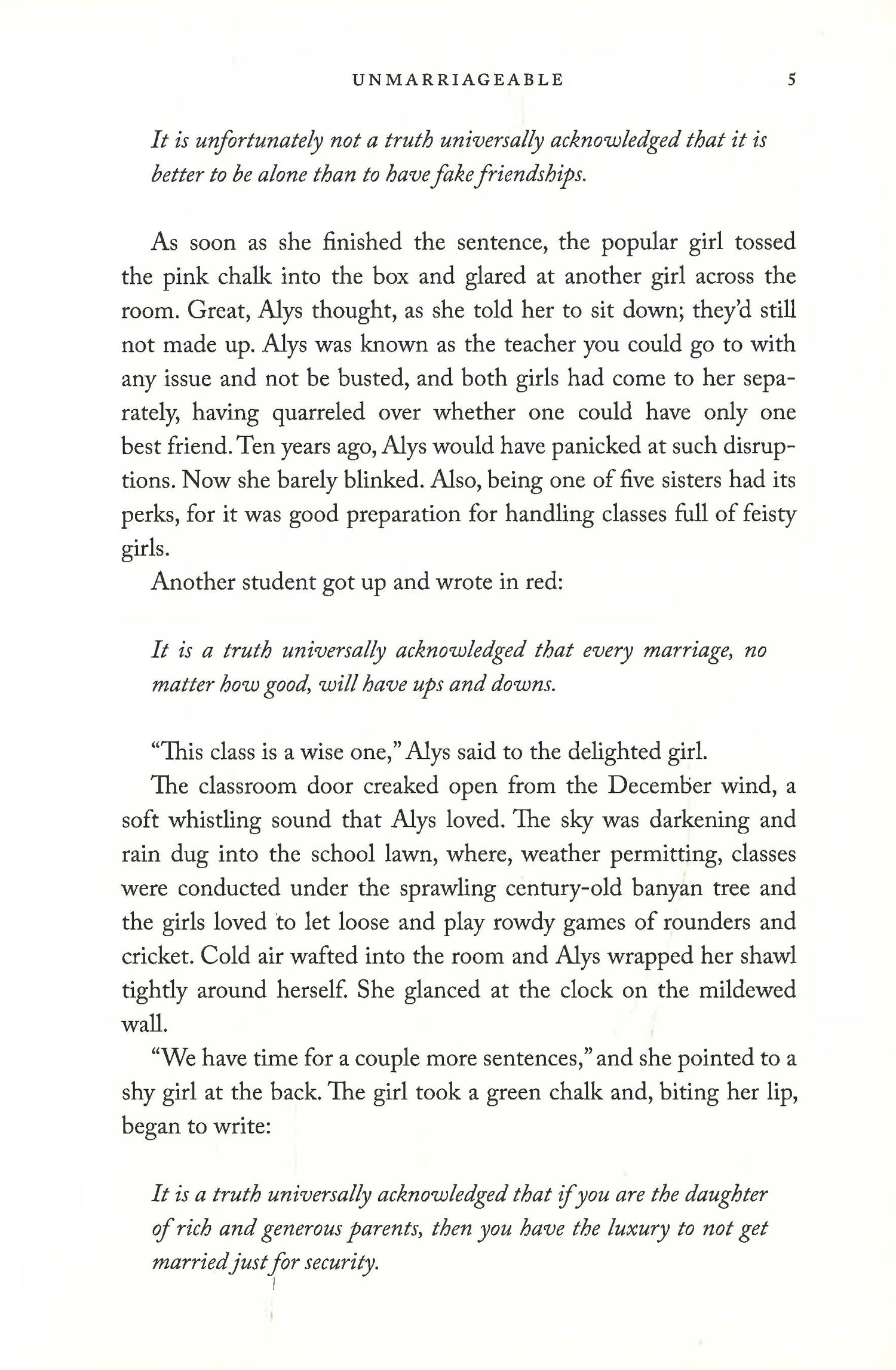 When an invitation arrives to the biggest wedding their small town has seen in years, Mrs. Binat, certain that their luck is about to change, excitedly sets to work preparing her daughters to fish for rich, eligible bachelors. On the first night of the festivities, Alys’s lovely older sister, Jena, catches the eye of Fahad “Bungles” Bingla, the wildly successful—and single—entrepreneur. But Bungles’s friend Valentine Darsee is clearly unimpressed by the Binat family. Alys accidentally overhears his unflattering assessment of her and quickly dismisses him and his snobbish ways. As the days of lavish wedding parties unfold, the Binats wait breathlessly to see if Jena will land a proposal—and Alys begins to realize that Darsee’s brusque manner may be hiding a very different man from the one she saw at first glance.