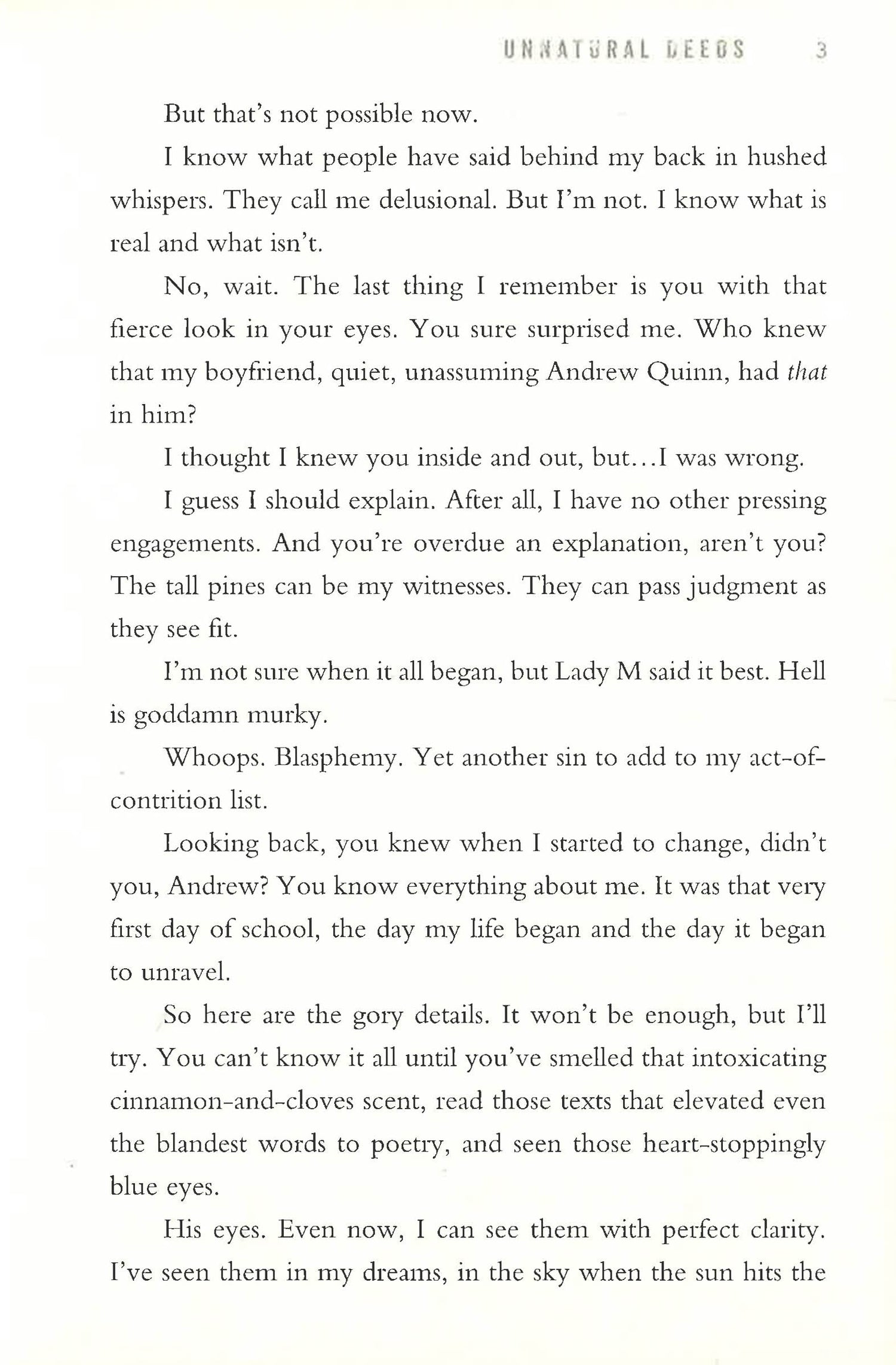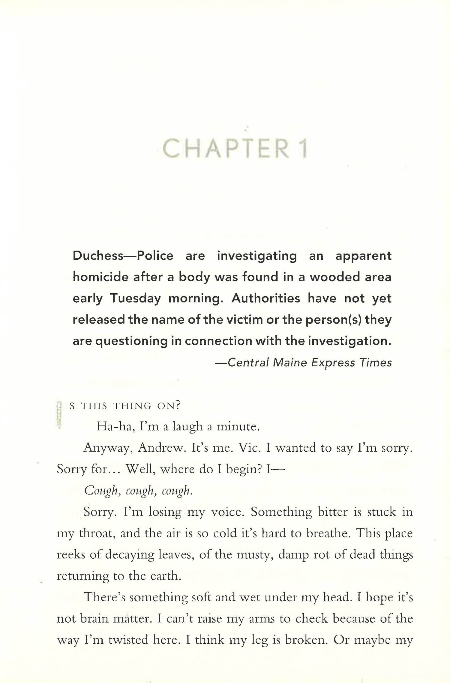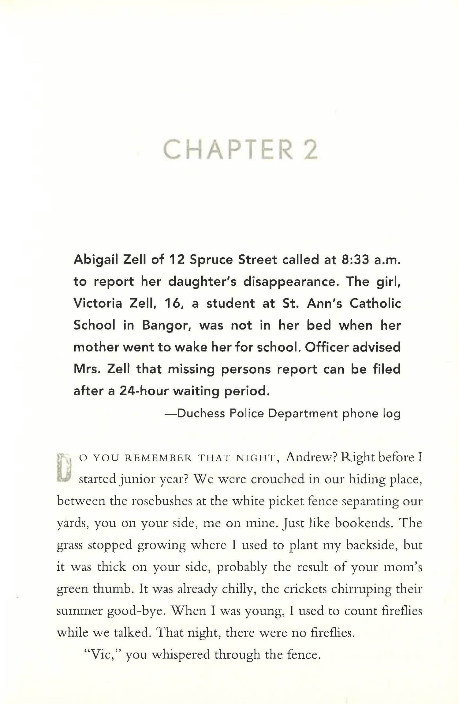 Secrets. Obsession. Murder. Victoria is about to discover just how dangerous it can be to lose yourself. Victoria Zell doesn't fit in, not that she cares what anyone thinks. She and her homeschooled boyfriend, Andrew, are inseparable. All they need is each other. That is, until Zachary Zimmerman joins her homeroom. Within an hour of meeting, he convinces good-girl Vic to cut class. And she can't get enough of that rush. Despite Vic's loyalty to Andrew, she finds her life slowly entwining with Z's. Soon she's lying to everyone she knows in an effort to unravel Z's secrets. Except Z's not the only one with a past. Victoria's hiding her own secrets, secrets that will come back to haunt her...and destroy everything in her path.