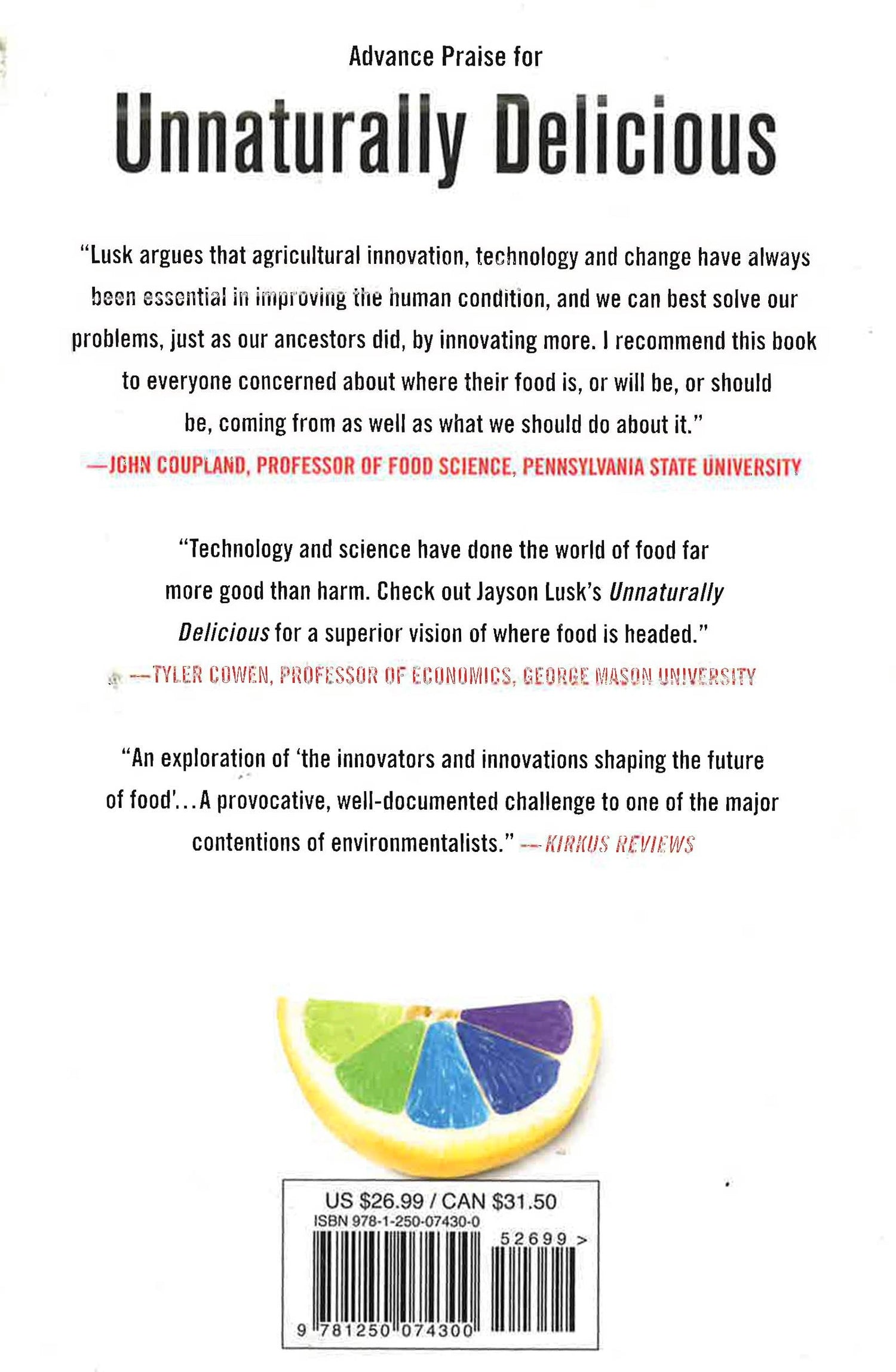 The food discussion in America can be quite pessimistic. With high obesity rates, diabetes, climate change, chemical use, water contamination, and farm animal abuse, it would seem that there wasn't very much room for a positive perspective. The fear that there just isn't enough food has expanded to new areas of concern about water availability, rising health care costs, and dying bees.In Unnaturally Delicious, Lusk makes room for optimism by writing the story of the changing food system, suggesting that technology and agriculture can work together in a healthy and innovative way to help solve the world's largest food issues and improve the farming system as we know it.This is the story of the innovators and innovations shaping the future of food. You’ll meet an ex-farmer entrepreneur whose software is now being used all over the world to help farmers increase yields and reduce nutrient runoff and egg producers who’ve created new hen housing systems that improve animal welfare at an affordable price. There are scientists growing meat in the lab. Without the cow. College students are coaxing bacteria to signal food quality and fight obesity. Nutrient enhanced rice and sweet potatoes are aiming to solve malnutrition in the developing world. Geneticists are creating new wheat varieties that allow farmers sustainably grow more with less. And, we’ll learn how to get fresh, tasty, 3D printed food at the touch of a button, perhaps even delivered to us by a robotic chef. Innovation is the American way. Thomas Jefferson, George Washington Carver, and John Harvey Kellogg were food and agricultural entrepreneurs. Their delicious innovations led to new healthy, tasty, convenient, and environmentally friendly food. The creations were unnaturally delicious. Unnatural because the foods and practices they fashioned were man-made solutions to natural and man-made problems. Now the world is filled with new challenges changing the way we think about food. Who are the scientists, entrepreneurs, and progressive farmers who meet these challenges and search for solutions? Unnaturally Delicious has the answers.
