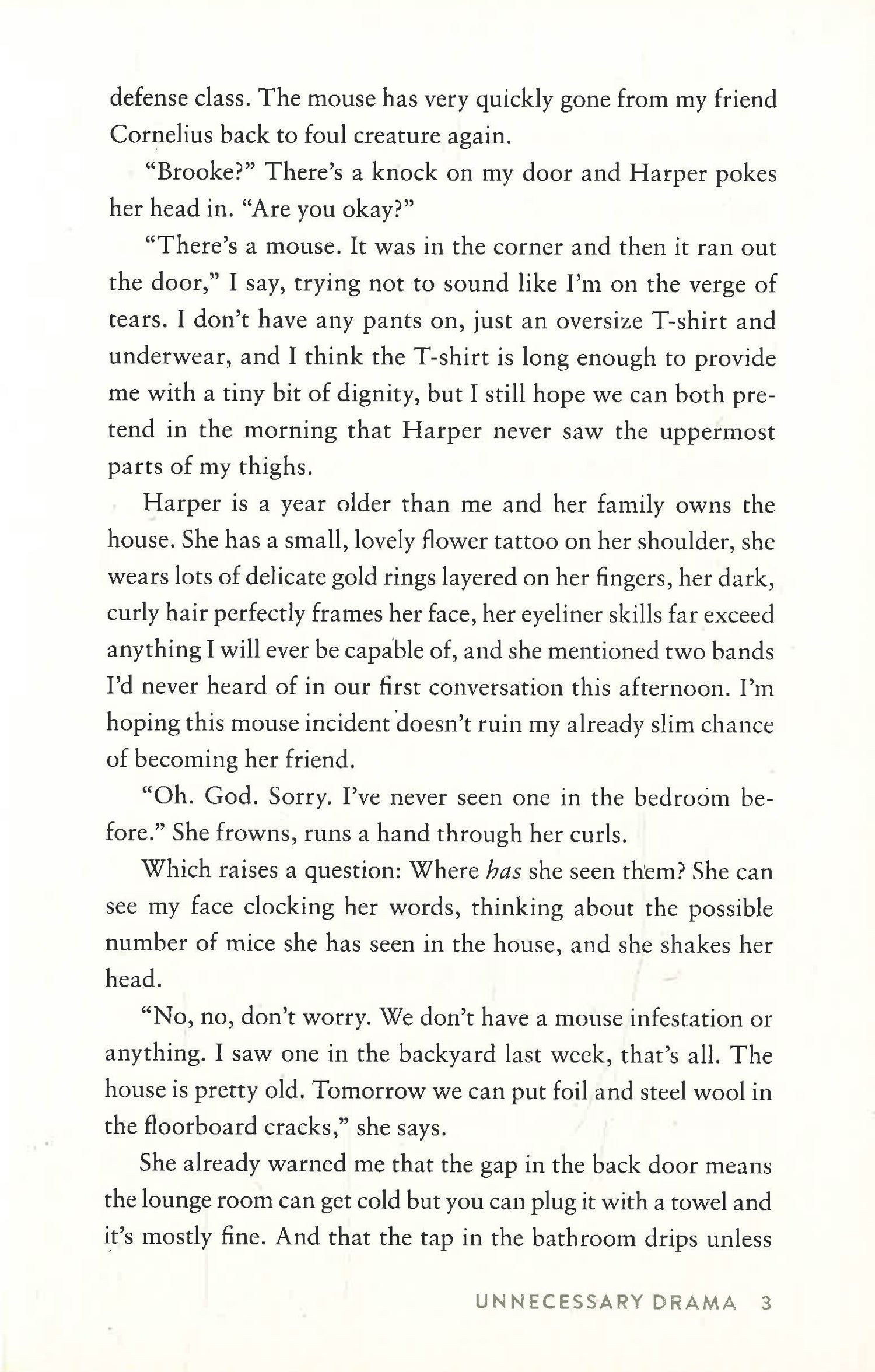 Her student housing only has one rule: "no unnecessary drama." Which means no fights, tension, or romance between roommates. When one of them turns out to be Jesse, her high-school nemesis, Brooke is determined she can handle it. They’ll simply silently endure living together and stay out of each other’s way. But it turns out Jesse isn’t so easy to ignore.