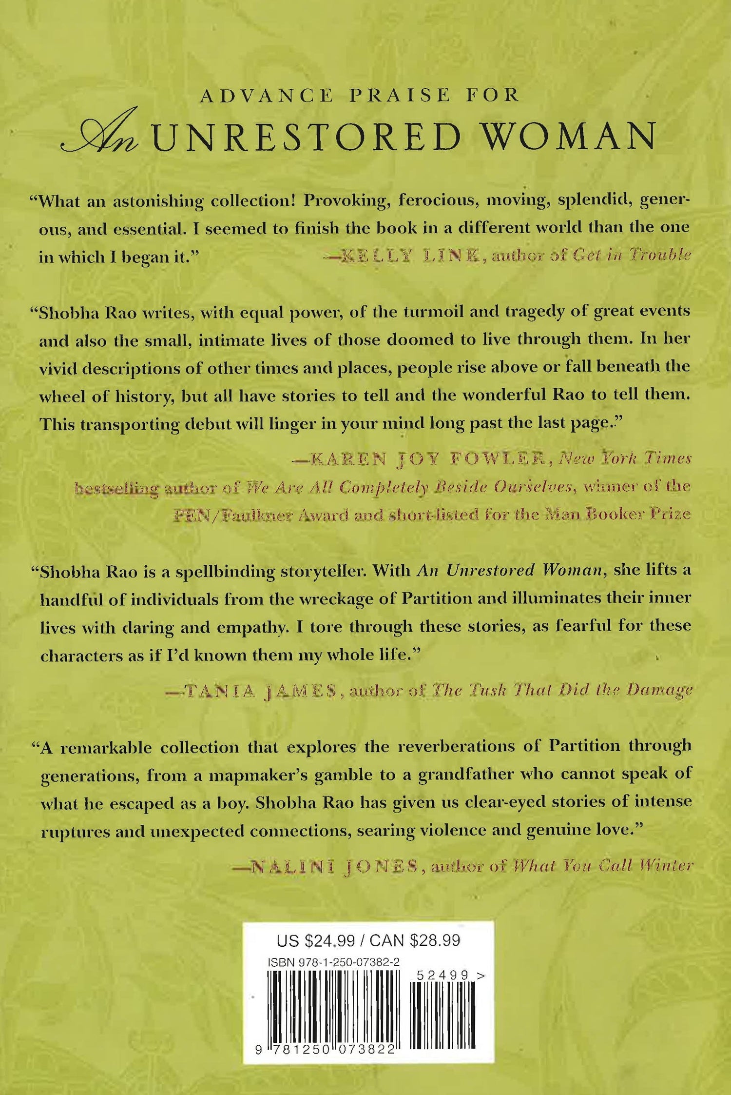 An Unrestored Woman explores the fault lines in this mass displacement of humanity: a new mother is trapped on the wrong side of the border; a soldier finds the love of his life but is powerless to act on it; an ambitious servant seduces both master and mistress; a young prostitute quietly, inexorably plots revenge on the madam who holds her hostage. Caught in a world of shifting borders, Rao's characters have reached their tipping points.