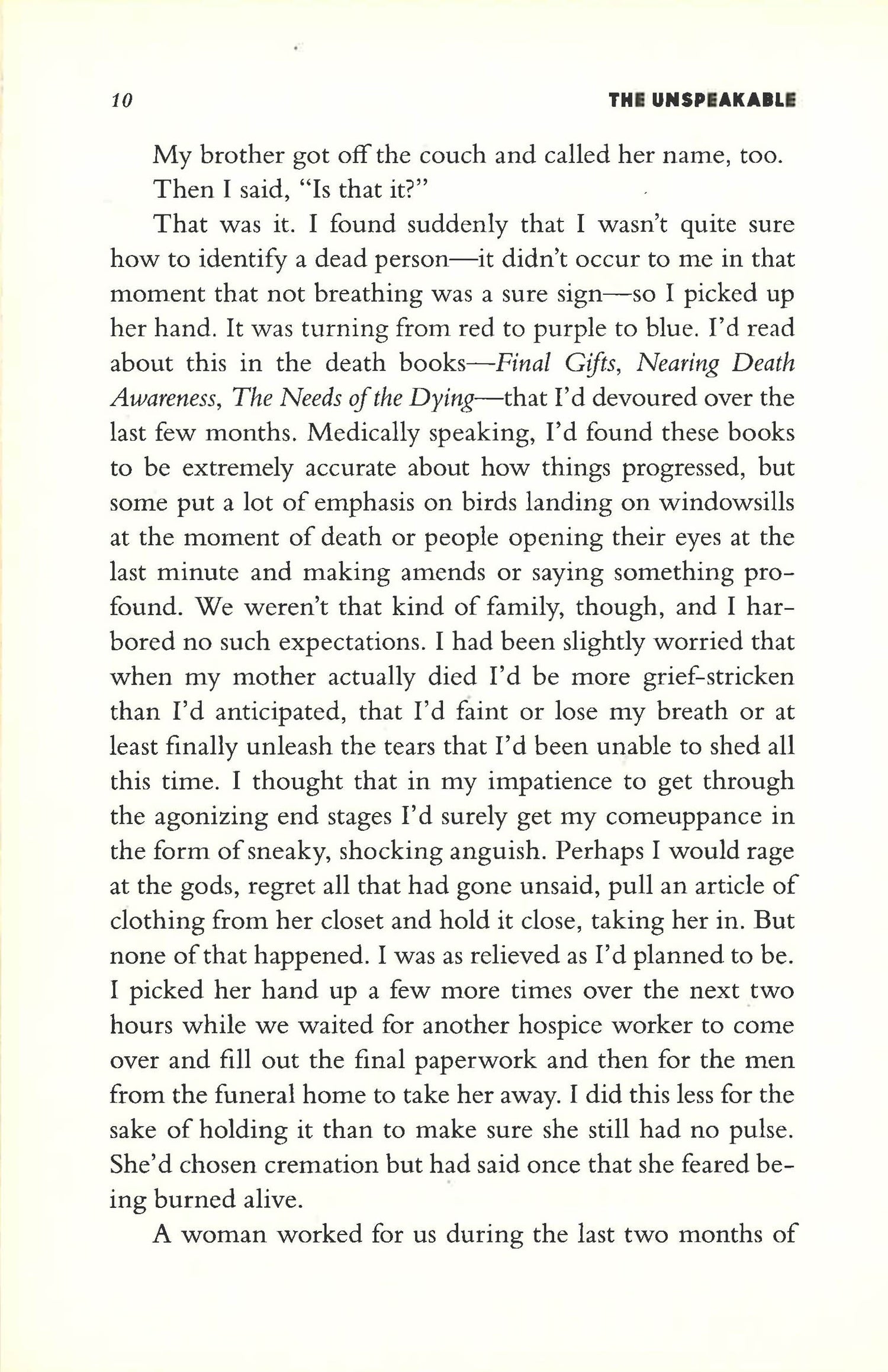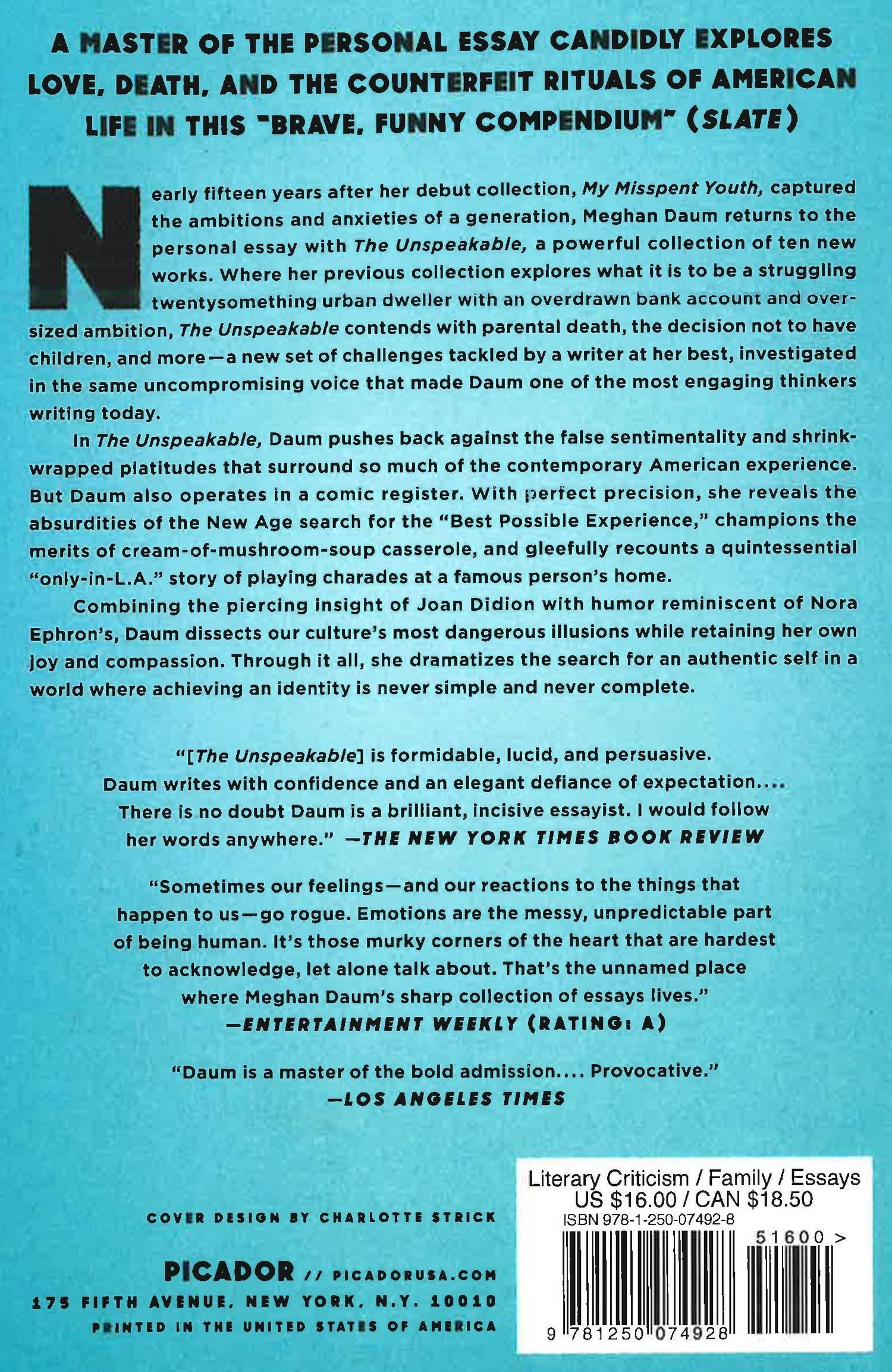 A master of the personal essay candidly explores love, death, and the counterfeit rituals of American life in this "brave, funny compendium" (Slate) Nearly fifteen years after her debut collection, My Misspent Youth, captured the ambitions and anxieties of a generation, Meghan Daum returns to the personal essay withThe Unspeakable, a powerful collection of ten new works. Where her previous collection explores what it is to be a struggling twenty-something urban dweller with an overdrawn bank account and oversized ambition, The Unspeakable contends with parental death, the decision not to have children, and more - a new set of challenges tackled by a writer at her best, investigated in the same uncompromising voice that made Daum one of the most engaging thinkers writing today. In The Unspeakable, Daum pushes back against the false sentimentality and shrink-wrapped platitudes that surround so much of the contemporary American experience. But Daum also operates in a comic register. With perfect precision, she reveals the absurdities of the New Age search for the "Best Possible Experience," champions the merits of cream-of-mushroom-soup casserole, and gleefully recounts a quintessential "only-in-L.A." story of playing charades at a famous person's home. Combining the piercing insight of Joan Didion with humor reminiscent of Nora Ephron's, Daum dissects our culture's most dangerous illusions while retaining her own joy and compassion. Through it all, she dramatizes the search for an authentic self in a world where achieving an identity is never simple and never complete.