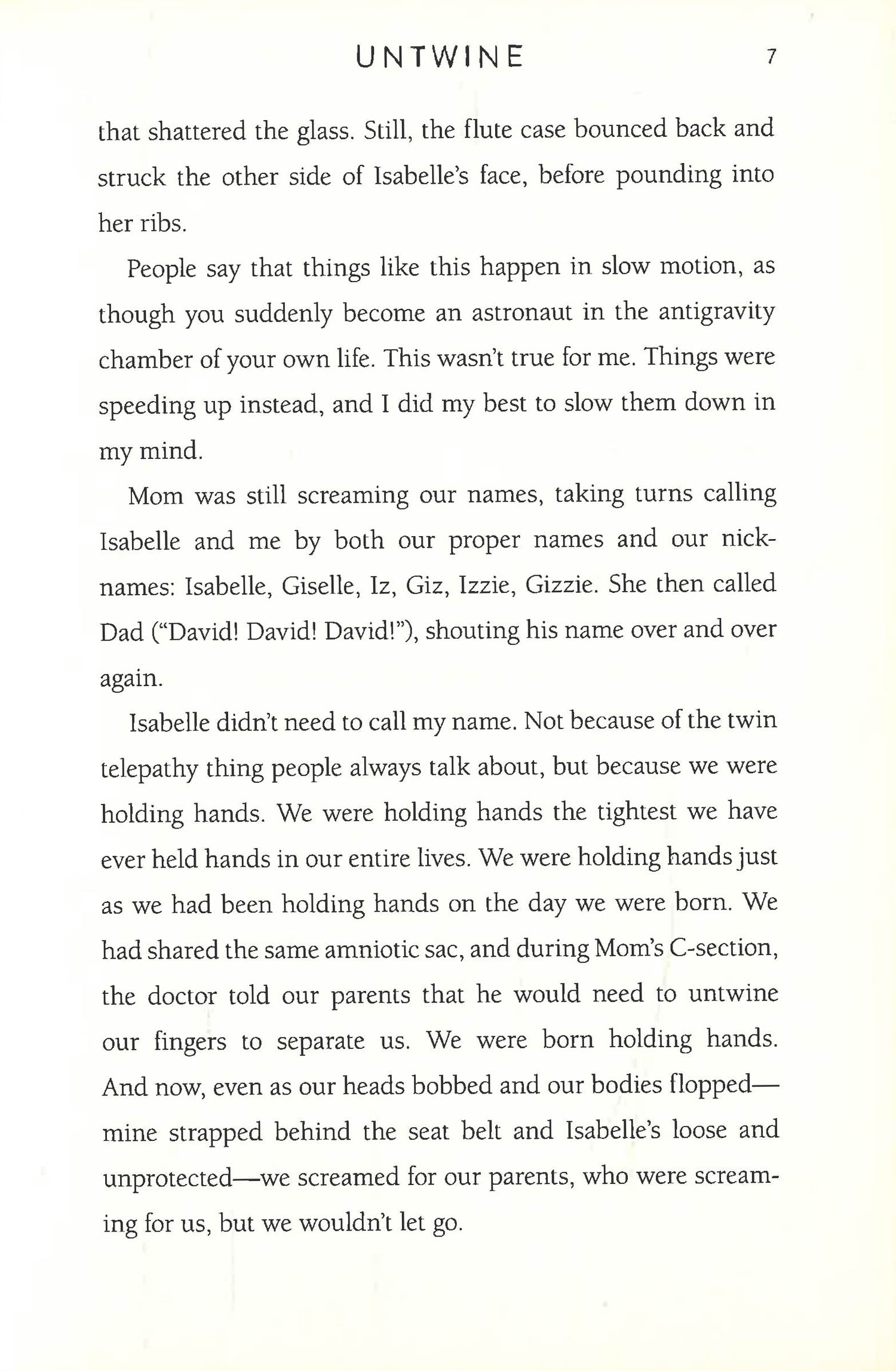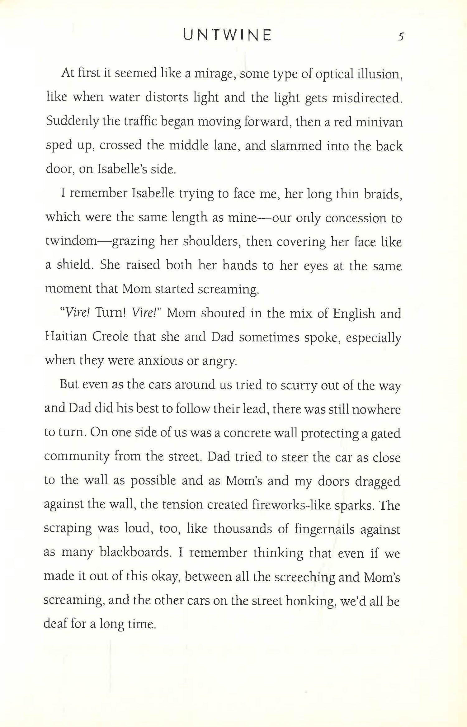 Giselle Boyer and her identical twin, Isabelle, are as close as sisters can be, even as their family seems to be unraveling. Then the Boyers have a tragic encounter that will shatter everyone's world forever.Giselle wakes up in the hospital, injured and unable to speak or move. Trapped in the prison of her own body, Giselle must revisit her past in order to understand how the people closest to her -- her friends, her parents, and above all, Isabelle, her twin -- have shaped and defined her. Will she allow her love for her family and friends to lead her to recovery? Or will she remain lost in a spiral of longing and regret?Untwine is a spellbinding tale, lyrical and filled with love, mystery, humor, and heartbreak. Award-winning author Edwidge Danticat brings her extraordinary talent to this graceful and unflinching examination of the bonds of friendship, romance, family, the horrors of loss, and the strength we must discover in ourselves when all seems hopeless.