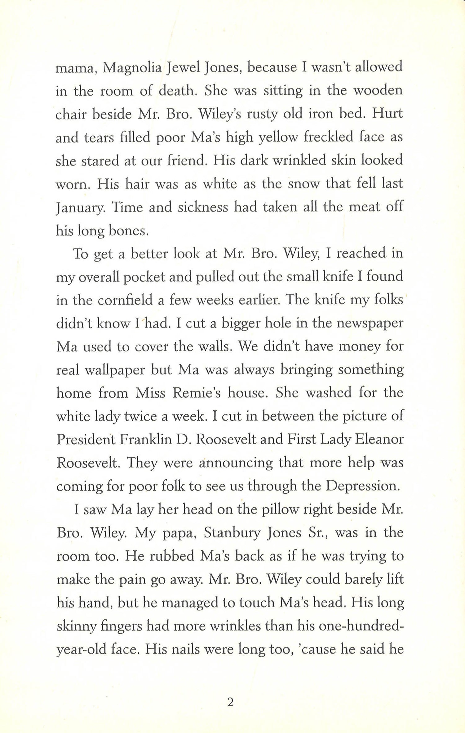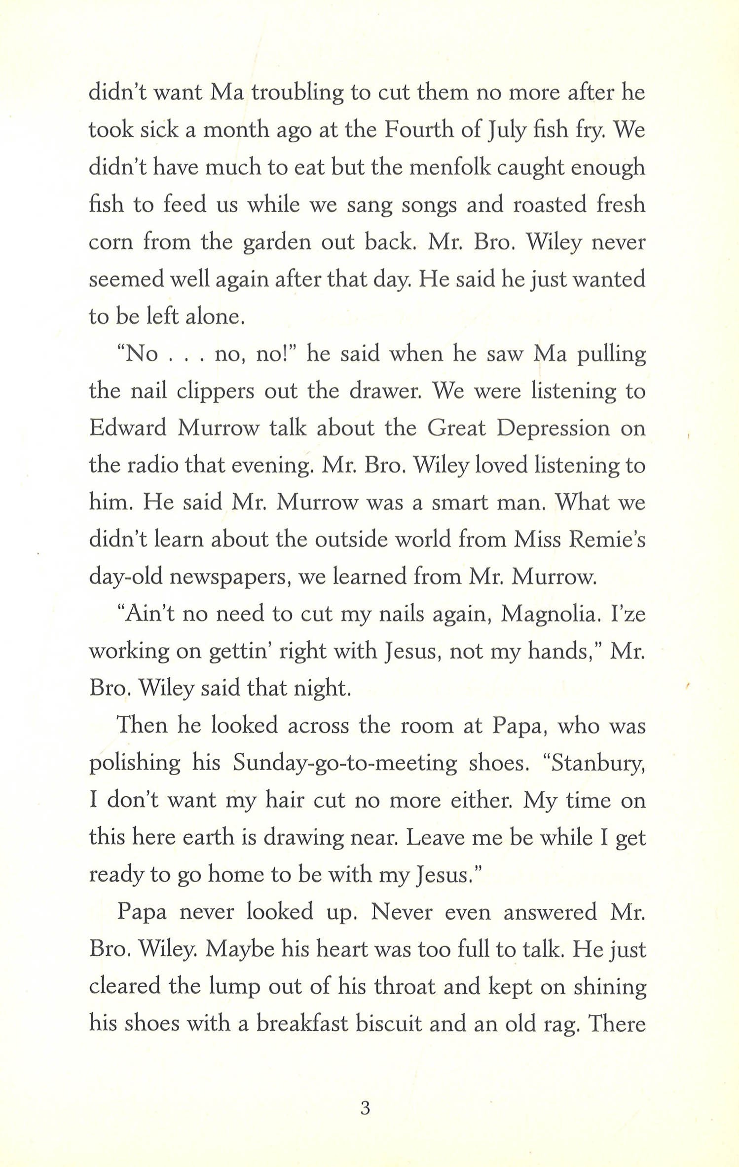 When Mr. Bro. Wiley, Bean's adopted grandfather and the last slave man around, dies in the summer of 1940, Bean and his very best friend Pole are some kind of hurt. Everyone in the Low Meadows is. Despite their grief, they are proud and excited to be included in their very first Sittin' Up--a wake for the dead. Bean and Pole know this special week will be one to remember, especially if the coming storm has its way and riles up Ole River enough to flood the Low Meadows right in the middle of Mr. Bro. Wiley's Sittin' Up. Shelia P. Moses tells her most charming story yet. Laced with humor and a lot of heart, this is an affecting, fun tale from a storytelling master.
