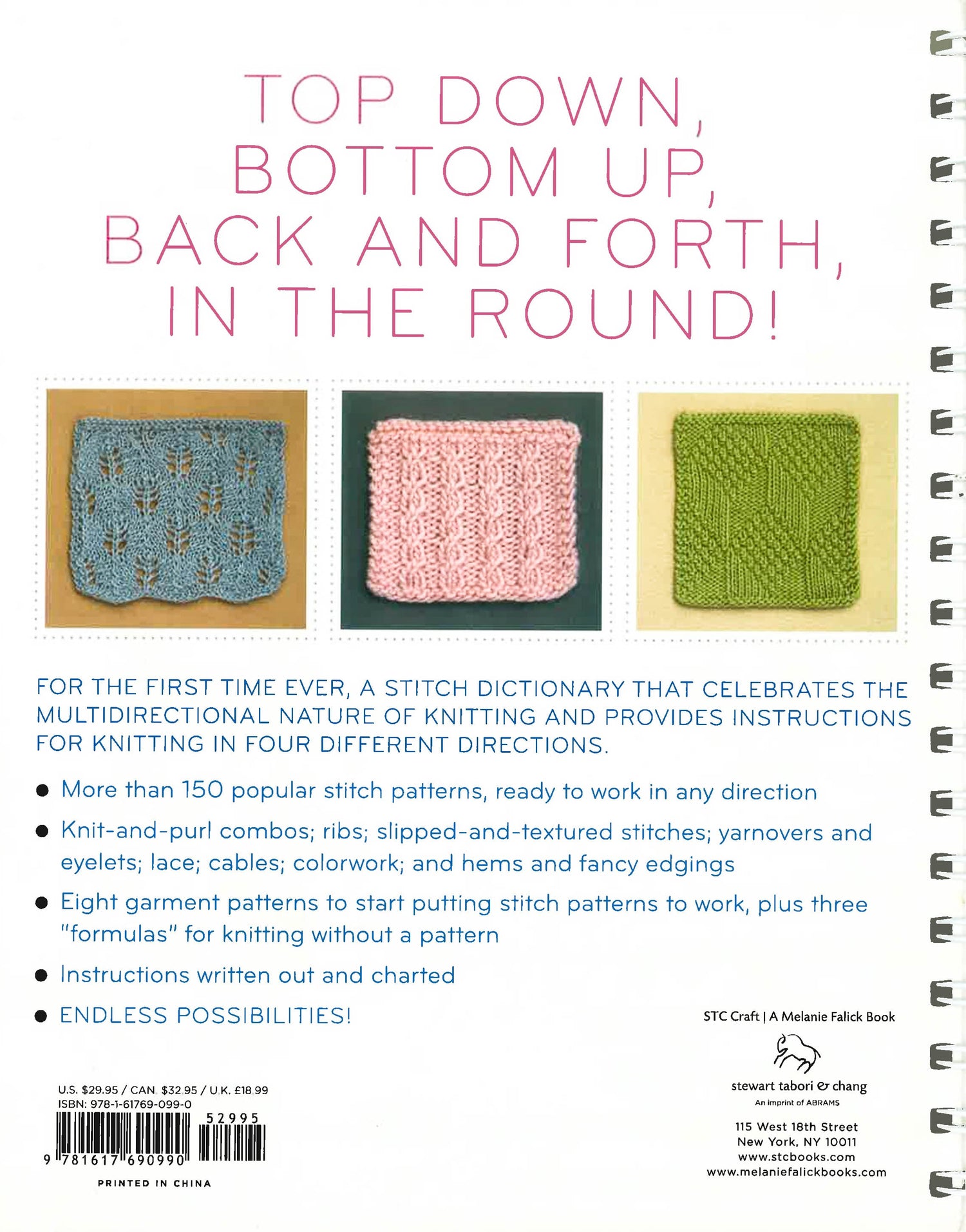 Stitch dictionaries are to knitters what Webster’s is to a writer. Within the pages of these inspiring reference books are the endless variations of knit and purl stitches that produce the fabrics of all knitting. But in the Up, Down, All-Around Stitch Dictionary, designer Wendy Bernard does something no other author has done before — she presents instructions for working 150 popular stitch patterns four different ways: top down, bottom up, back and forth, and in the round. This hefty collection, ranging from lace and cables to colorwork and fancy edgings, is loaded with beautifully photographed swatches of each pattern, plus charted and text instructions. To showcase the stitch patterns in action, Bernard also includes instructions for eight garments as well as her famous formulas for knitting garments without a pattern. This is an invaluable go-to resource, sure to inspire legions of knitters to use stitch patterns in new and exciting ways.