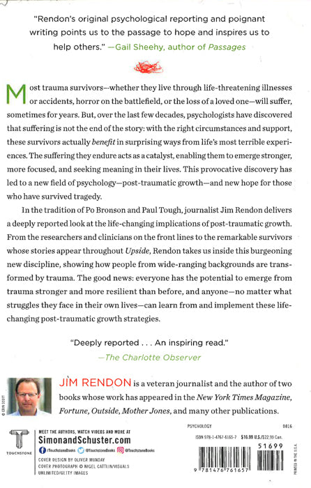 What if there?s an upside to experiencing trauma?Most survivors of trauma - whether they live through life-threatening illnesses or accidents, horror on the battlefield, or the loss of a loved one - can suffer for months, even years. But recently, psychologists have discovered that PTSD, or Post-Traumatic Stress Disorder, is only a piece of the whole experience. With the right circumstances and proper support, many trauma survivors also benefit after a terrible experience. They emerge stronger, more focused, and with a new perspective on their future.In the tradition of Po Bronson and Paul Tough, journalist Jim Rendon delivers a deeply reported and unique look at the life-changing implications of post-traumatic growth. The pain and anguish caused by traumatic events can become a force for dramatic life change. It can move people to find deeper meaning in their lives and drive them to help others. But how can terrible experiences lead to remarkable, positive breakthroughs?Upside seeks to answer just that by taking a penetrating look at this burgeoning new field of study. Comprised of interviews with leading researchers and dozens of inspiring stories, Rendon paints a vivid and comprehensive portrait of this groundbreaking field and offers a roadmap for anyone trying to understand how personal tragedy can lead to a more hopeful and positive future.