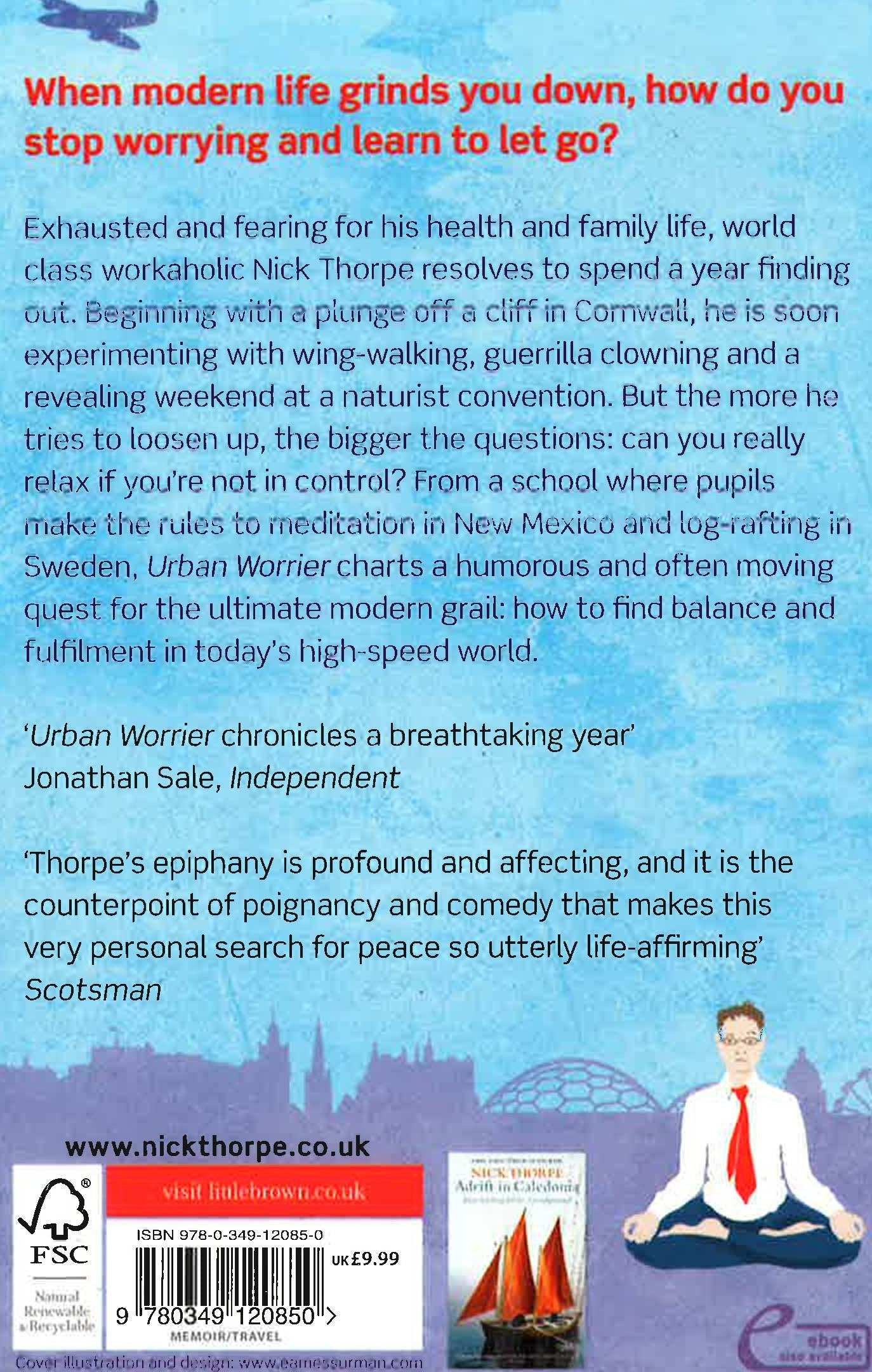 Hunched exhausted at his computer one ordinary Monday morning, world-class workaholic Nick Thorpe has reached the end of his tether. Fearing for his health and family life, he knows something has to change. But where to start when trying too hard is part of the problem?Nick makes a bold resolution: he will spend a year learning to let go. Beginning with a plunge off a Cornish cliff, he soon graduates to wing-walking on a bi-plane, city-centre clowning and a revealing weekend at a naturist convention. But the more he tries to relax, the bigger the questions: can you be happy if you're not in control? Is true contentment all in the mind? And what does his small, brown dog know that Nick doesn't? From a school where pupils make the rules, to meditation and rafting in Sweden; from the chaos of a Durban street shelter to a silent monastery in New Mexico, URBAN WORRIER charts a humorous and often moving quest for the ultimate modern grail: how to find balance and fulfilment in today's high-speed world.