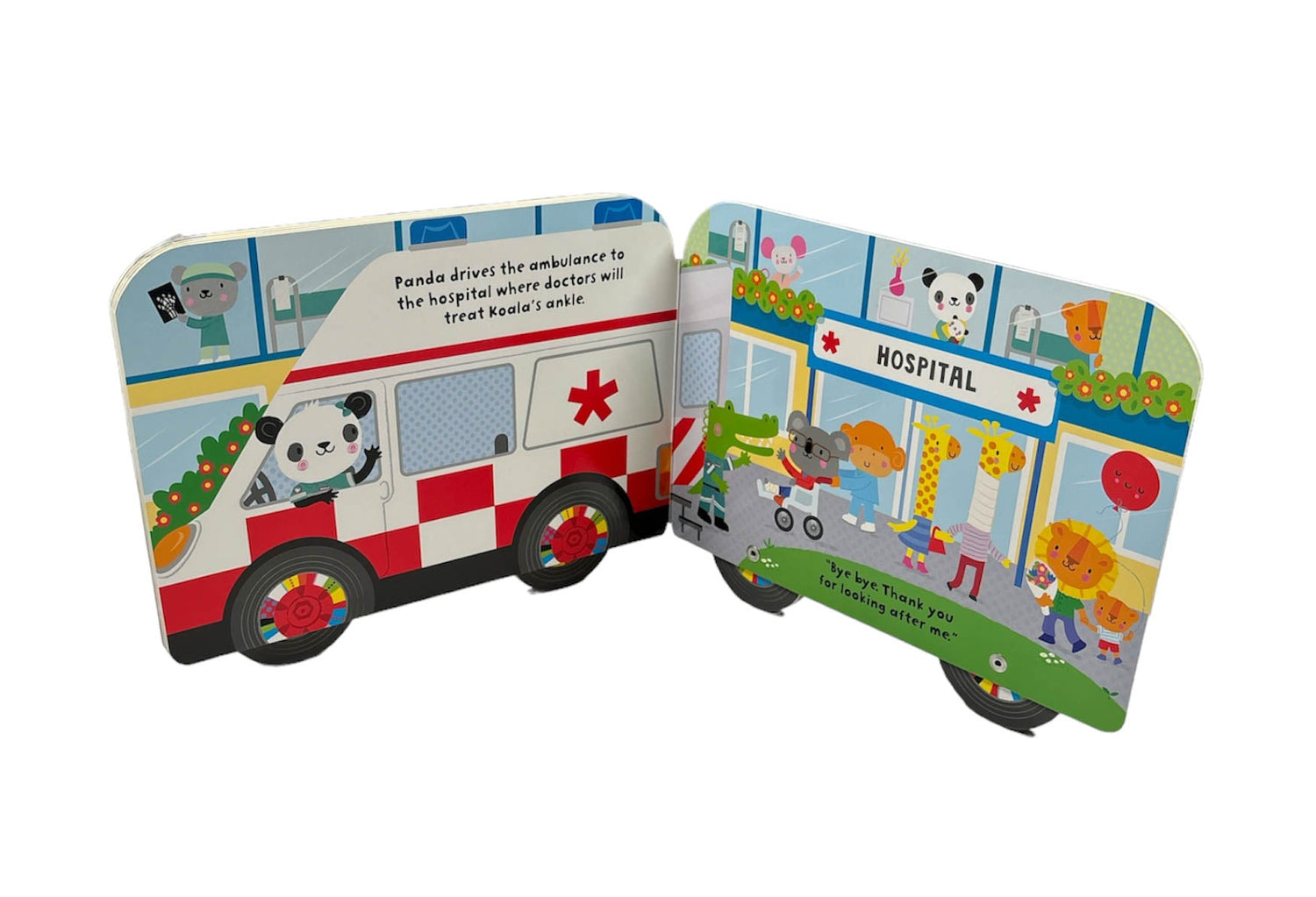 A bright board book with wheels that really go round and round, ideal for small children who are fascinated by emergency vehicles and the noise they make. Inside is a gentle story of an everyday ambulance rescue by a team of friendly animals.