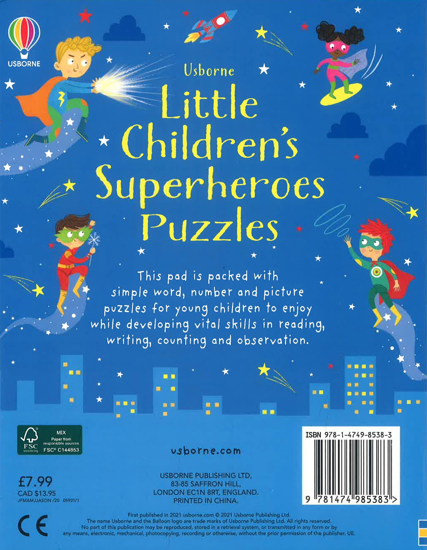 Keep little superheroes entertained with this handy activity book, bursting with superhero-themed picture puzzles, dot-to-dots, spot-the-differences, simple wordsearches and more. Speed through a maze to the villain's lair, spot the difference between super-suits and vehicles, complete a superpowers wordsearch and more.