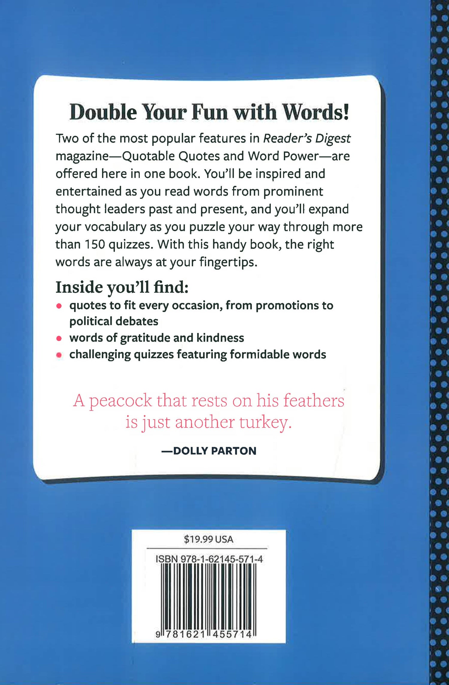 Following on the success of the first volume, Use Your Words, Volume 2, combines new selections from reader favorites Quotable Quotes and Word Power. Both of these columns have run in Reader’s Digest magazine for more than seventy years. In these pages you’ll find the best wit and wisdom from our brightest minds, along with more than fifty quizzes to enrich your vocabulary. With this gem in your hands, you’ll never be at a loss for just the right word.