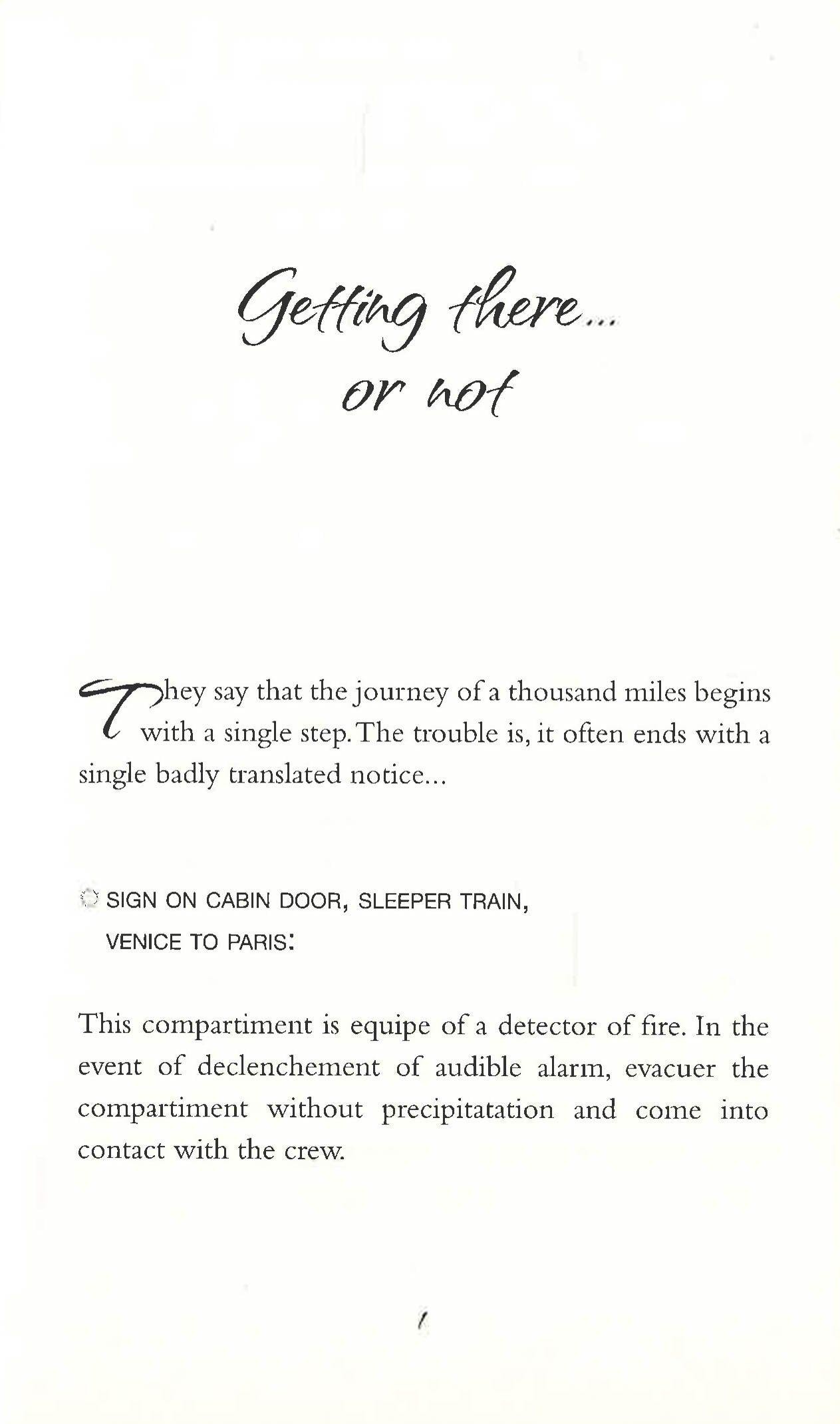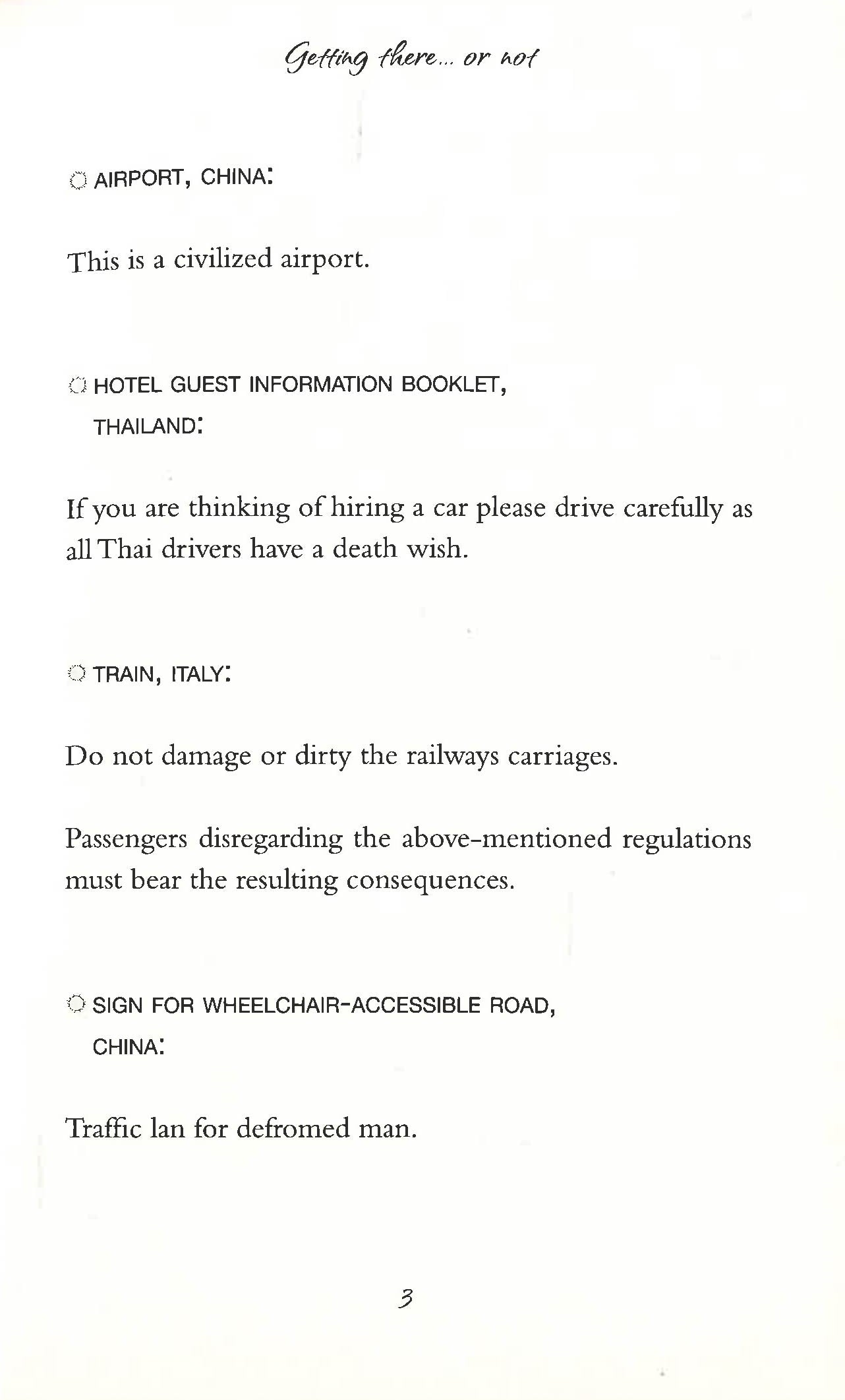 The search for the globe's funniest language howler continues apace. As with his two previous volumes, Charlie Croker has trawled hotel foyers in Kazakhstan, South Korean supermarkets and Argentinian airports, plucking from the mistranslation tree only the very choicest of fruits for your delectation. There is the French hotel advising that 'pets are not allowed in the breakfast'. The bar in Rome requesting that you 'use the arse-tray for your fags'. And the bookshop in China boasting a section titled 'sports and hobbits'. Who can tell what the Japanese camera manufacturer had in mind when they included 'beware the weatherly swell' in their instructions? Who would brave the Barcelona hotel where the pillows have 'firmness to take care of your cervicals'? Who could resist the Austrian restaurant offering 'Saddle of Rabbit in a vortex sheet'? This delightful book is an affectionate trawl through the gems that arise when people all round the world graciously indulge English speakers' shunning of any language but their own. In fact, some of the gems are home-grown: a Hertfordshire restaurant warns that 'any person consumed in the restaurant without paying will be prospected'.