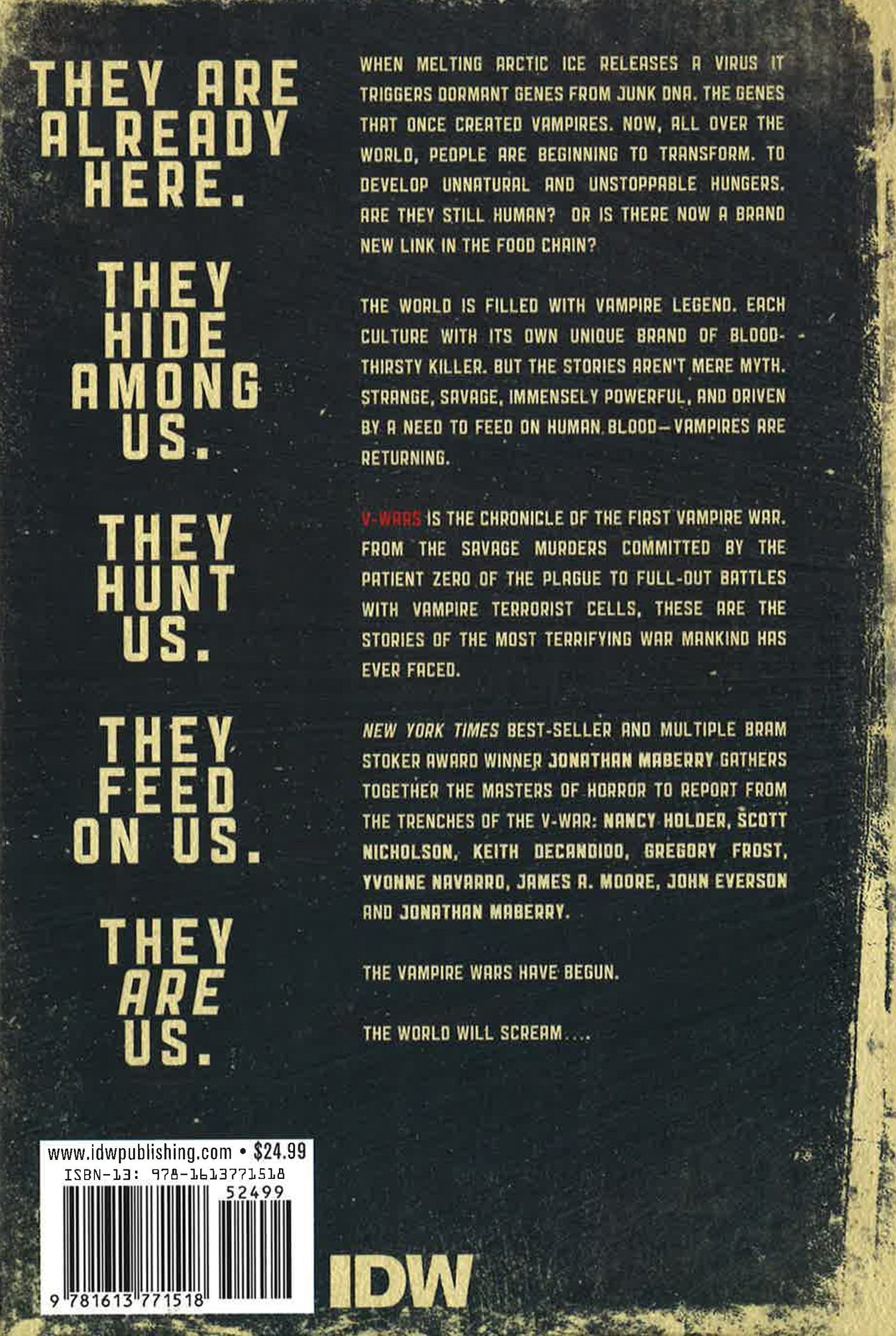 Soon to be a Netflix series starring Ian Somerhalder. A sweeping, threaded narrative of the global phenomenon known as the Vampire Wars! Mankind is silently infected by a millennia-old bacteria unknowingly exhumed by a scientific expedition in Antarctica. Now, in some rare cases, a person's so-called "junk DNA" becomes activated, and depending on their racial and ethnic heritage they begin to manifest one of the many diverse forms of the "others" that are the true basis for the legends of supernatural creatures. These aren't your usual vampires and werewolves -- it goes much deeper than that. Conceived by Jonathan Maberry, V Wars features stories from various "frontlines" as reported by such contributors as Nancy Holder, Yvonne Navarro, James A. Moore, Gregory Frost, John Everson, Keith R.A. DeCandido, and Scott Nicholson (as well as Maberry himself). The result is a compelling series of tales that create a unique chronicle of mankind's response to this sudden, hidden threat to humanity.