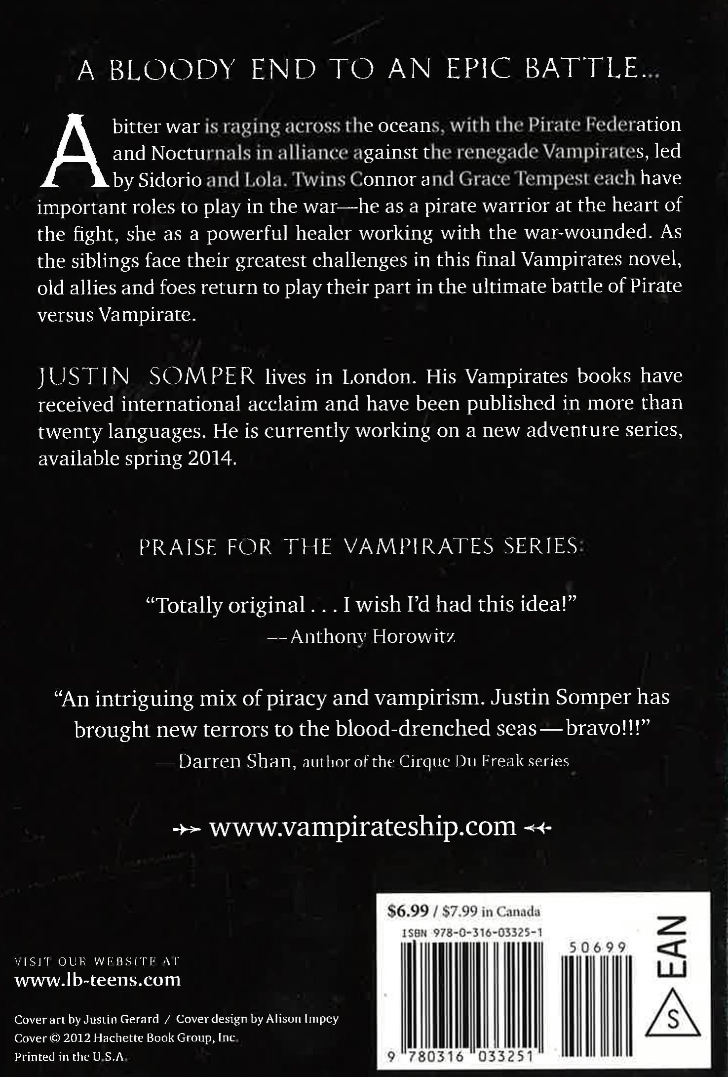 A bloody war is raging across the oceans, with the Pirate Federation and Nocturnals in alliance against the renegade Vampirates, led by Sidorio and Lola. Nothing will stop either one from making their presence dangerously known in battle. Connor and Grace Tempest each have important roles to play in the war - he as a pirate warrior at the heart of the fight; she as a powerful healer working with the war-wounded. As the twins face their greatest challenges to date, old allies and foes return to play their part in the ultimate battle of Pirate versus Vampirate. In this - the conclusion of this sequence of VAMPIRATES novels, the stakes are higher than ever. Relationships will change. An army of the dead will return to fight. There will be new threats and new alliances and characters will die before the ending which will see Grace and Connor poised to start momentous new journeys. In the words of Obsidian Darke, "So it ends, so it begins."