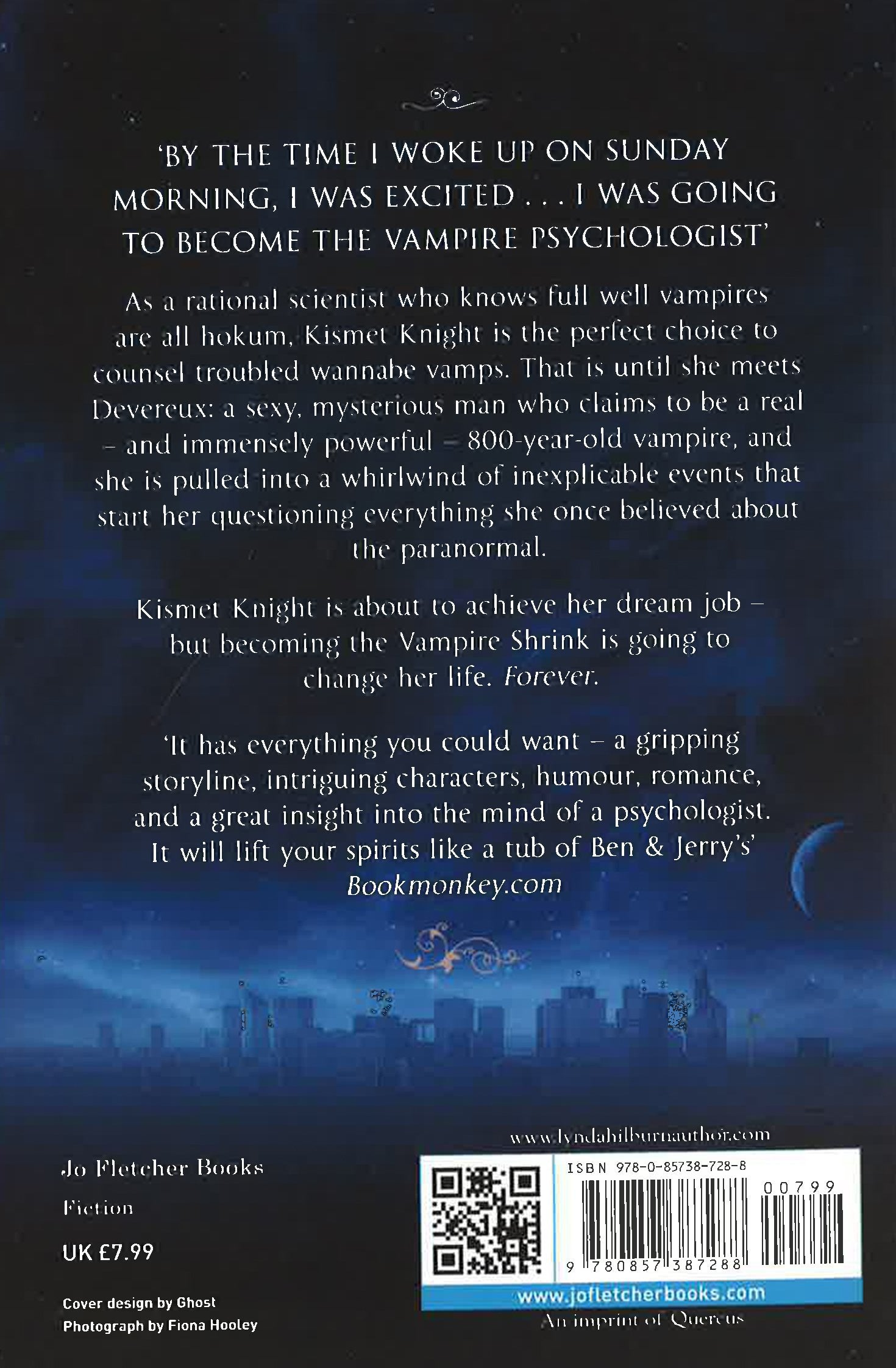 As a rational scientist who knows full well that vampires are all hokum, Kismet Knight is the perfect choice to counsel troubled wannabe vamps. That is until she meets Devereux: a sexy, mysterious man who claims to be a real - and immensely powerful - 800-year-old vampire. Before she knows what's happening, she is pulled into a whirlwind of inexplicable events that start her questioning everything she once believed about the paranormal. Kismet Knight is about to achieve her dream job - but becoming the Vampire Shrink is going to change her life. Forever.