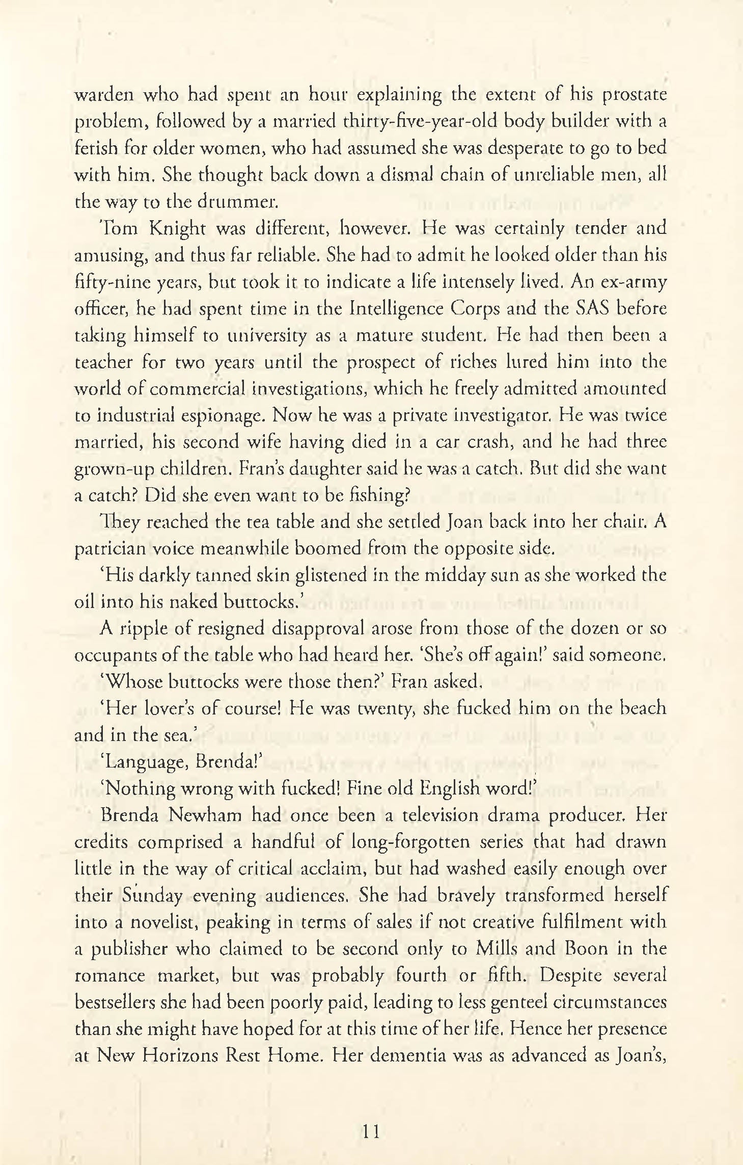 Ex-SAS officer Tom Knight is now a 73-year-old private detective in a seaside town, with a bad leg, a taste for good weed and a morbid fear of growing old. He’s also fallen in love with Fran, a sprightly 52-year-old carer at a retirement home. The bad news is that she’s dumped him for lying about his age.