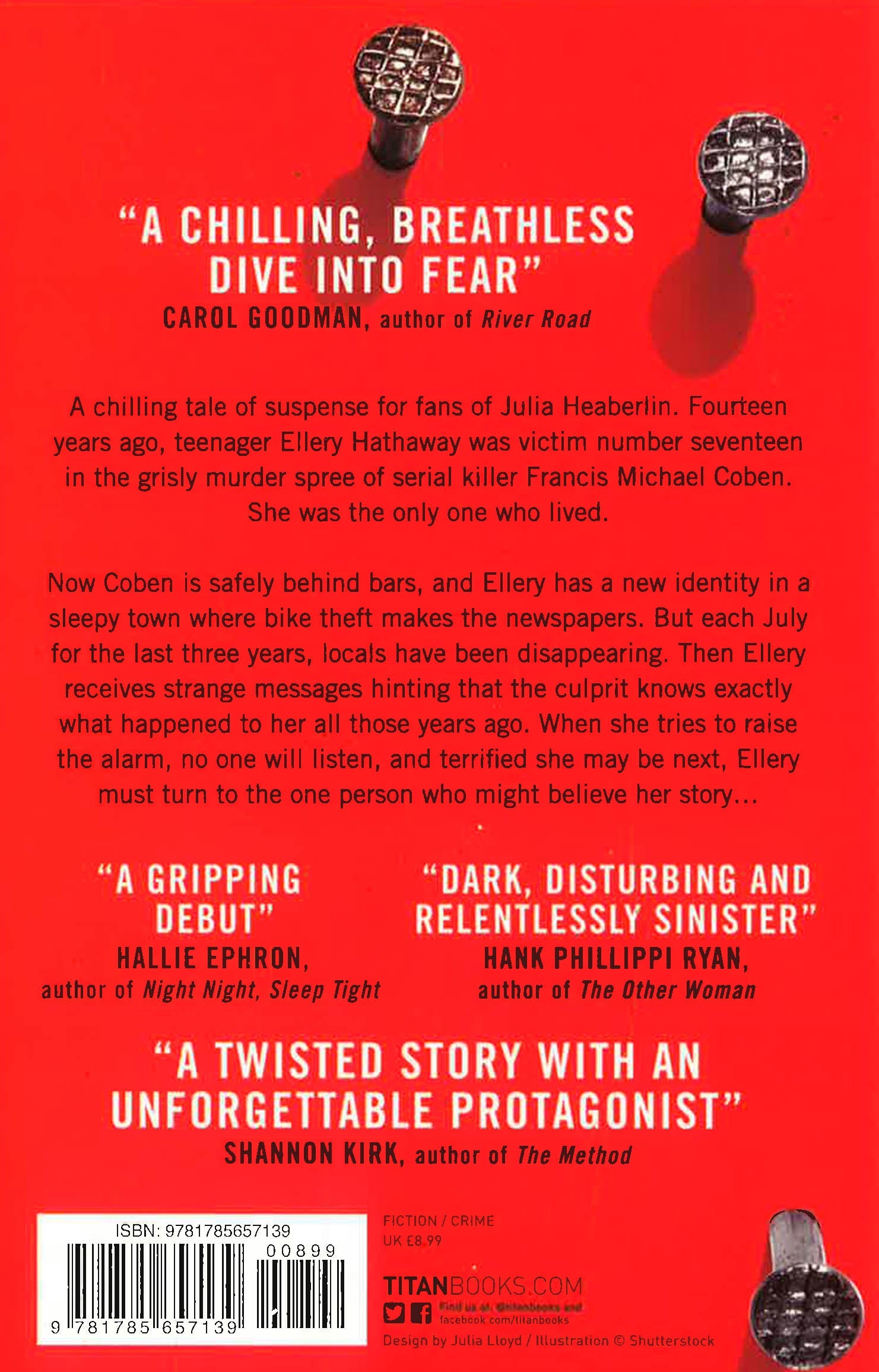 A chilling tale of suspense for fans of Julia Heaberlin. Fourteen years ago, teenager Ellery Hathaway was victim number seventeen in the grisly murder spree of serial killer Francis Michael Coben. She was the only one who lived. Now Coben is safely behind bars, and Ellery has a new identity in a sleepy town where bike theft makes the newspapers. But each July for the last three years, locals have been disappearing. Then Ellery receives strange messages hinting that the culprit knows exactly what happened to her all those years ago. When she tries to raise the alarm, no one will listen, and terrified she may be next, Ellery must turn to the one person who might believe her story...