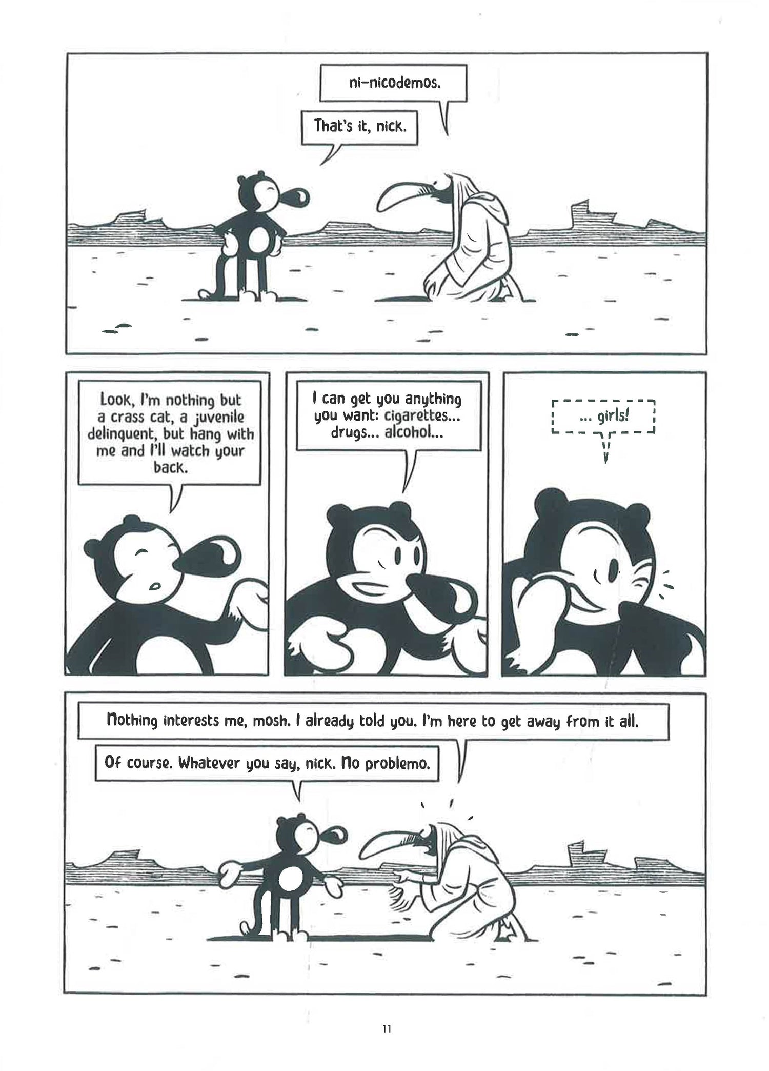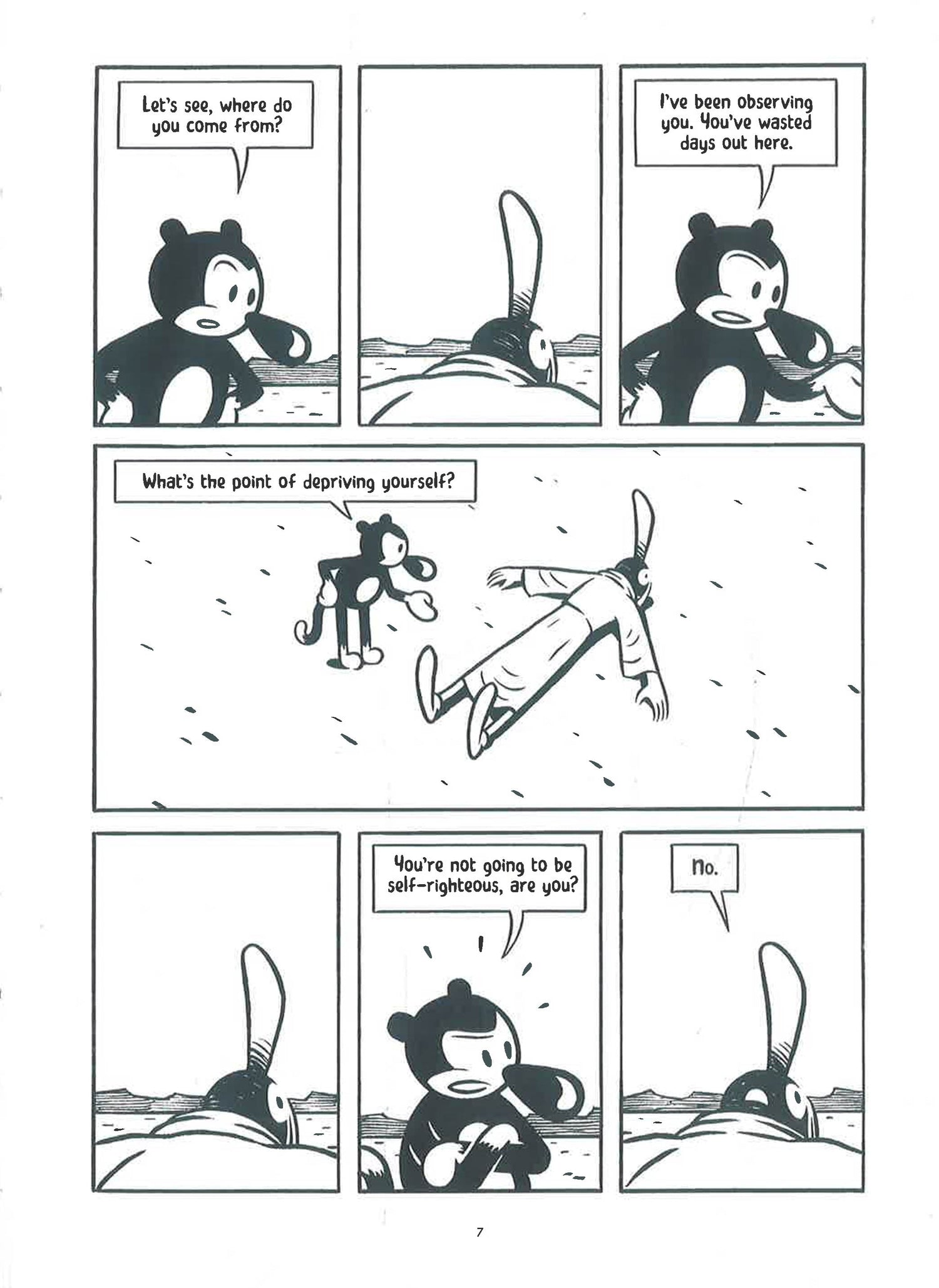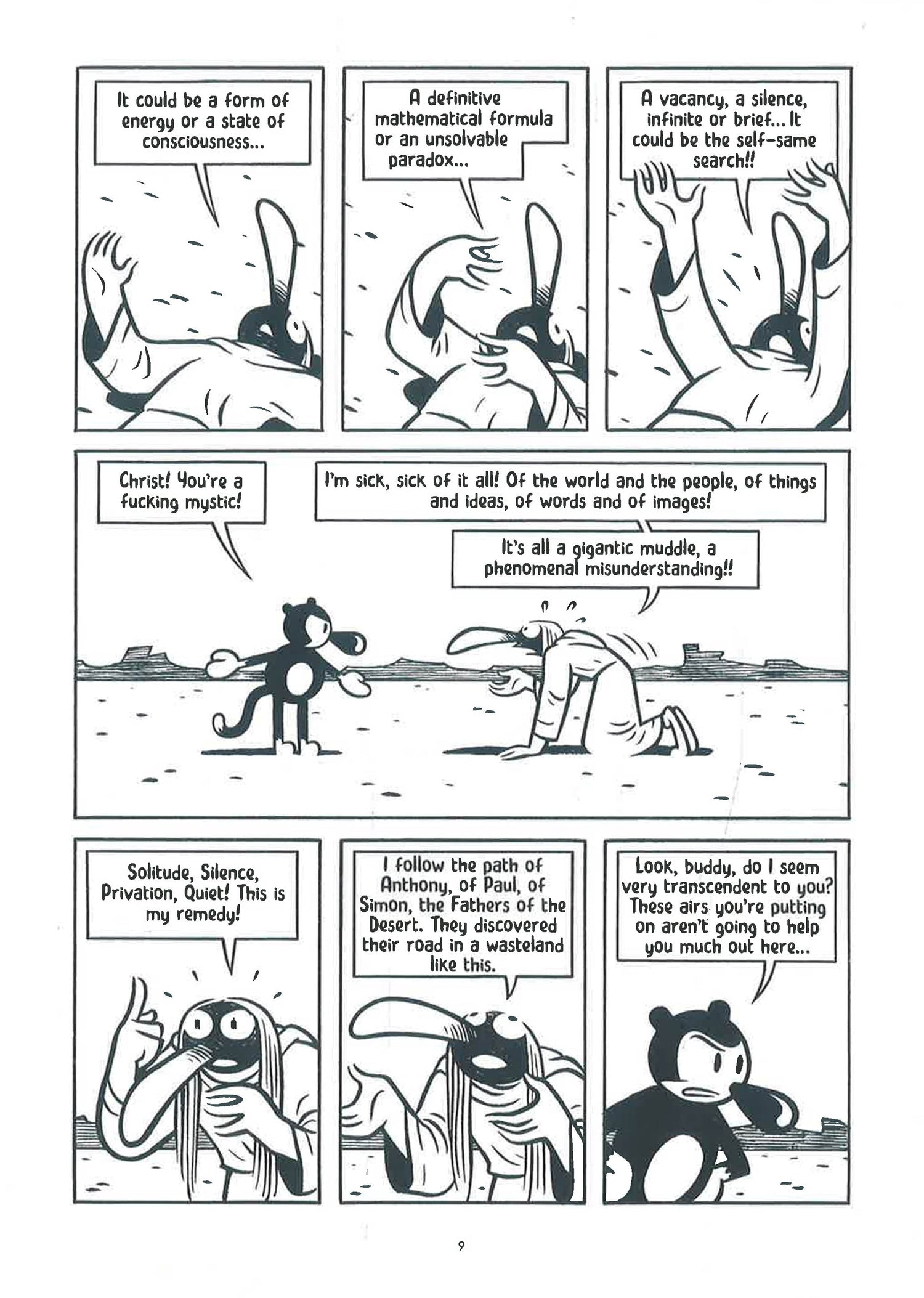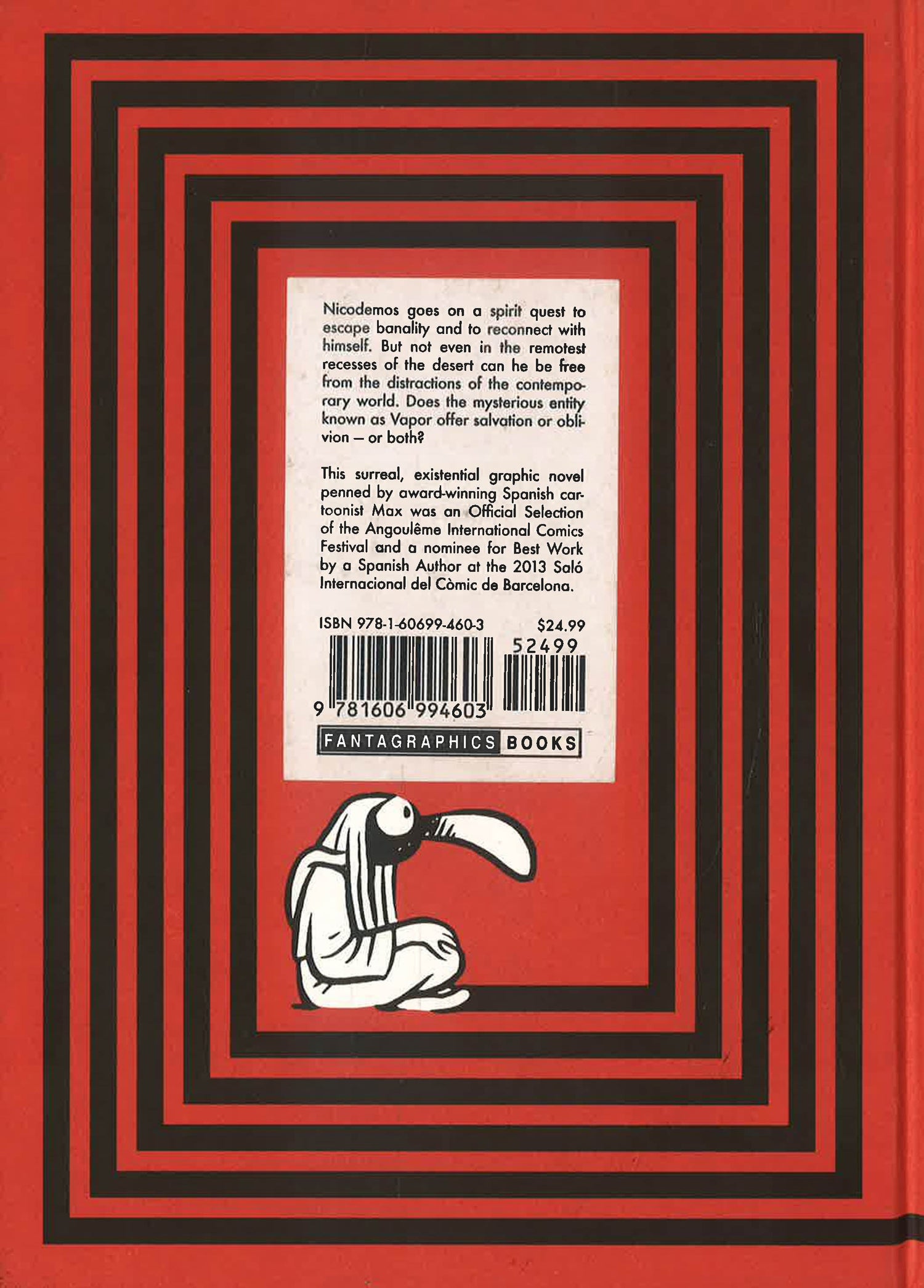 Disgusted and appalled with the todays noisy and noisome world in which all is spectacle and surface sensation, Nick flees into the solitude of the desert. But even as he manages to recover some sort of spiritual balance thanks to ascetic regimen of fasting and meditation, Nick is seduced by the most spectacular and mesmerizing spectacle of all time: The procession of the Queen of Saba. In Vapor, the award-winning Spanish cartoonist Max (best known for his 2006 book Bard the Superrealist) once again engages in delightful philosophical mind games, starring another wildly stylized and endearing protagonist this time deploying a striking, crisp black and white graphic style perfectly suited for this desert-based fantasia.