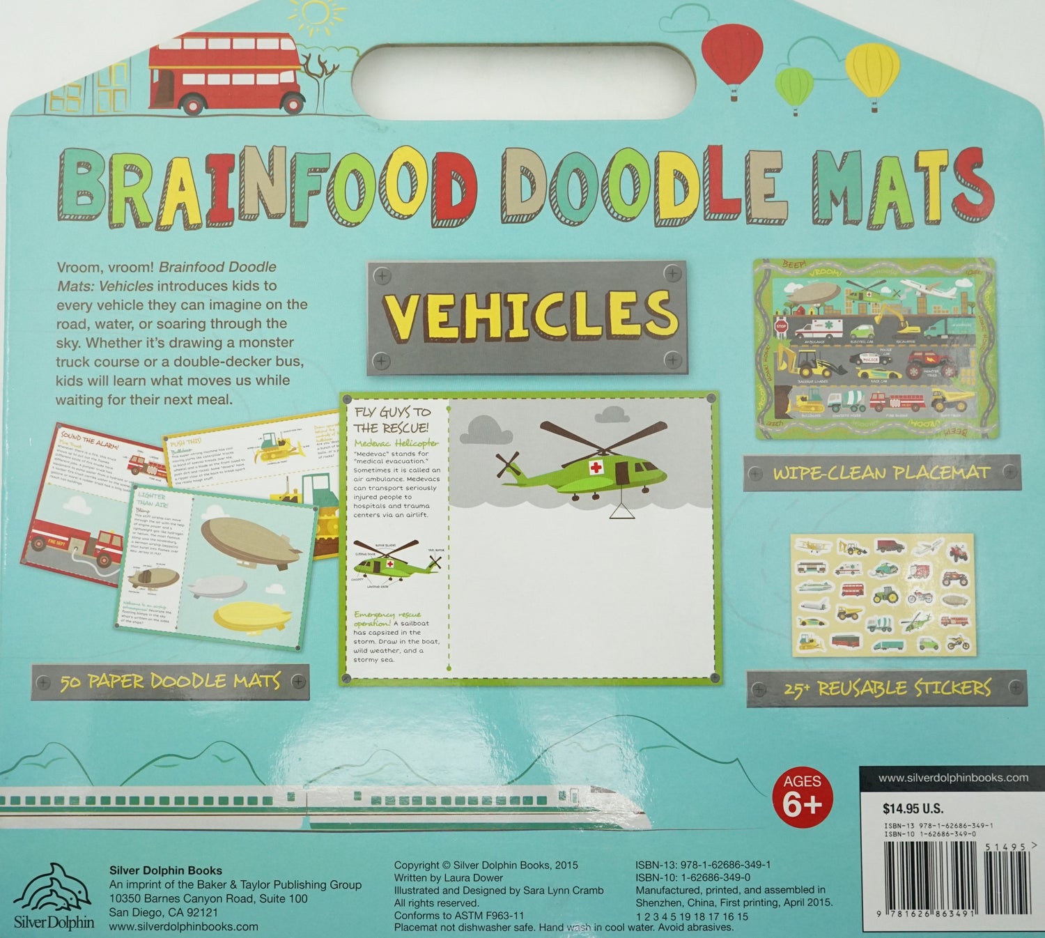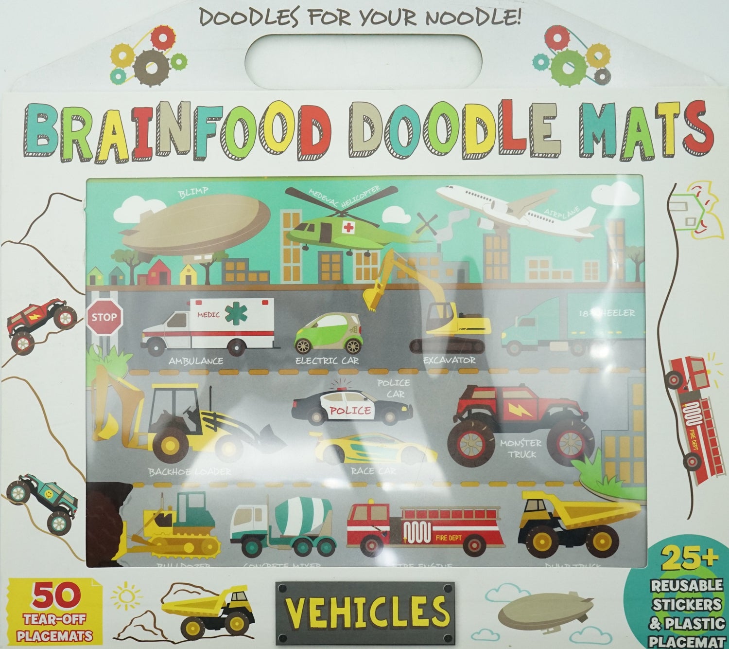 Brainfood Doodle Mats: Vehicles introduces kids to every vehicle they can imagine on the road, water, or soaring through the sky. Whether it's drawing a monster truck course or a double-decker bus, kids will learn what moves us while waiting for their next meal. Includes 50 tear-off placemats, 25 reusable stickers, and plastic placemat.