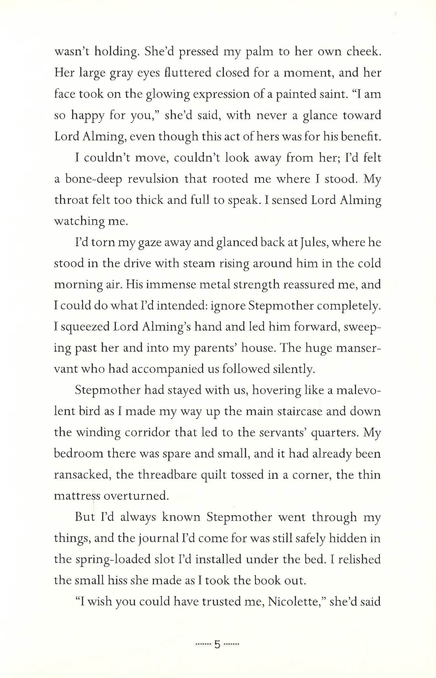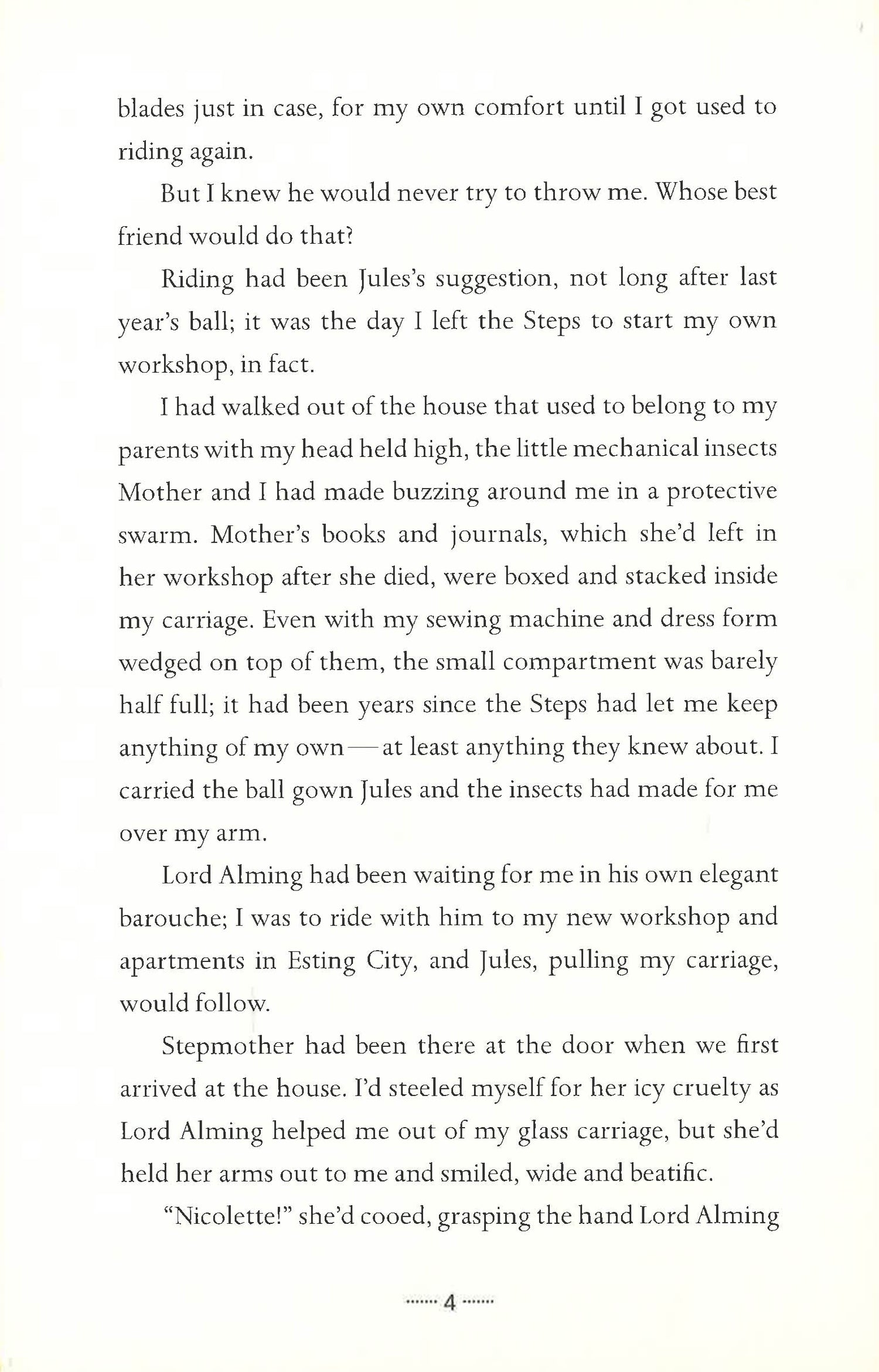 The young inventor Nicolette Lampton is living her own fairy-tale happy ending. She's free of her horrible stepfamily, running a successful business, and is uninterested in marrying the handsome prince, Fin. Instead, she, Fin, and their friend Caro venture to the lush land of Faerie, where they seek to put an end to the bloody war their kingdom is waging. Mechanical armies and dark magic await them as they uncover devastating secrets about the past and fight for a real, lasting happily-ever-after for two troubled countries--and for themselves. Smart and unconventional, this novel will appeal to readers of romance and adventure alike.