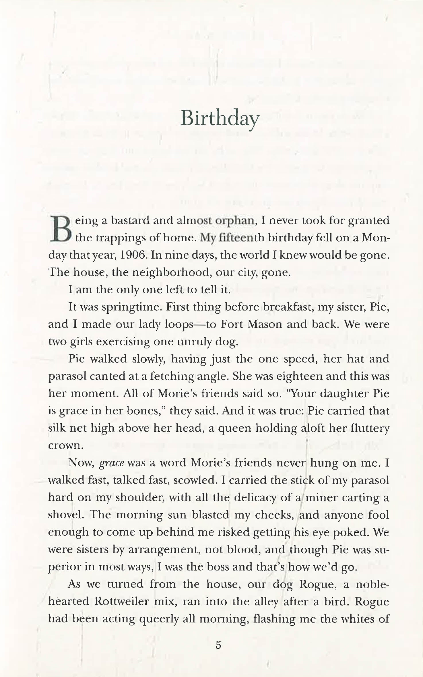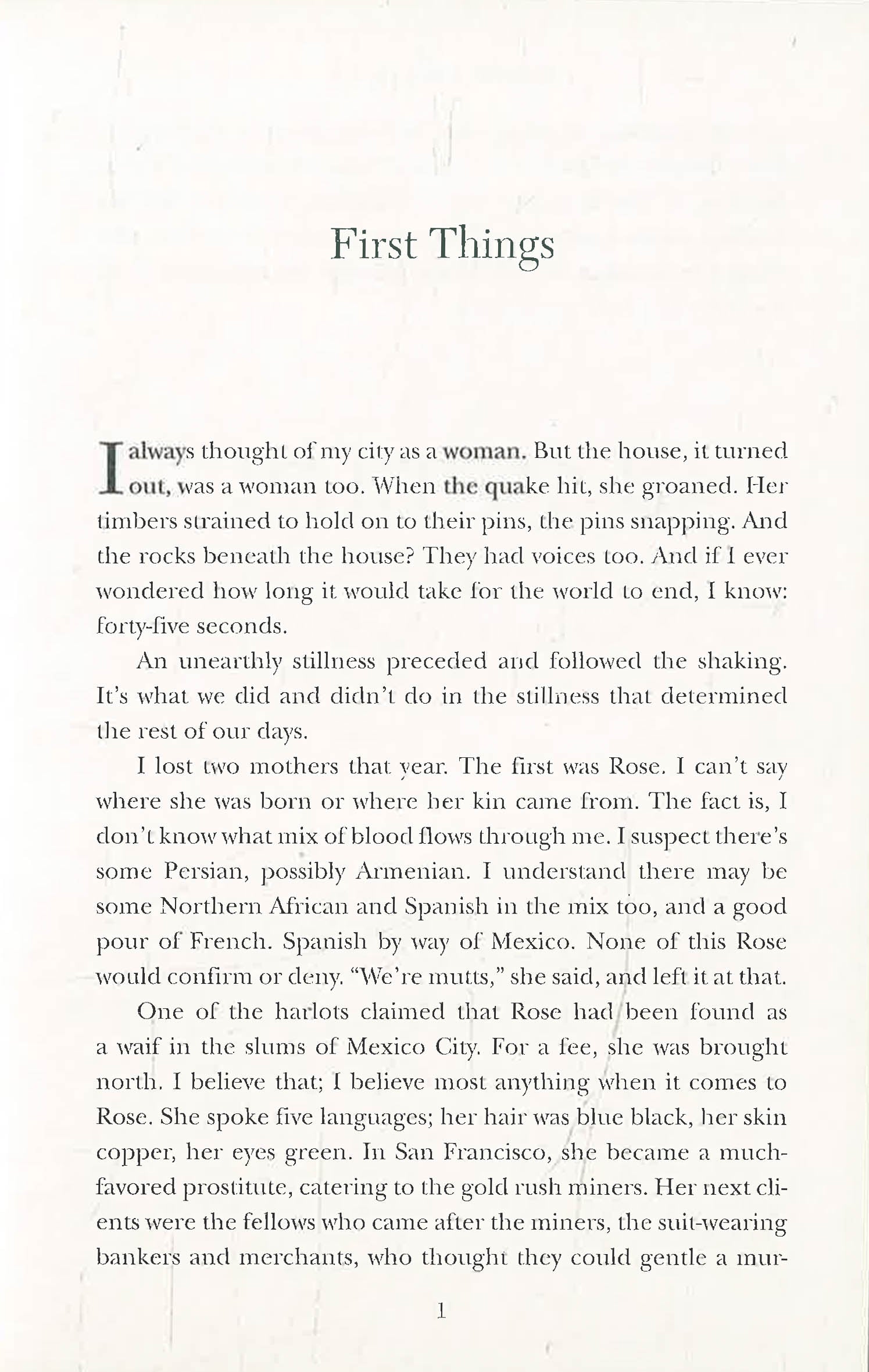 On the morning of the great quake, Vera’s worlds collide. As the city burns and looters vie with the injured, orphaned, and starving, Vera and her guileless sister, Pie, are cast adrift. Disregarding societal norms and prejudices, Vera begins to imagine a new kind of life. She collaborates with Tan, her former rival, and forges an unlikely family of survivors, navigating through the disaster together.
