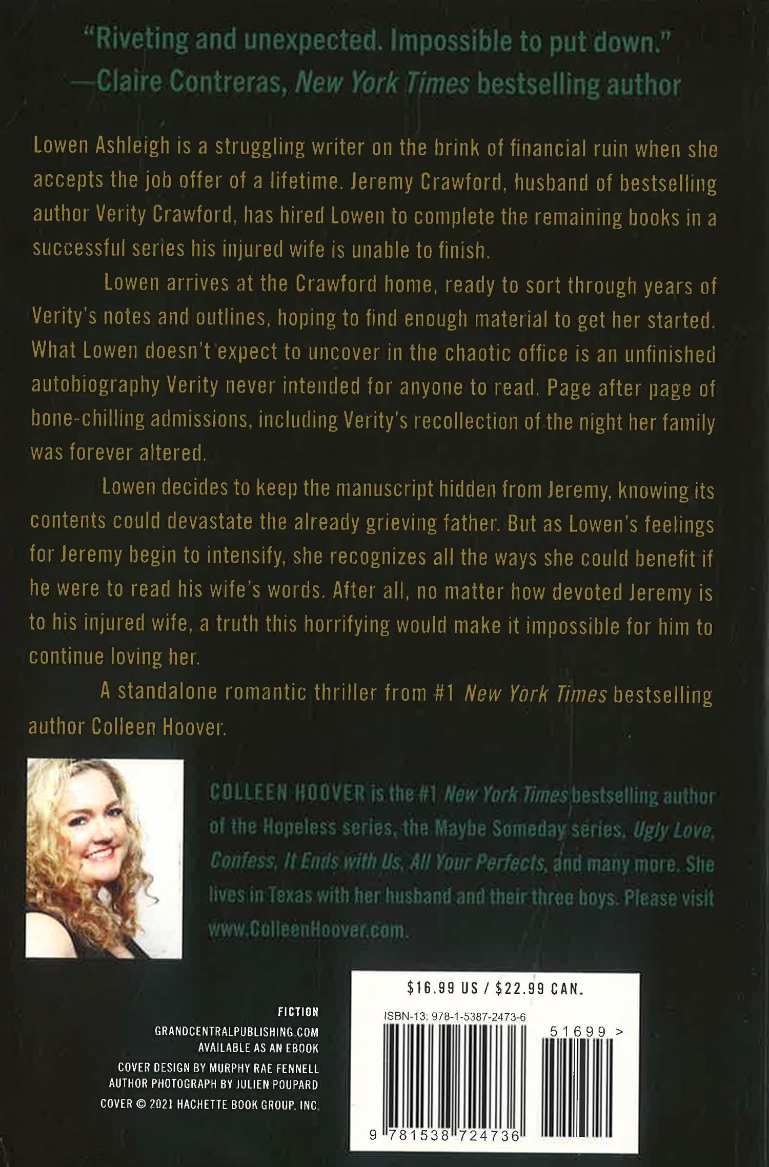 Lowen arrives at the Crawford home, ready to sort through years of Verity's notes and outlines, hoping to find enough material to get her started. What Lowen doesn't expect to uncover in the chaotic office is an unfinished autobiography Verity never intended for anyone to read. Page after page of bone-chilling admissions, including Verity's recollection of the night her family was forever altered.