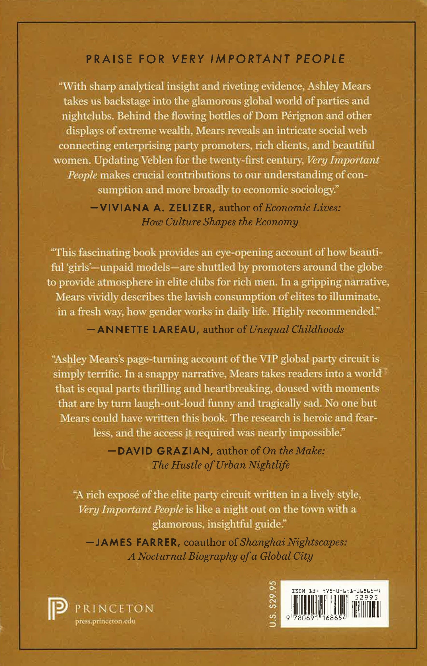 Million-dollar birthday parties, megayachts on the French Riviera, and $40,000 bottles of champagne. In today's New Gilded Age, the world's moneyed classes have taken conspicuous consumption to new extremes. In Very Important People, sociologist, author, and former fashion model Ashley Mears takes readers inside the exclusive global nightclub and party circuit-from New York City and the Hamptons to Miami and Saint-Tropez-to reveal the intricate economy of beauty, status, and money that lies behind these spectacular displays of wealth and leisure.