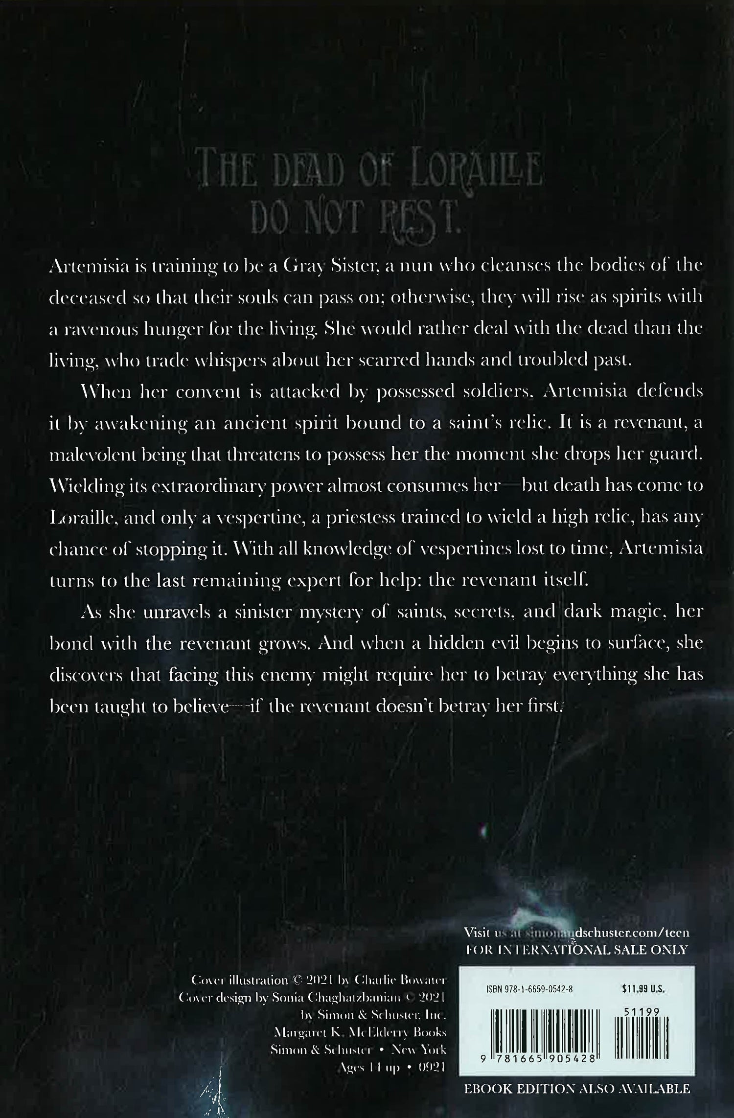 When her convent is attacked by possessed soldiers, Artemisia fights back by awakening an ancient spirit bound to a high saint’s relic. It is a revenant, a malevolent being now whispering in her head. Wielding its extraordinary power almost consumes her in body and soul. But death has come to Loraille, and only a vespertine, a priestess trained to wield a high relic, has a chance of stopping it. Yet the age of vespertines has passed, their knowledge and training lost with time.