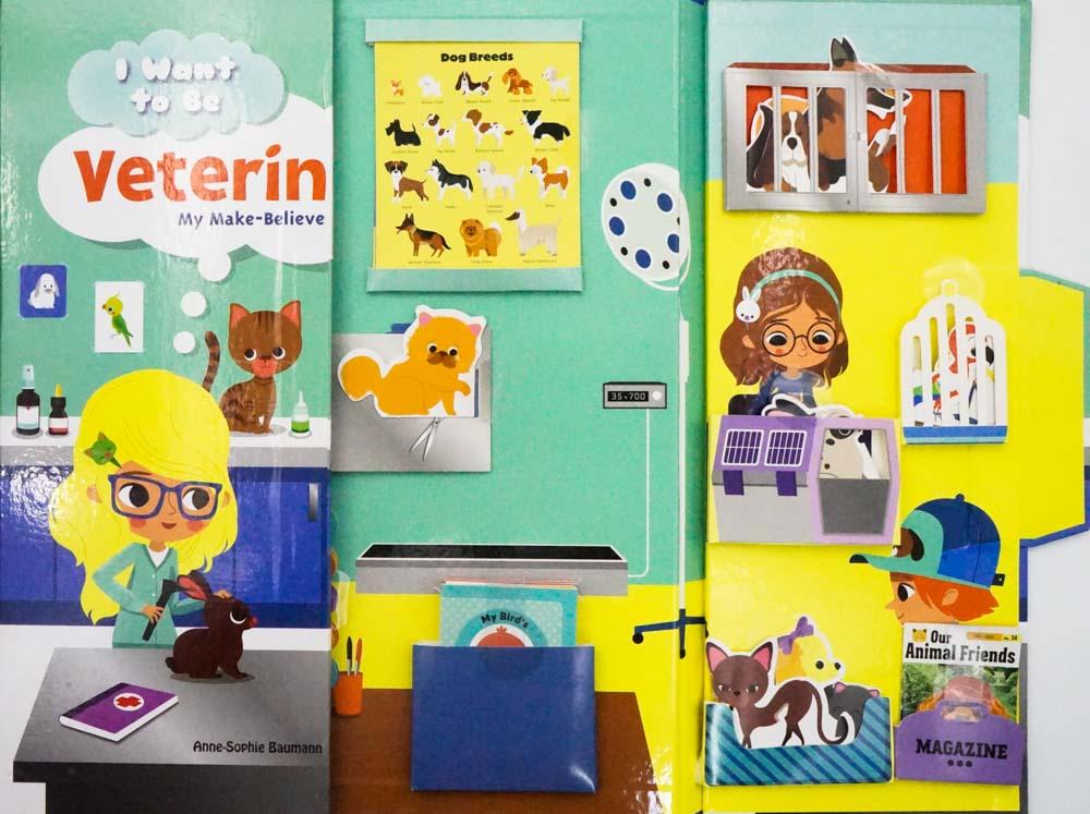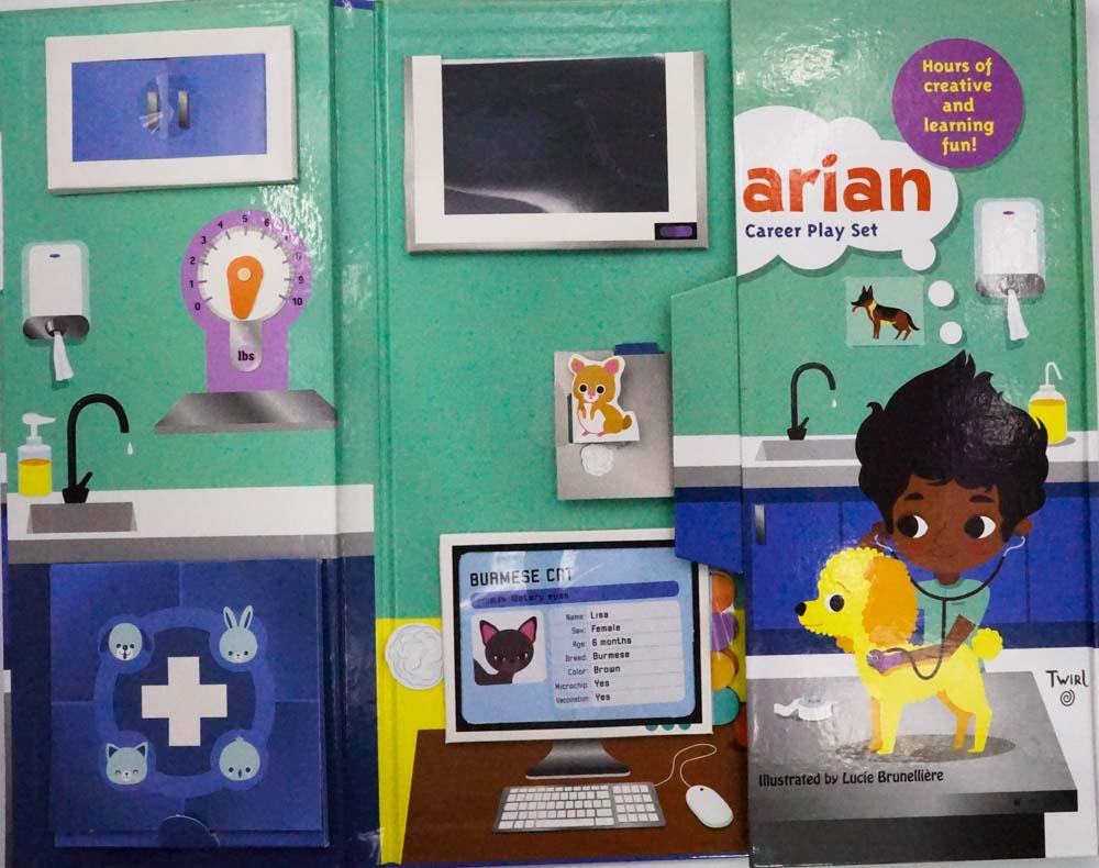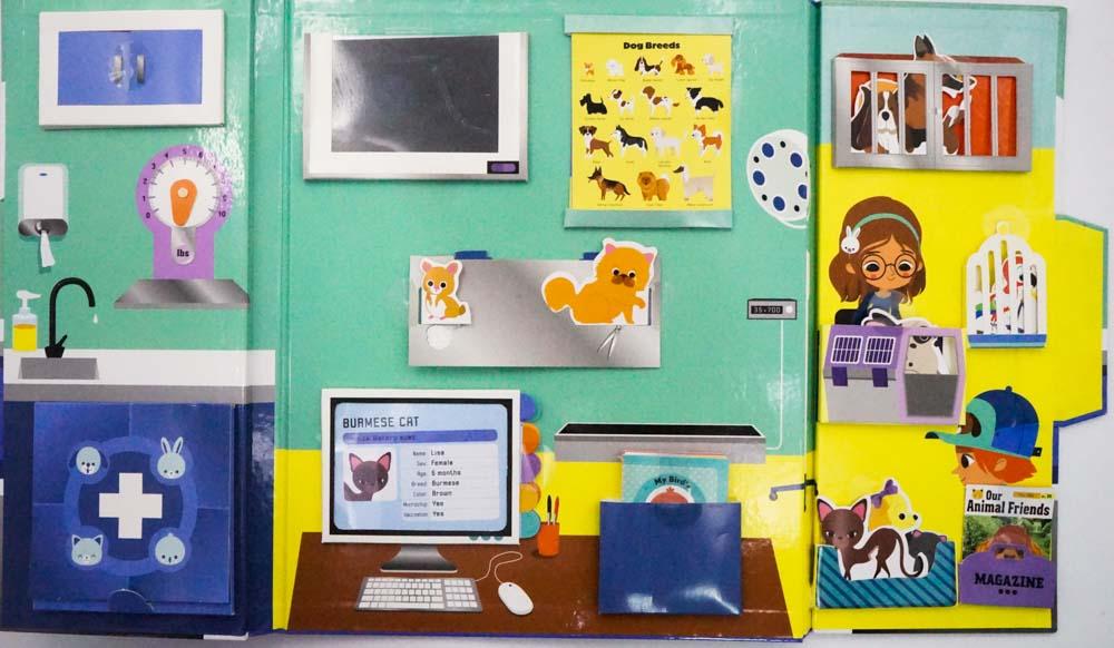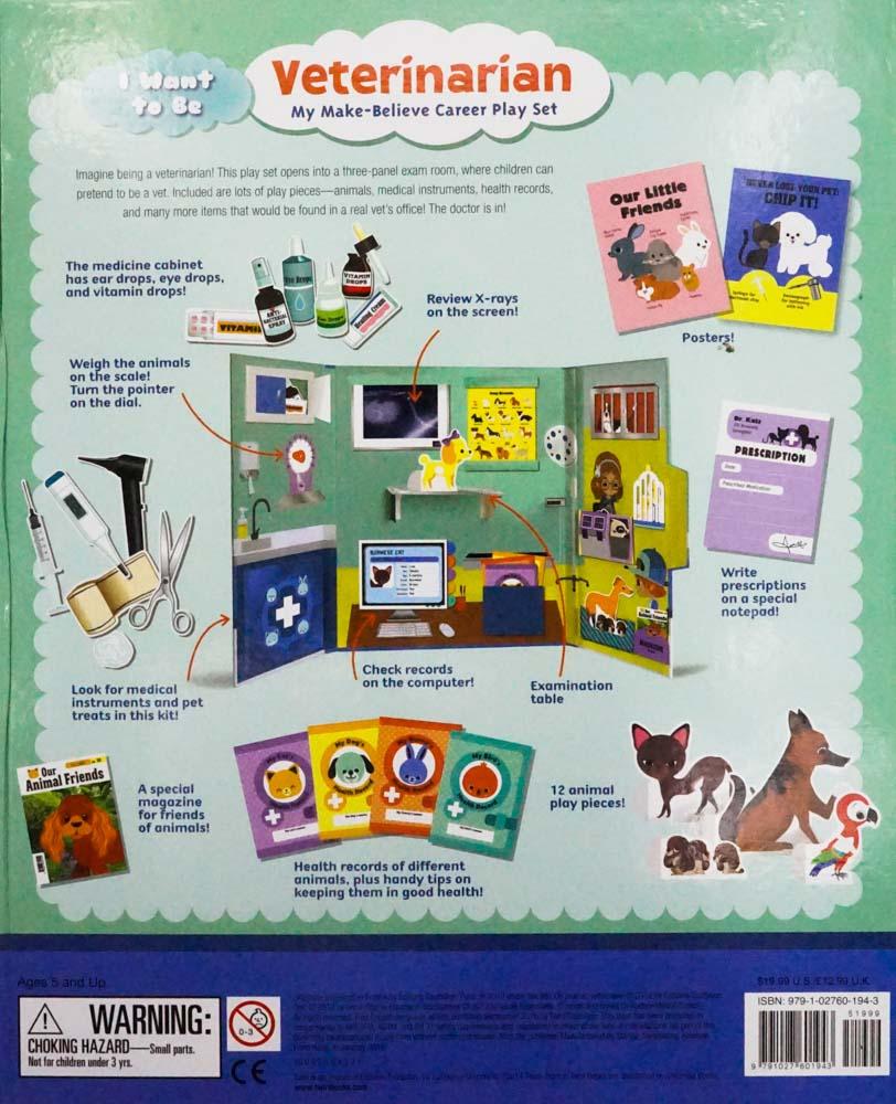 What child hasn't considered becoming a vet? This play set allows young animal lovers to realize a dream come true by practicing taking care of animals. Upon opening the book, children will delight in discovering that the three-panel stand is a veterinarian's exam room. They can play pretend with dog, cat, rabbit, and bird figures by weighing them on a scale, examining them on the exam tables, checking their health records on the computer, and giving them treats. Handy pockets on the panels allow pieces to be easily stored so they can be used again.