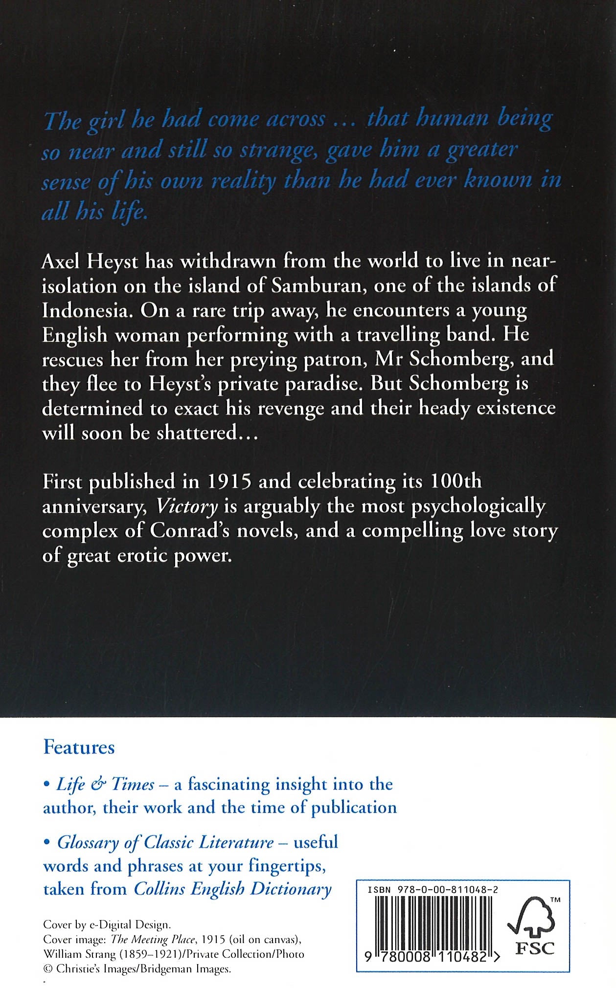 HarperCollins is proud to present its incredible range of best-loved, essential classics.HarperCollins is proud to present its incredible range of best-loved, essential classics. 'The girl he had come across ... that human being so near and still so strange, gave him a greater sense of his own reality than he had ever known in all his life.' Damaged by his father's nihilistic philosophy, Axel Heyst has withdrawn from the world to live in near-isolation on the island of Samburan. His solitude ends when he rescues an English girl from her preying patron, but their heady existence will face tragic consequences when the outside world intrudes once more. First published in 1915, 'Victory' is arguably the most psychologically complex of Conrad's novels, in which he creates an extraordinarily compelling love story and one of great erotic power: Axel and Lena are what set this novel apart from the other works of one of English language's greatest writers. This Collins Classics edition is published to coincide with the 100th anniversary of this remarkable novel.Polish-born Joseph Conrad is regarded as a highly influential author and his works are seen as a precursor to modernist literature. His often tragic insight into the human condition in novels such as Heart of Darkness and The Secret Agent is unrivalled by his contemporaries.